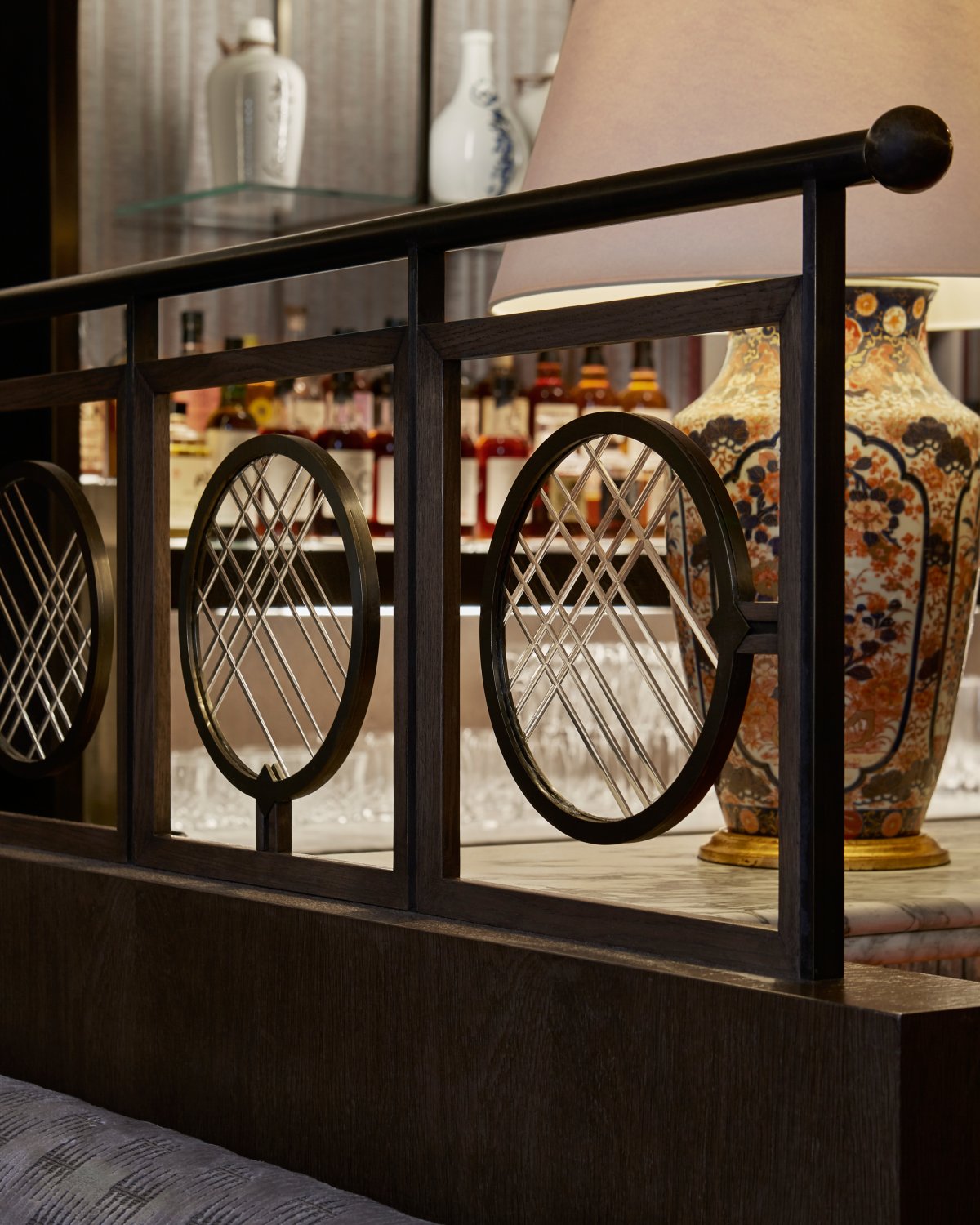 The interiors are in a Kinsugi palette of yellow, gold, ombre indigo and currant seen throughout Japanese historical woodblock and screen prints.Table bases profile take after the geometry of slender Meiji-period vases whilst Arita porcelain inspire hand painted Japanese floral motifs in the underside of decorative pendants and sake taps.