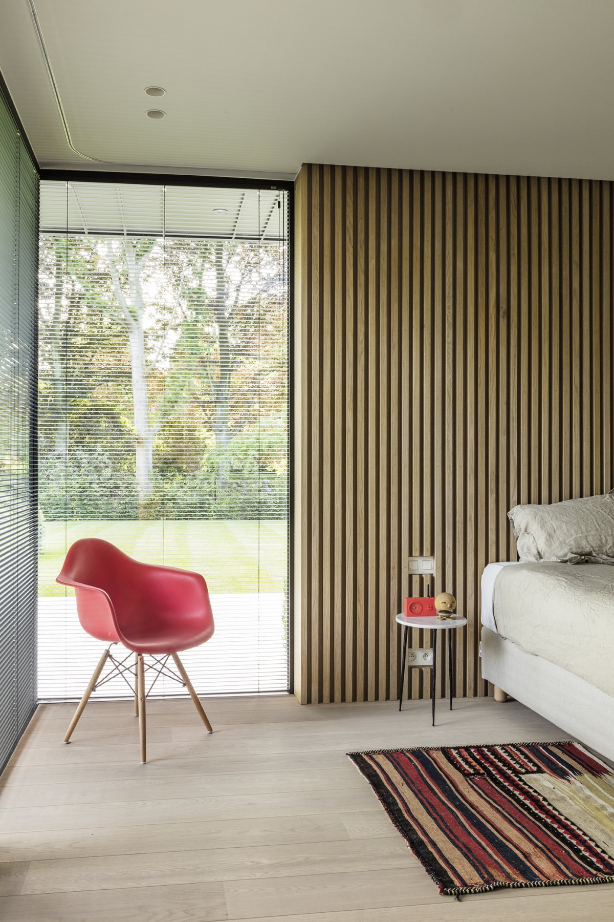 The plot has a large, beautiful front garden, in which Juma introduced a garden wall to create a separation from the driveway and the entrance zone. By placing an identical large window opening in both the front facade and the rear facade, a visual connection is created between the greenery in the front and the back of the house. This makes for a very open living space, in which one feels as it were enveloped by the exuberant surrounding greenery. Exterior becomes interior.