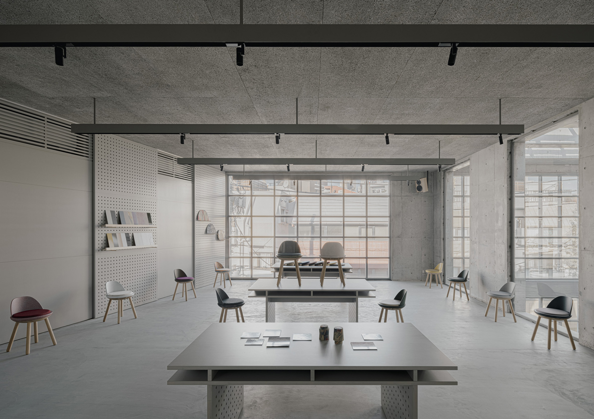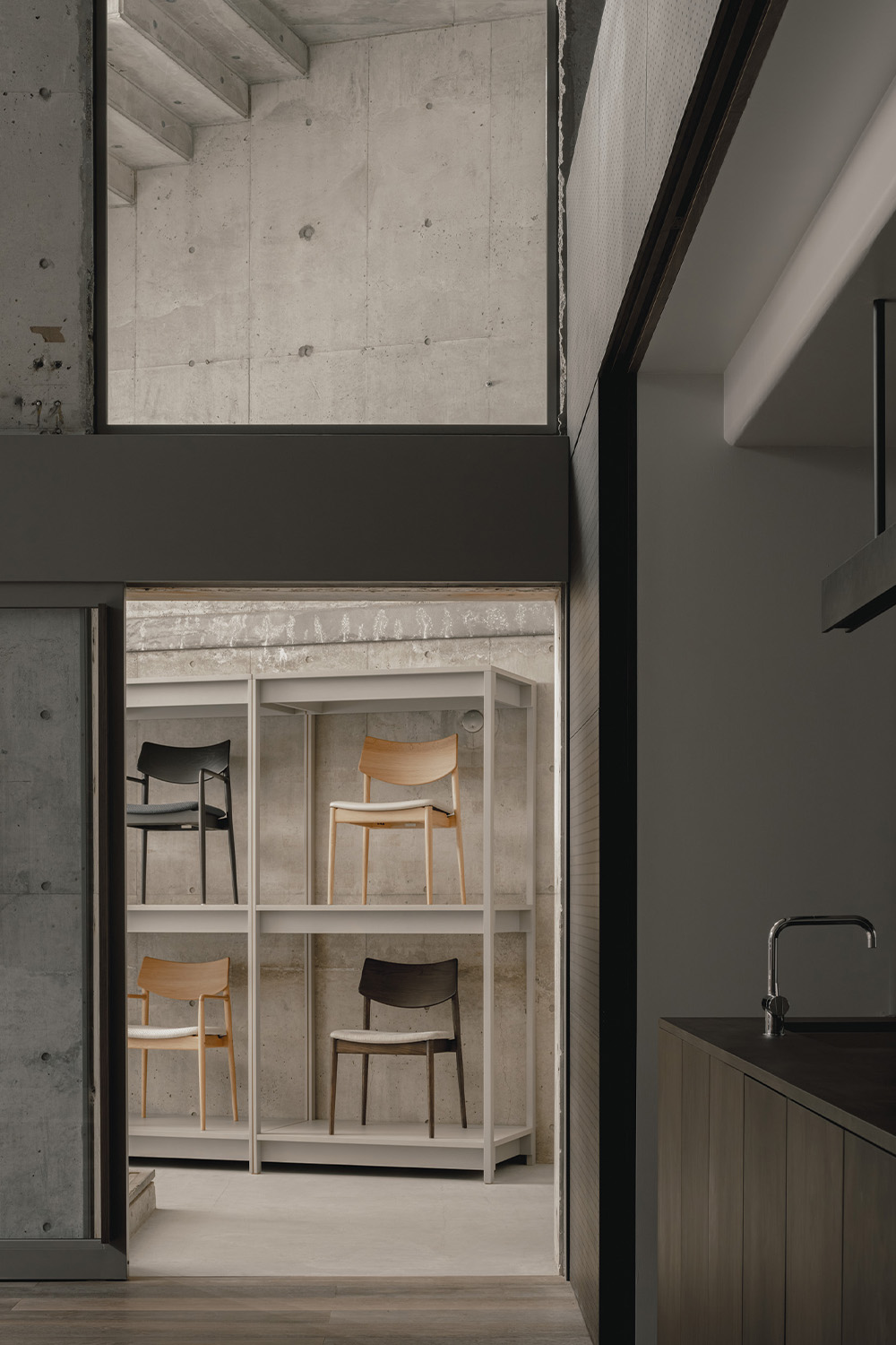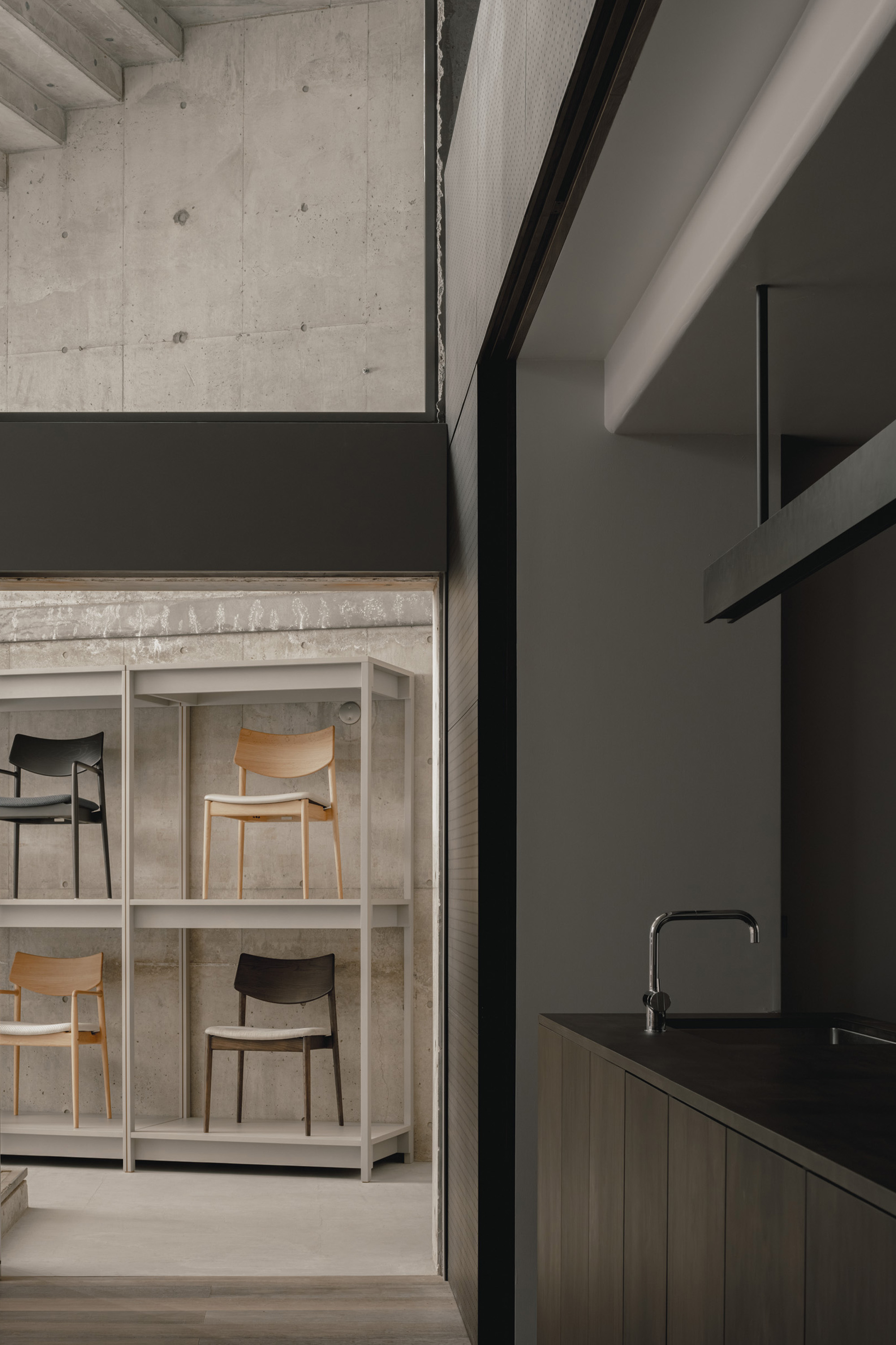Originally built in 1990, the concrete building underwent a transformative renovation to bring Karimoku's vision to life. Non-structural elements like window frames and staircase railings were stripped away, revealing the core framework of the building. The space was meticulously reimagined, incorporating gray-tinted and clear glass, simple and sleek steel railings and frames, a modern lighting system, and elegant wooden accents crafted by Karimoku. The result is a contemporary space where the enduring rawness of the original structure seamlessly integrates with the refined elegance of the newly introduced elements.