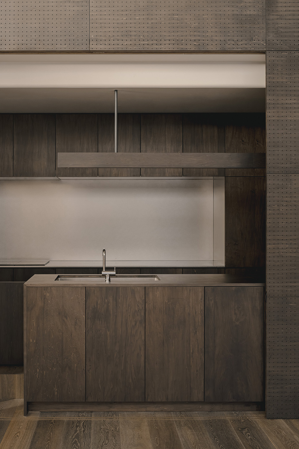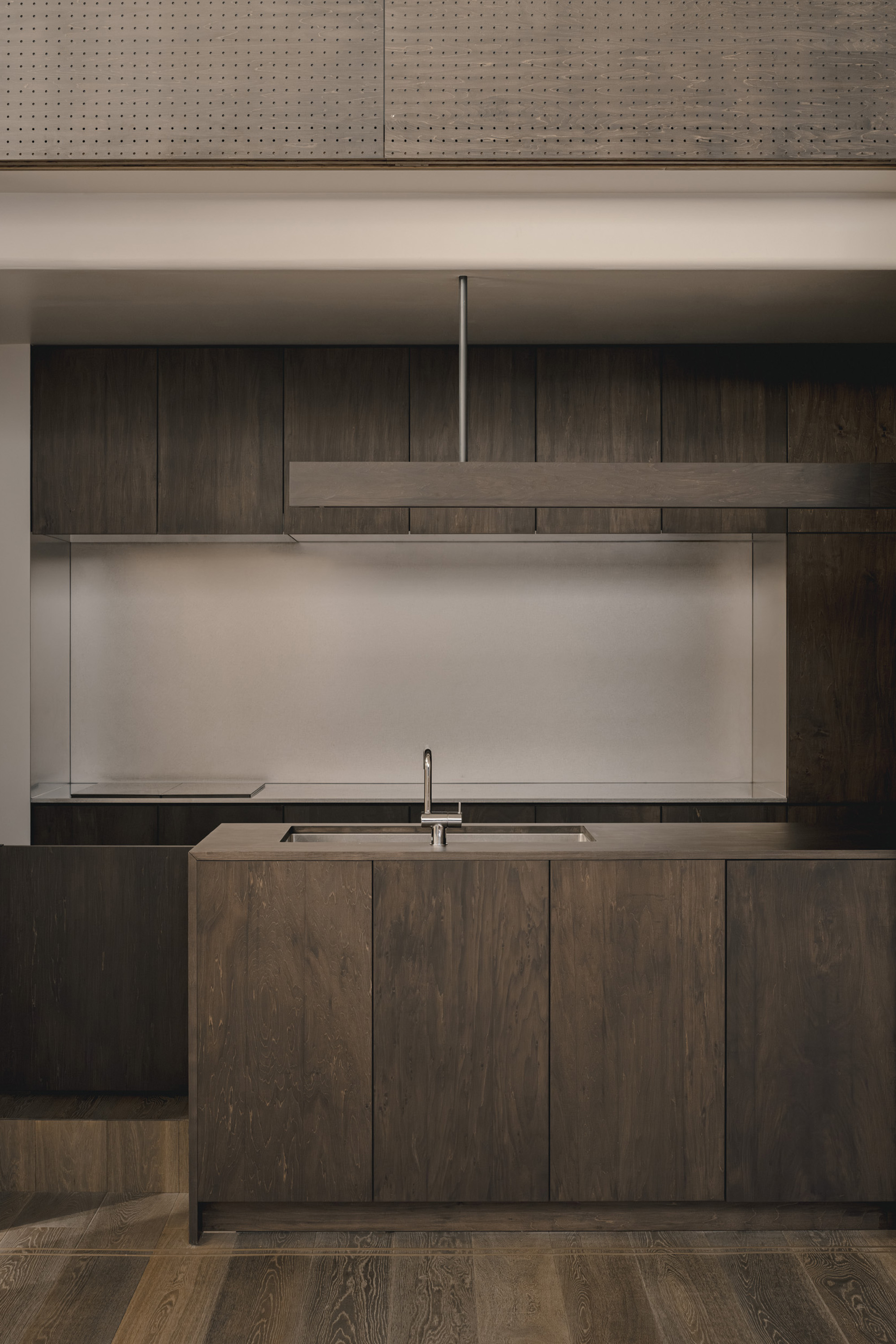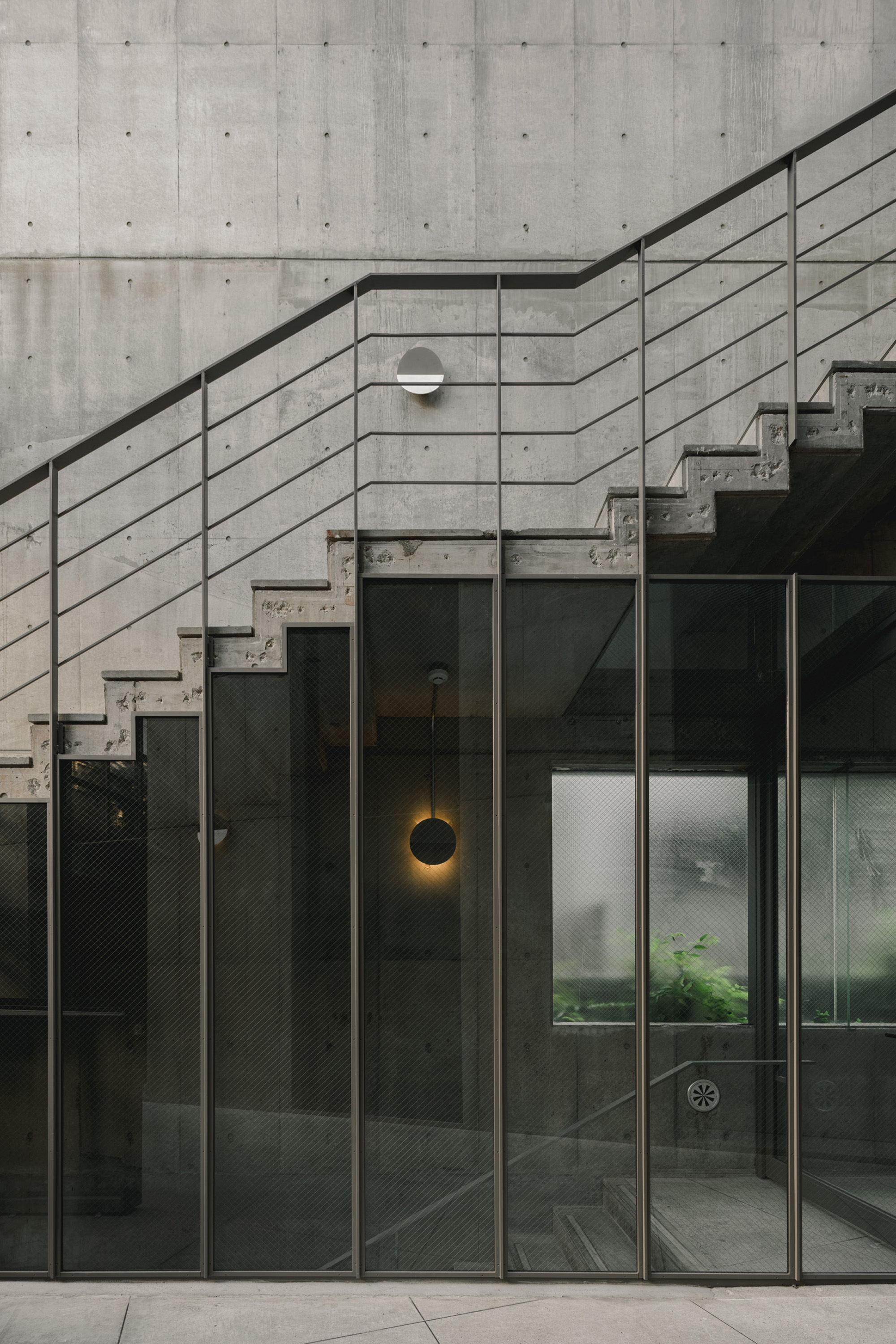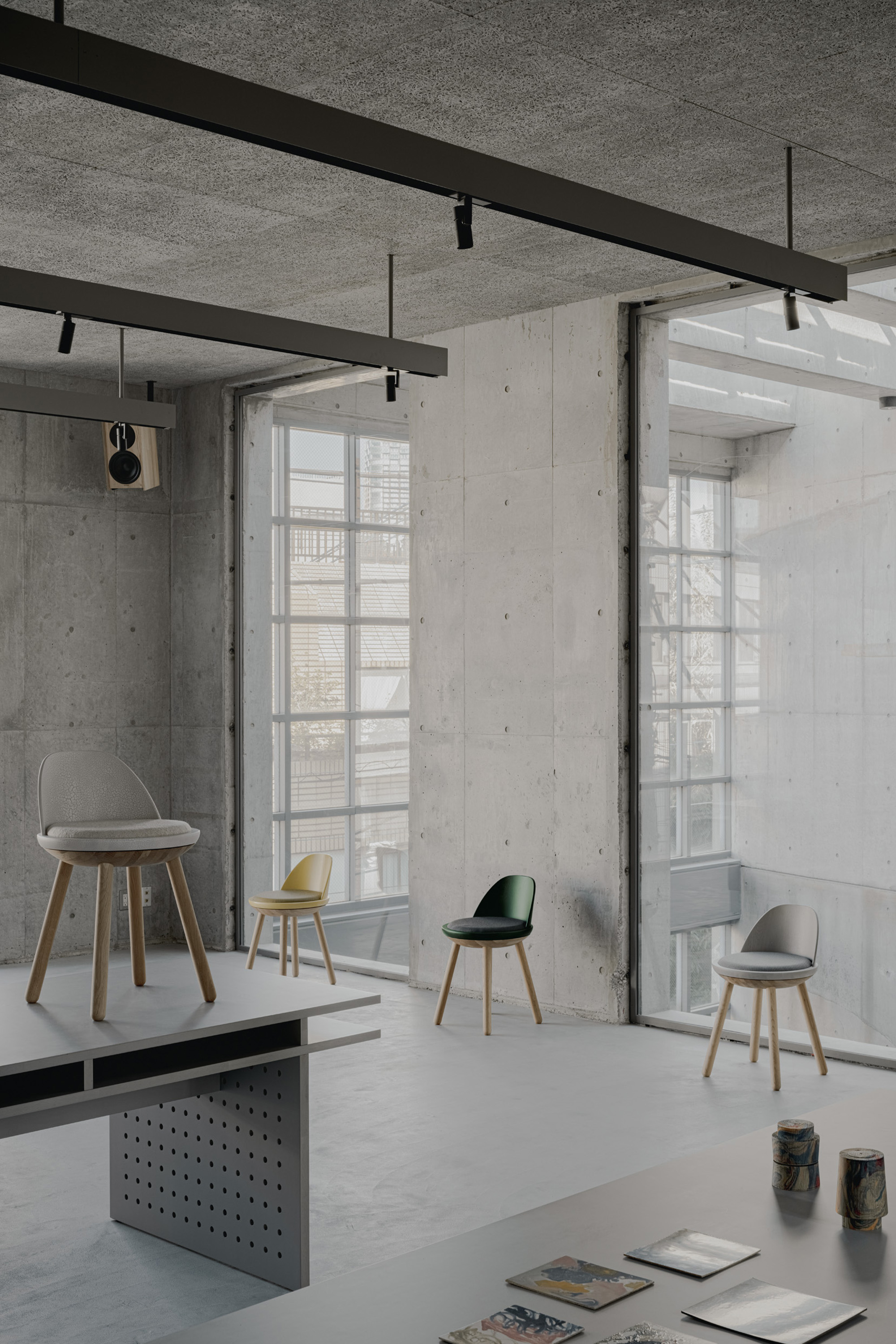 Originally built in 1990, the concrete building underwent a transformative renovation to bring Karimoku's vision to life. Non-structural elements like window frames and staircase railings were stripped away, revealing the core framework of the building. The space was meticulously reimagined, incorporating gray-tinted and clear glass, simple and sleek steel railings and frames, a modern lighting system, and elegant wooden accents crafted by Karimoku. The result is a contemporary space where the enduring rawness of the original structure seamlessly integrates with the refined elegance of the newly introduced elements.