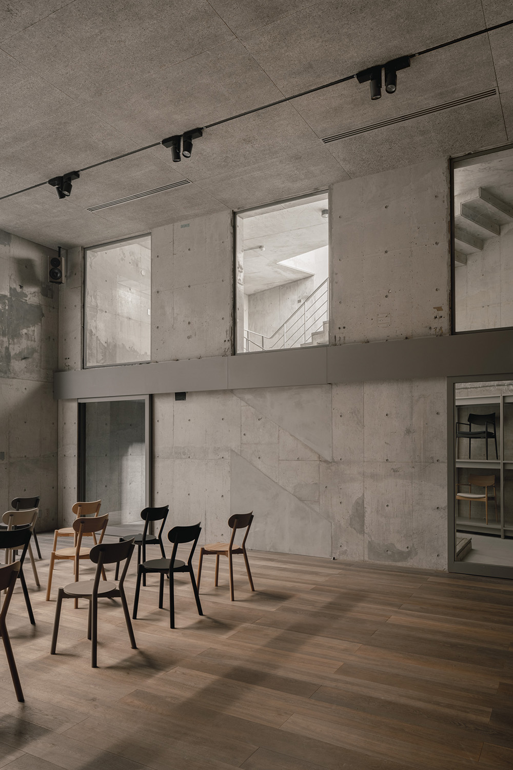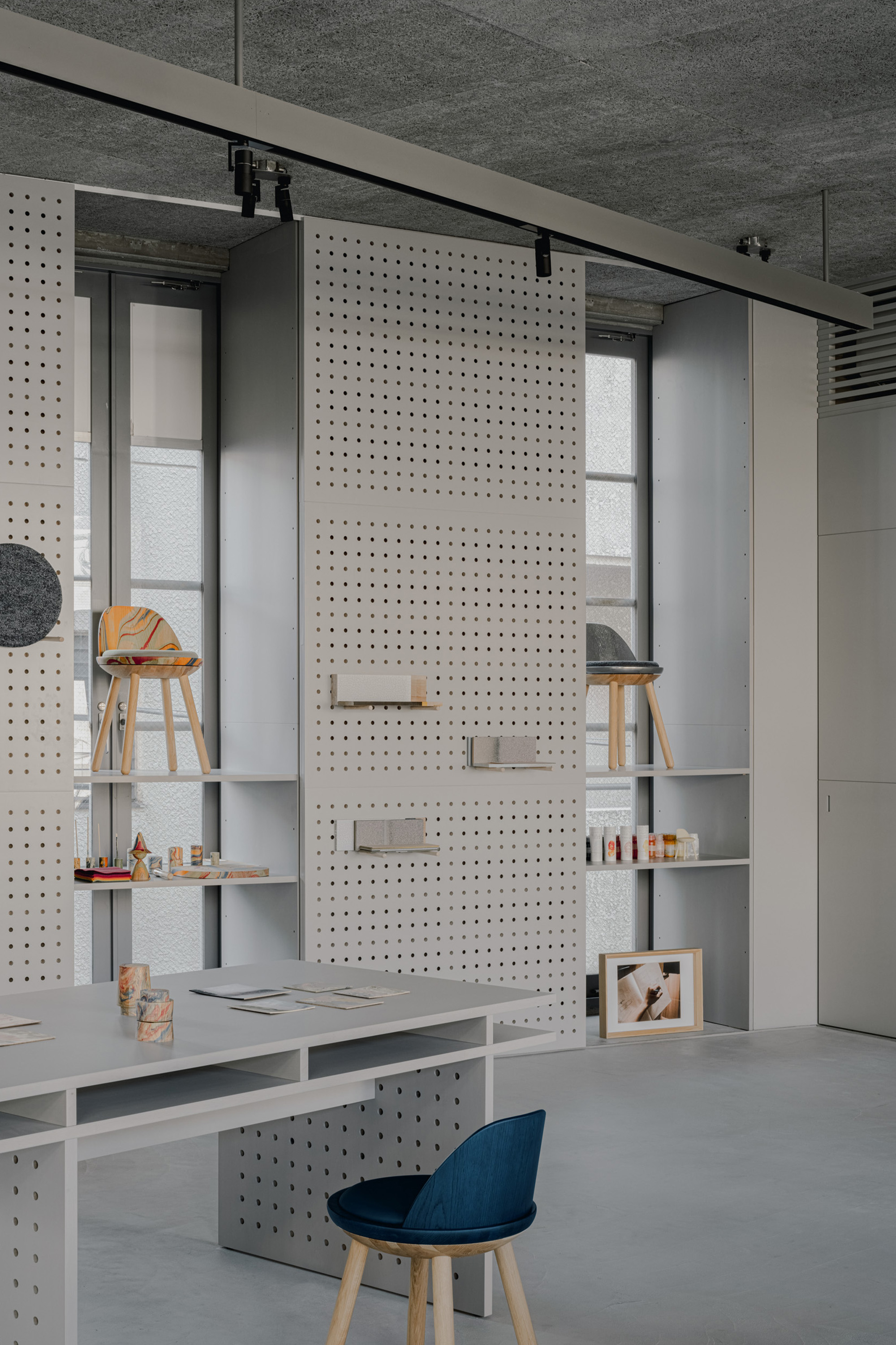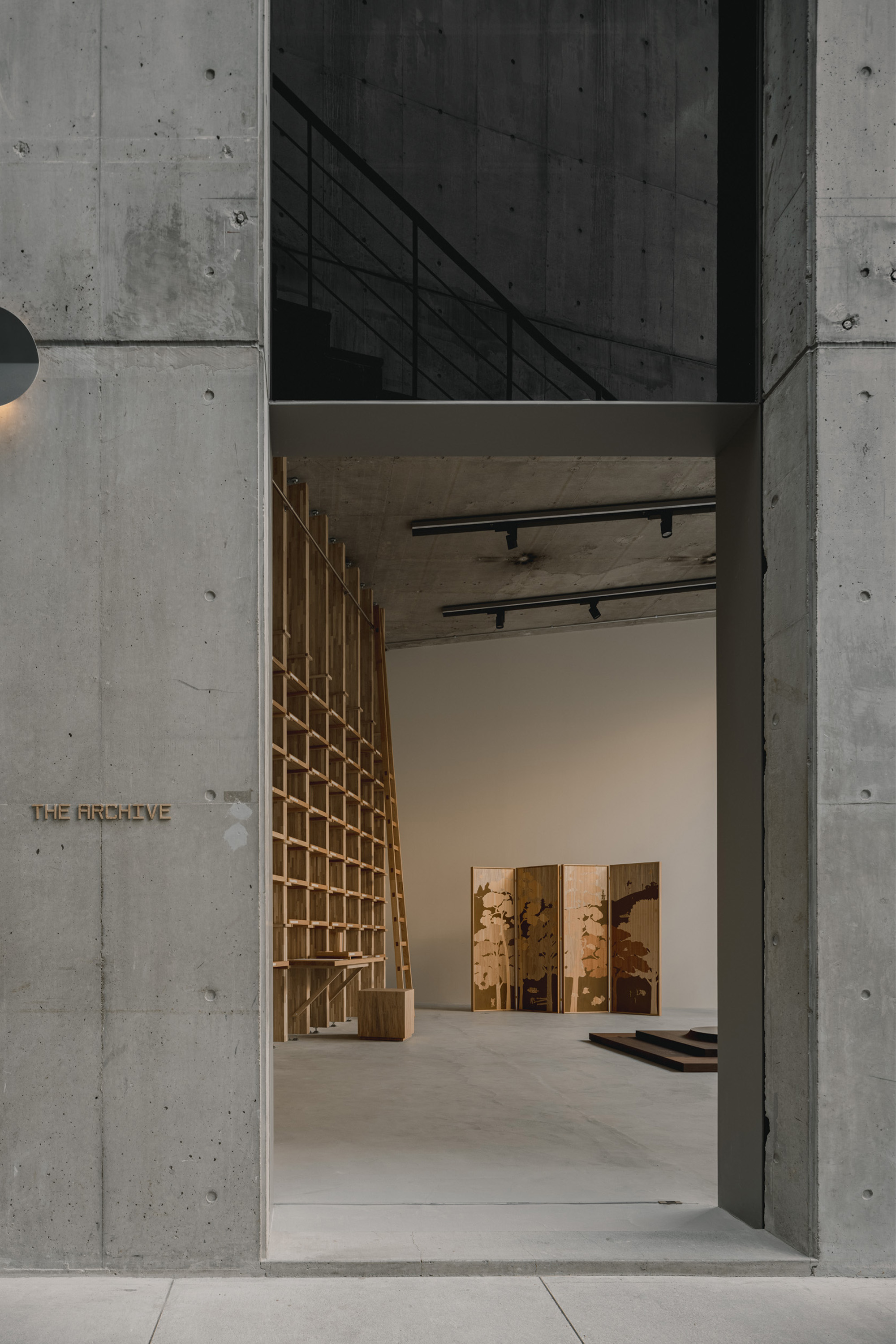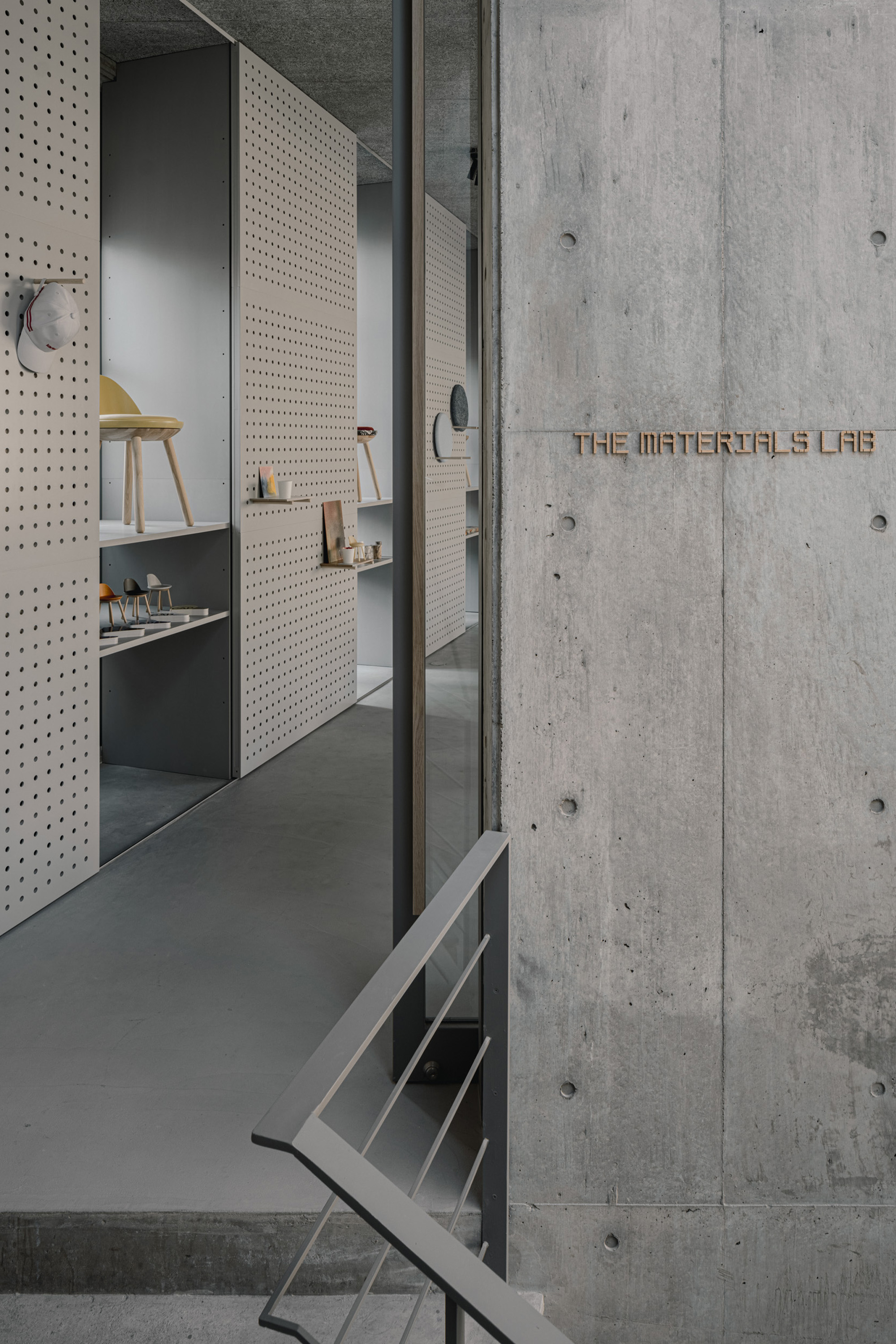 Designed as a hub for innovation, the building features a multi-purpose space (THE STUDY) on the basement floor, a gallery (THE ARCHIVE) on the first floor, and a library (THE MATERIAL LAB) on the second floor. These areas are interconnected through a dynamic open atrium.