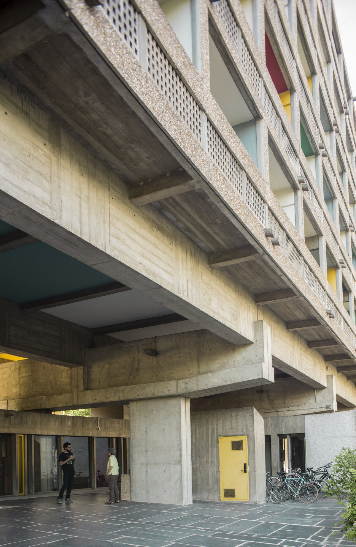 Like Le Corbusier's Swiss Pavilion (1932), the building is a five-storey concrete volume, elevated above the ground and also made of concrete. Below this volume is an irregular first floor, with administrative Spaces to the west and public Spaces to the east, such as library, theatre, exhibition space and party space. The wings are connected under the building by a curved passage, with the interior as an intermediate space and the exterior as the boundary of the outdoor arcade.