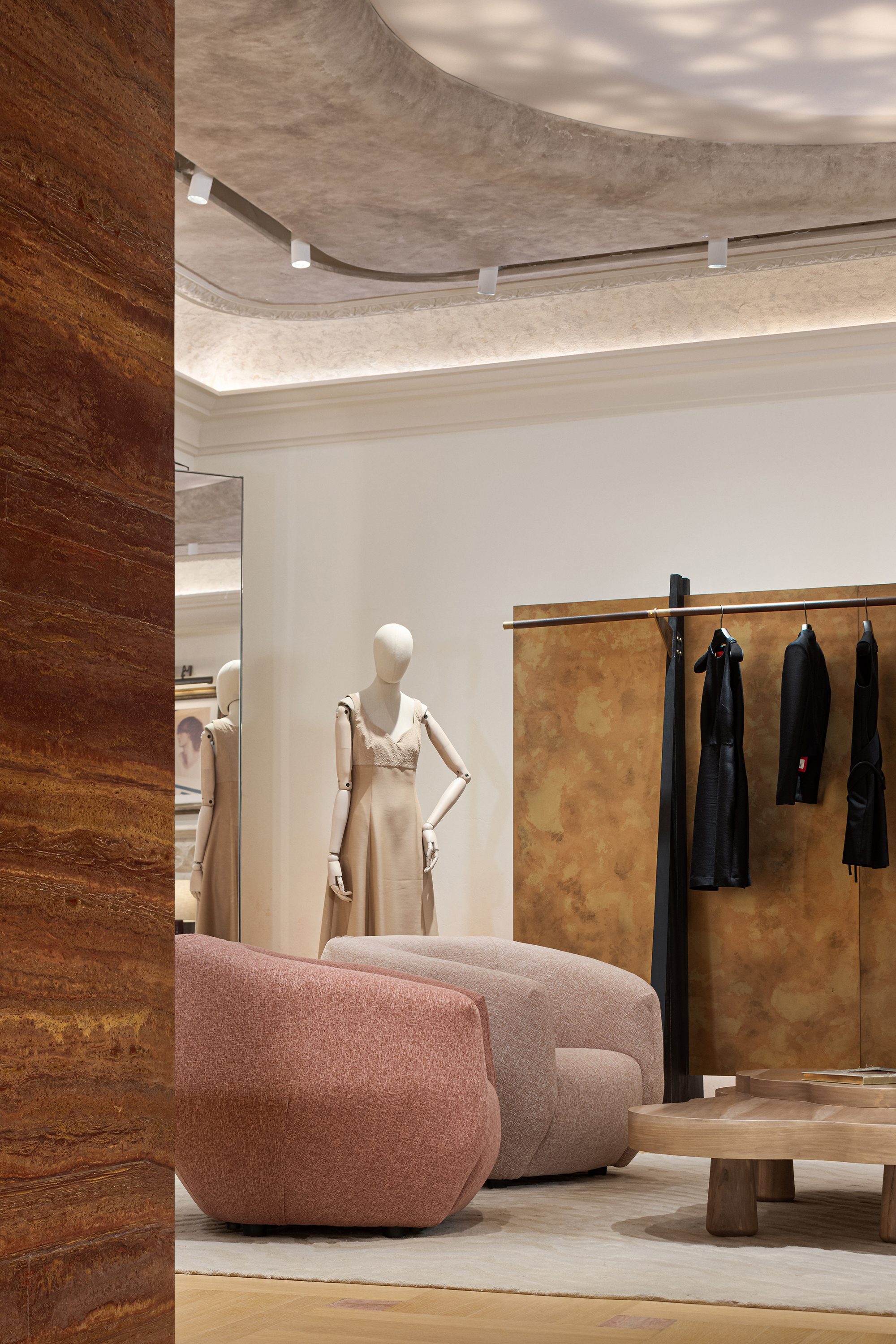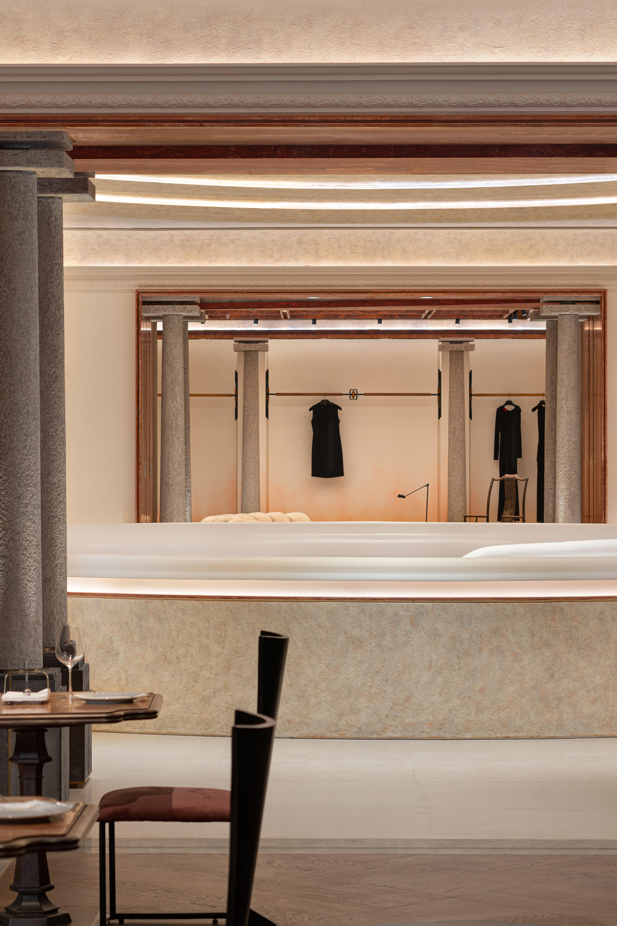 Additionally, delving into Milan’s urban memory, the city is renowned for its profound historic architectural heritage, where history and contemporary art coexist. This interplay inspires our innovative exploration of spatial structures to recreate the aesthetic essence of Milanese street, while the craftsmanship philosophy of “Made in Italy” – particularly the interplay of material textures and meticulous detailing – breathes soul into our designs. We aim to interpret the narrative essence of space and the localization of brand presence through architectural art as an emotional medium, integrating contemporary and classical elements while harmonizing Eastern and Western aesthetics. This creative approach, themed around brand legacy, historical context, and operatic inspiration, seeks to evoke profound emotional resonance through spatial storytelling.