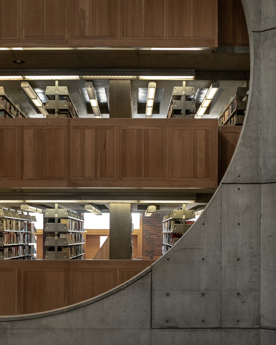 Kahn used Exeter brick on the exterior of the nine story building, a material made in Exeter itself and a design factor that was important to the Academy. He also used stone and slate in the interior, and finished certain aspects of the library in natural wood. The wood contrasted the stone by giving the spaces a sense of warmth and a glow that welcomed readers when the natural light flooded upon this natural material.