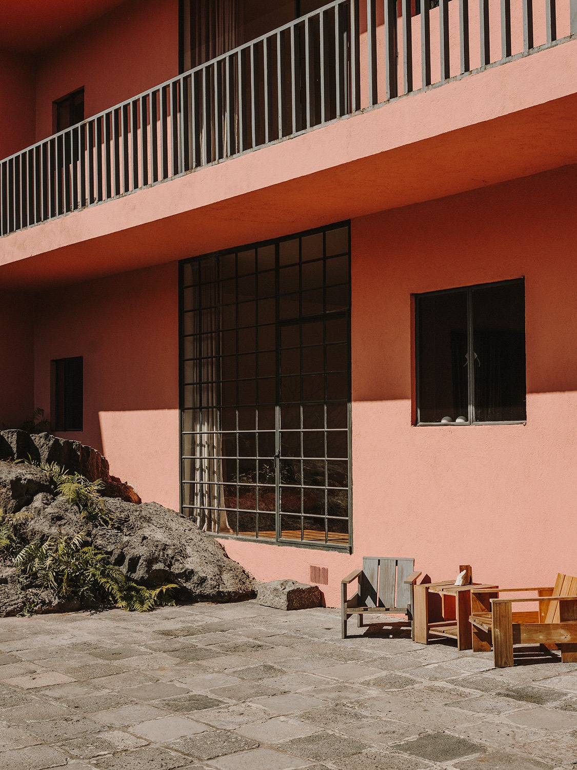 Throughout, the specific language of Barragán’s Mexican modernism moves from intelligences of form to the senses of eye and hand. Vision-absorptive planes of rose-pink stucco rise as backdrops to outcroppings of lava, ferns, cacti, and thistles originally left during foundation work. Inside, the palette slightly mutes to wall-fields of sienna or teal, cool greys and warm beiges.