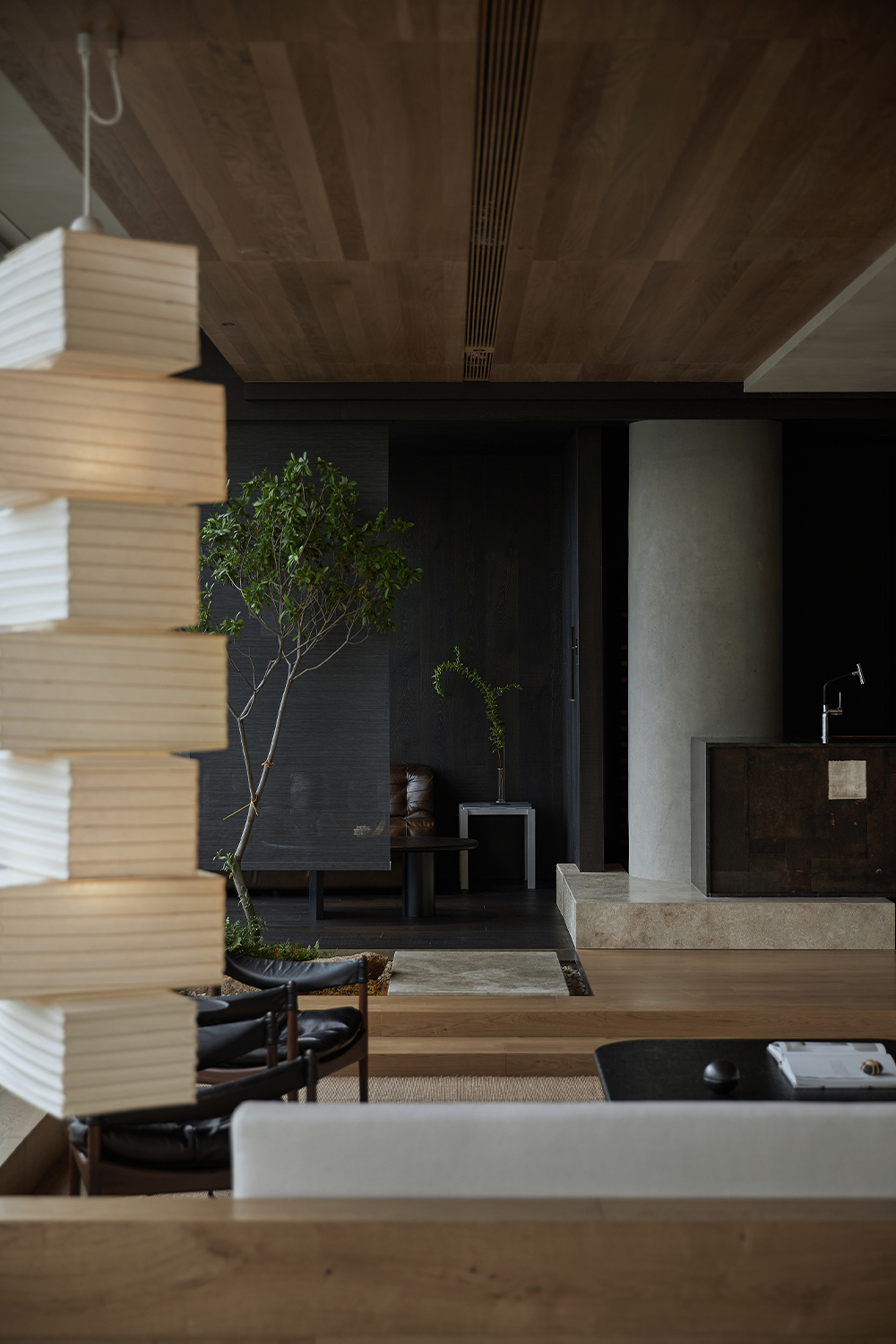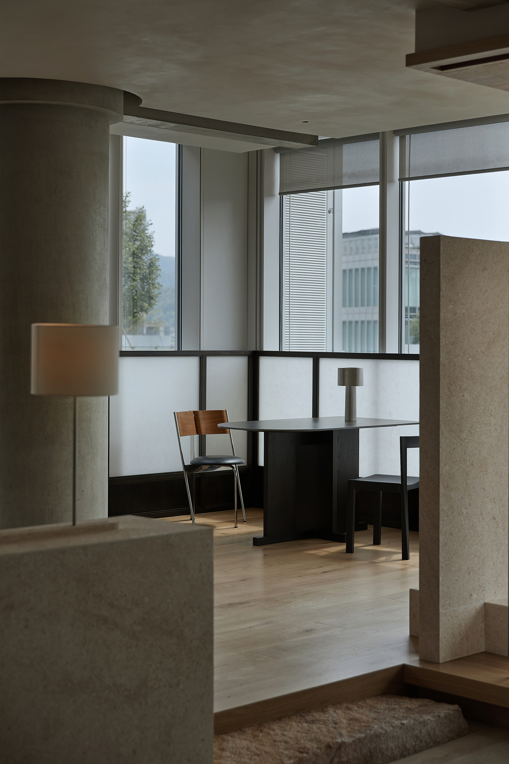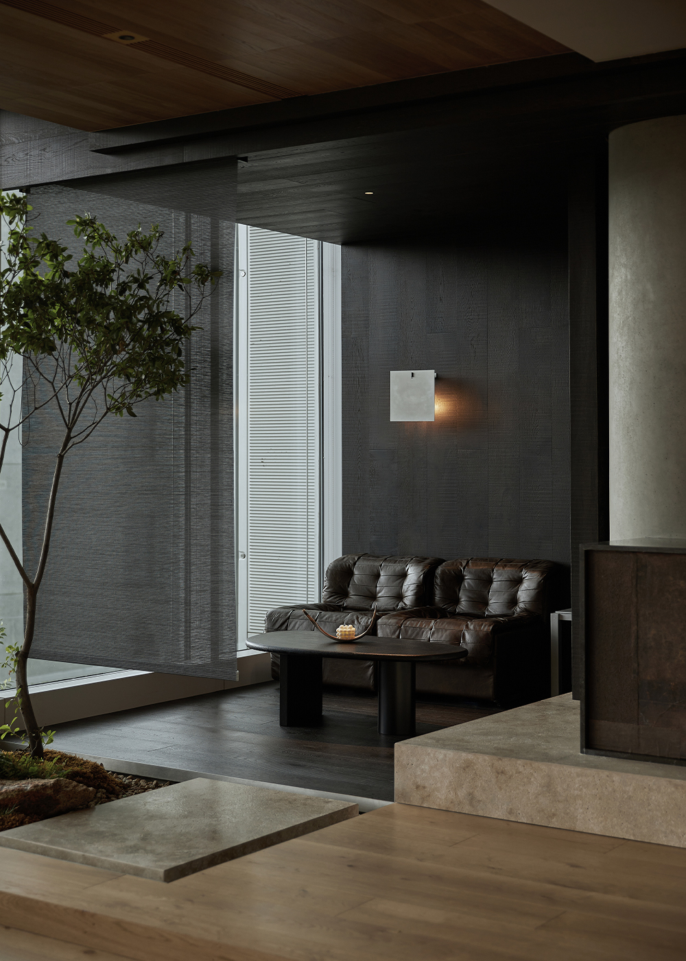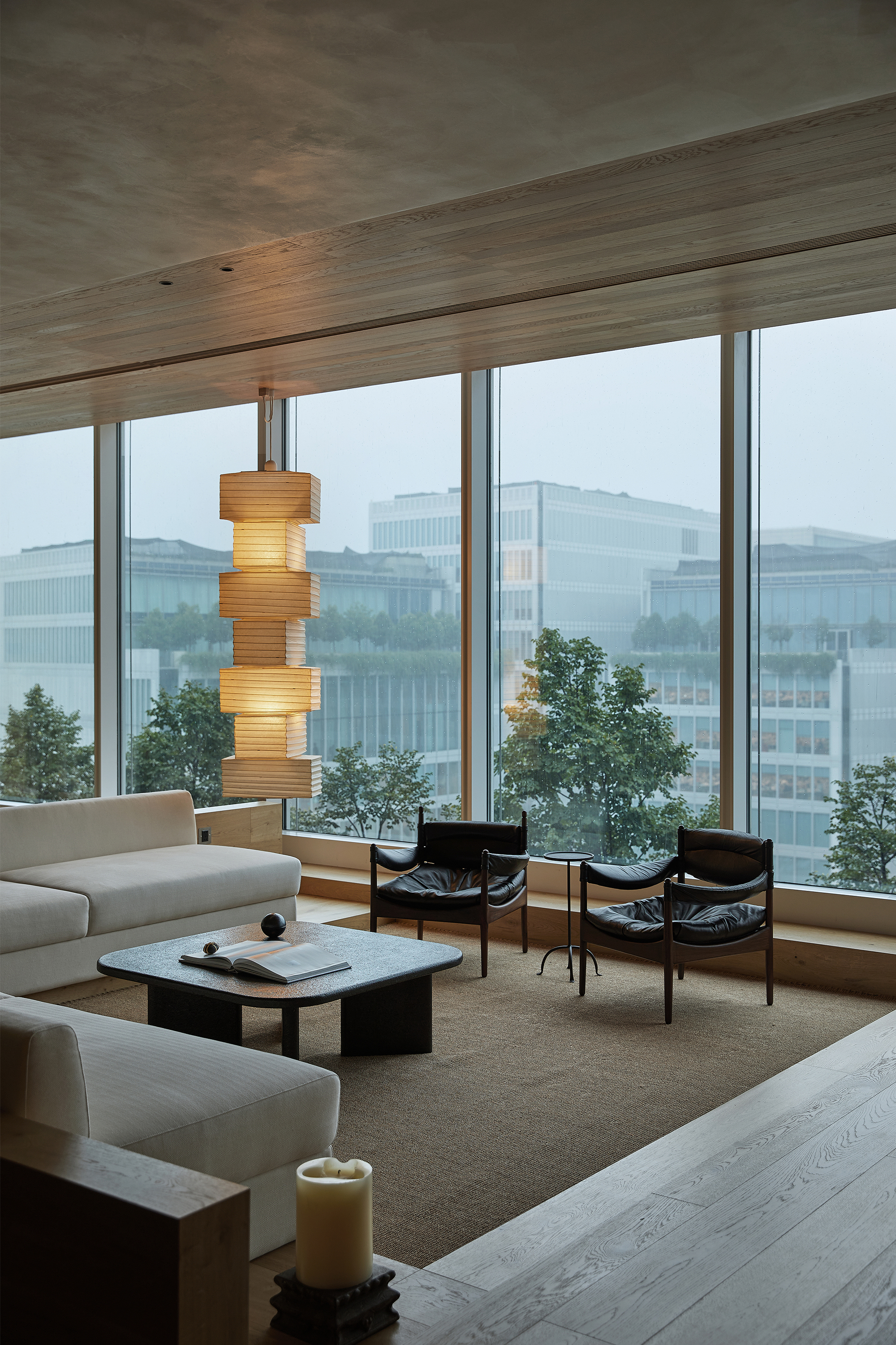 The elevated public area and the sunken negotiation area form a height difference, enclosing a scale similar to a family living room. People can sit here and have a conversation facing the landscape and nature. The height difference and layout of the space guide the natural occurrence of communication, making every conversation immersed in relax.