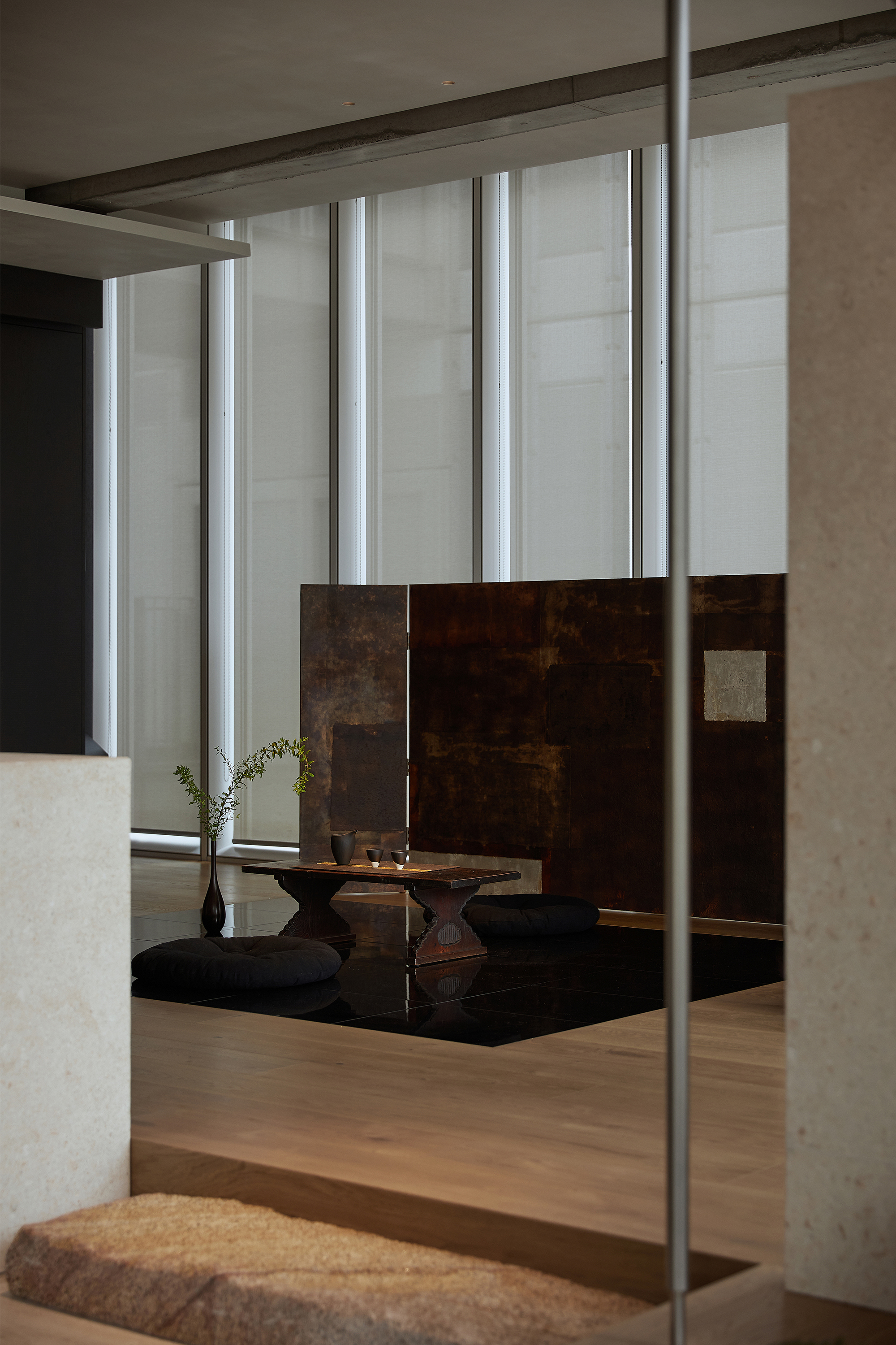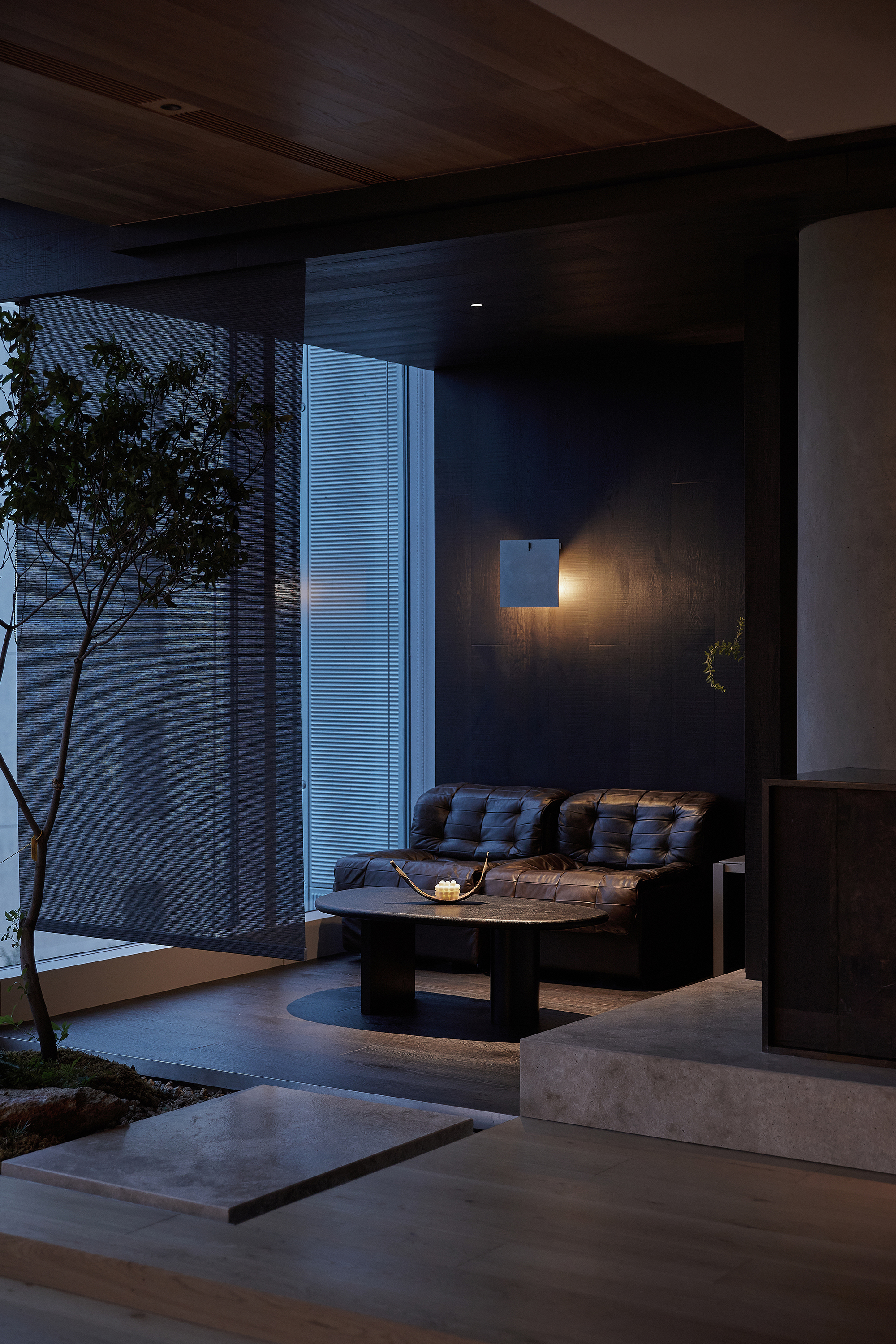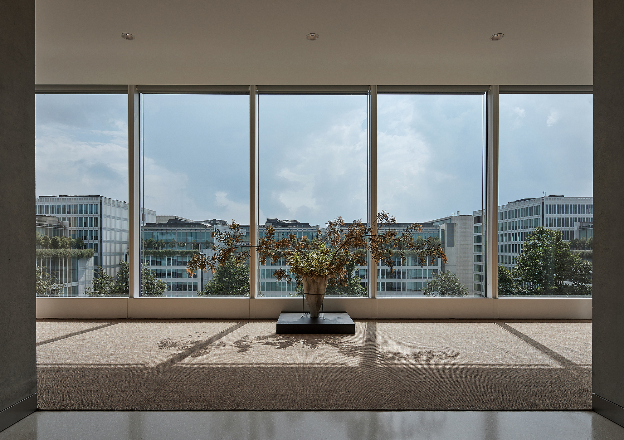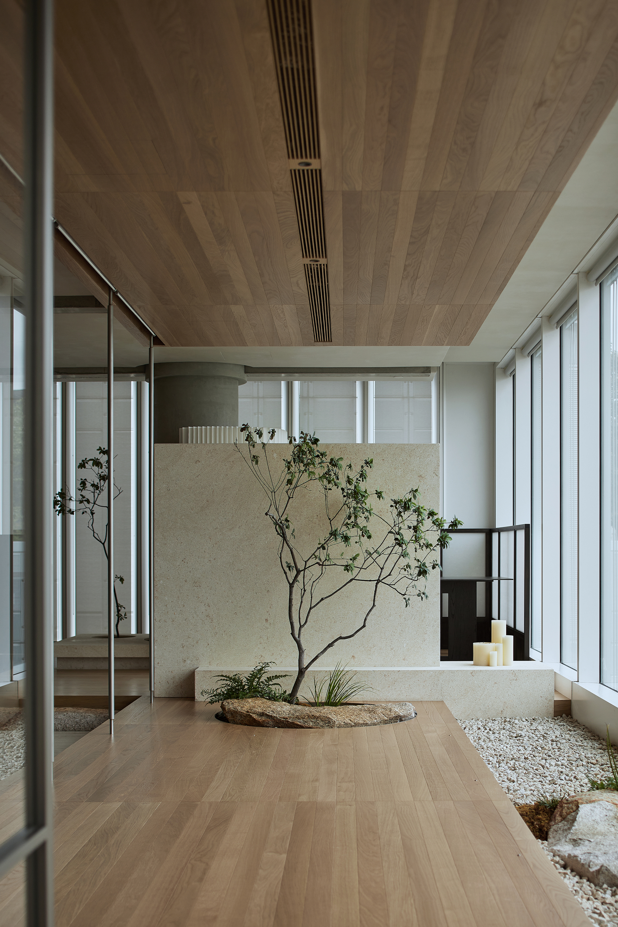The elevated public area and the sunken negotiation area form a height difference, enclosing a scale similar to a family living room. People can sit here and have a conversation facing the landscape and nature. The height difference and layout of the space guide the natural occurrence of communication, making every conversation immersed in relax.