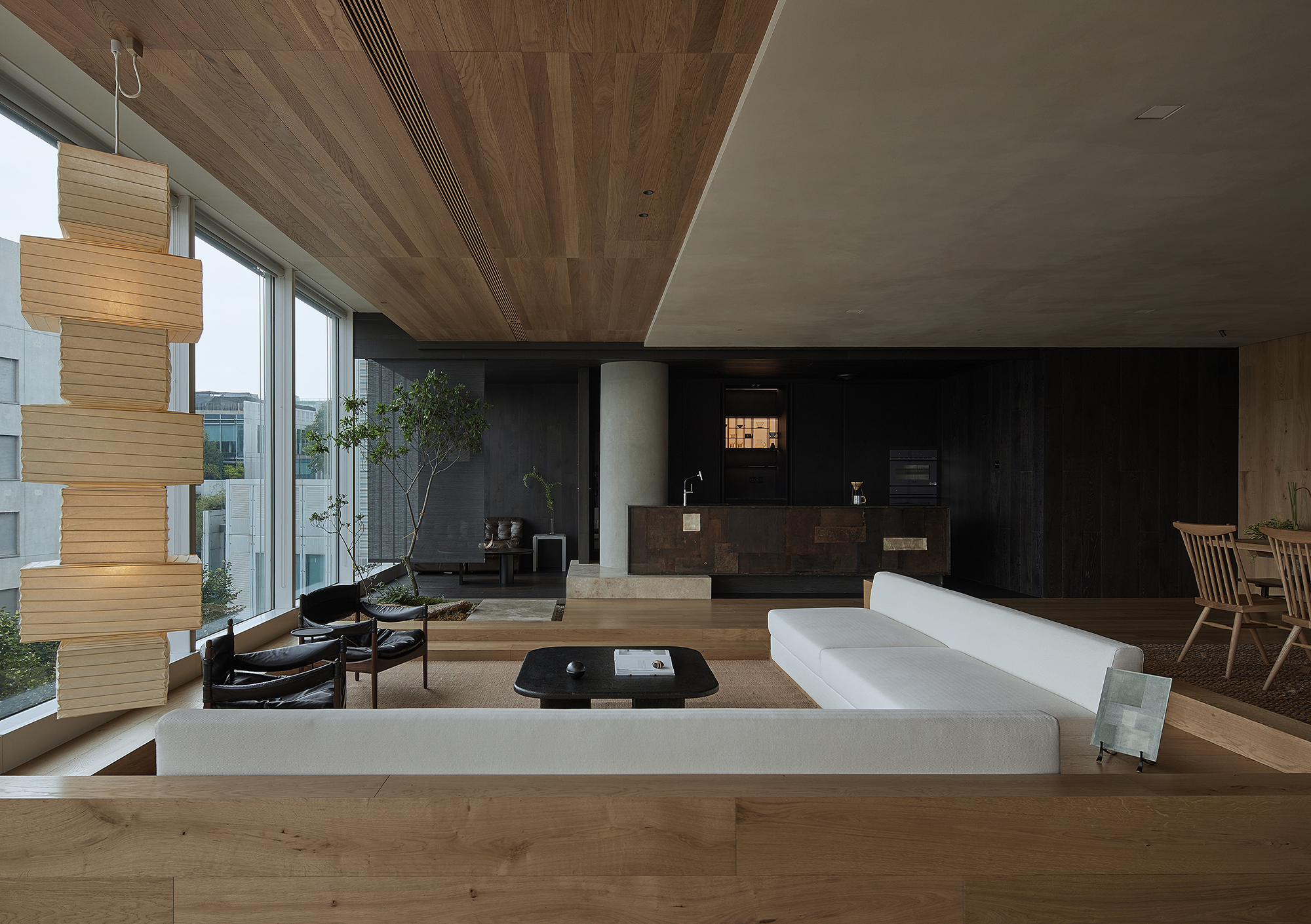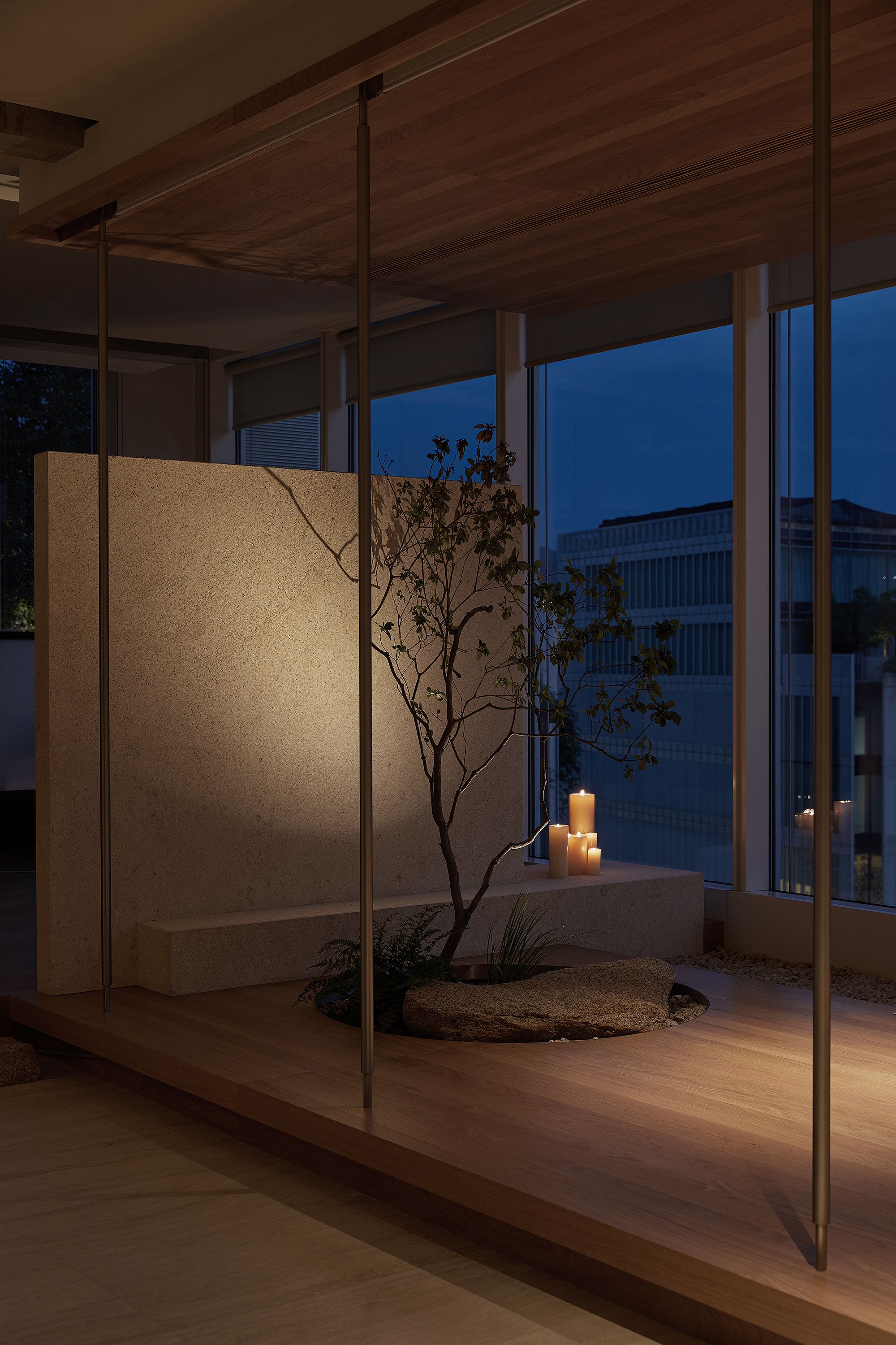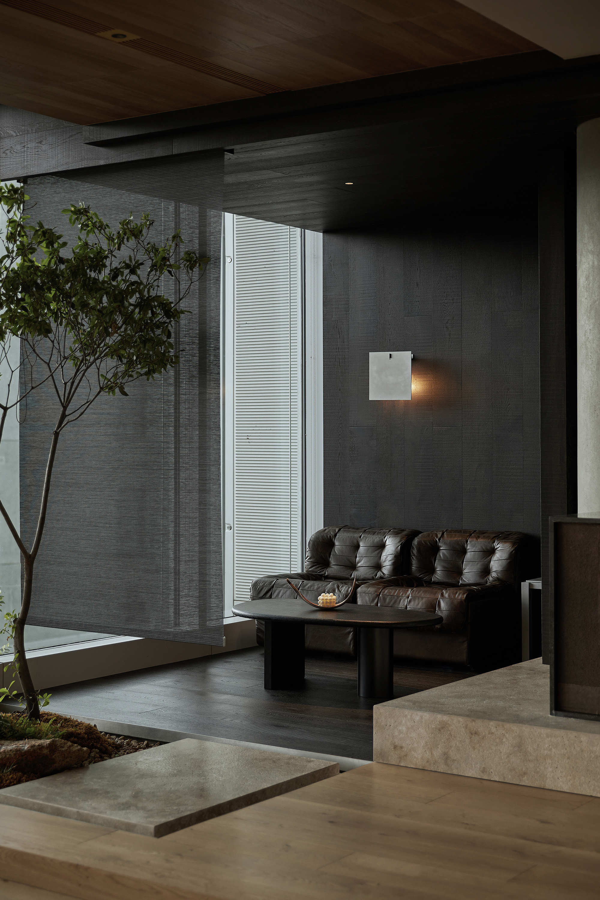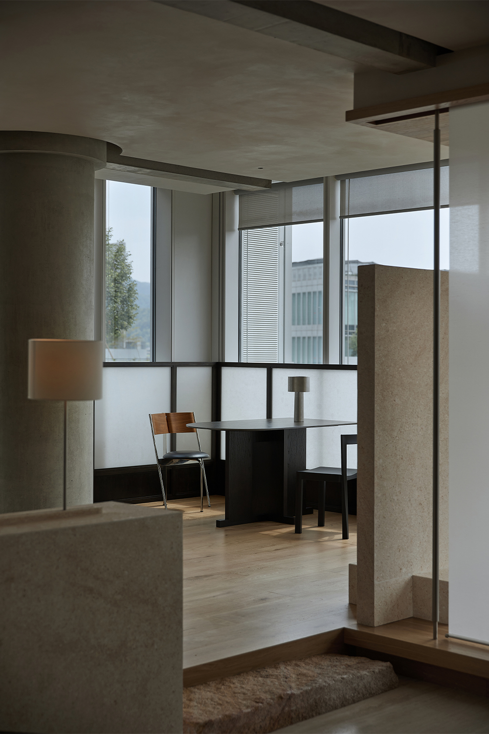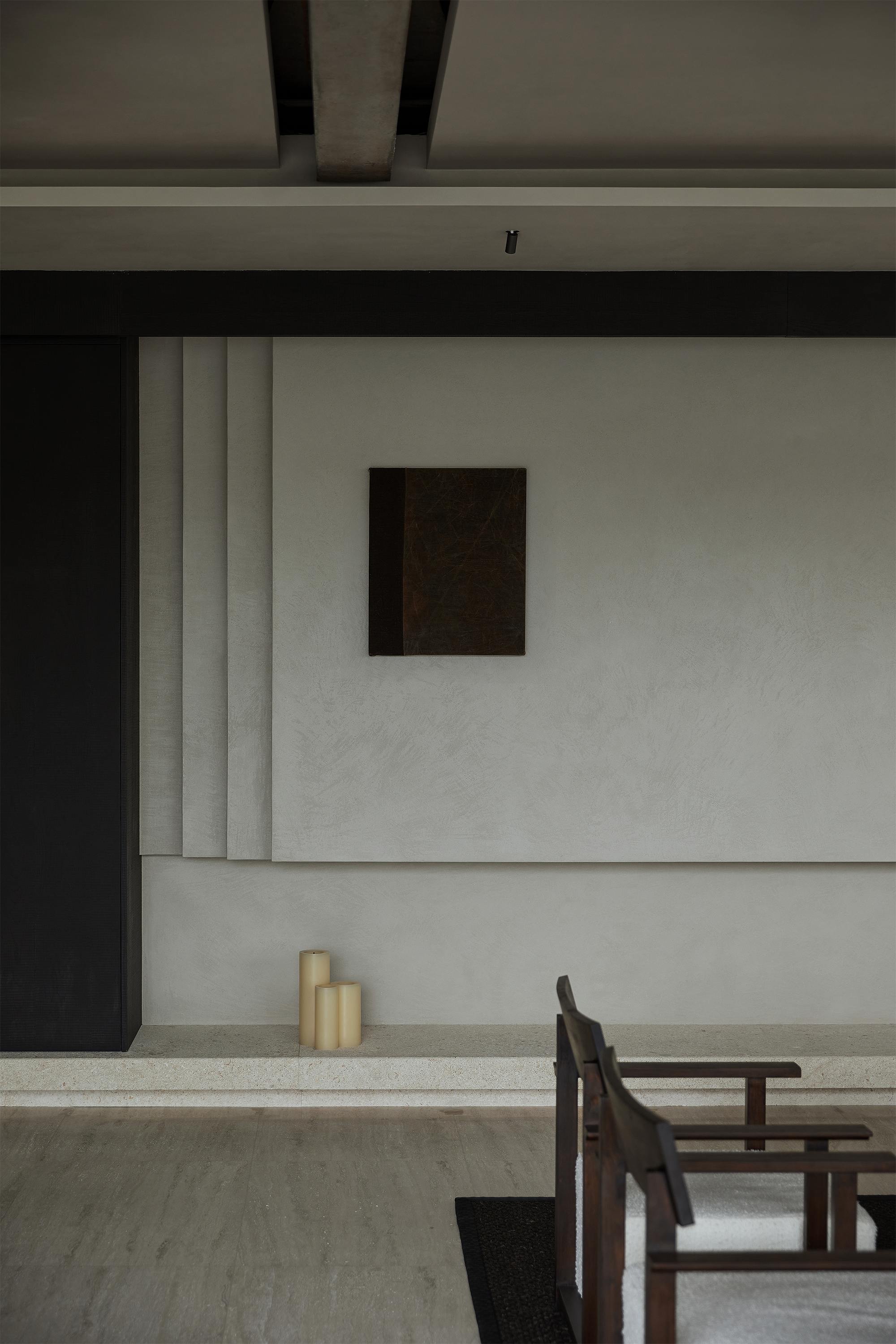 The elevated public area and the sunken negotiation area form a height difference, enclosing a scale similar to a family living room. People can sit here and have a conversation facing the landscape and nature. The height difference and layout of the space guide the natural occurrence of communication, making every conversation immersed in relax.