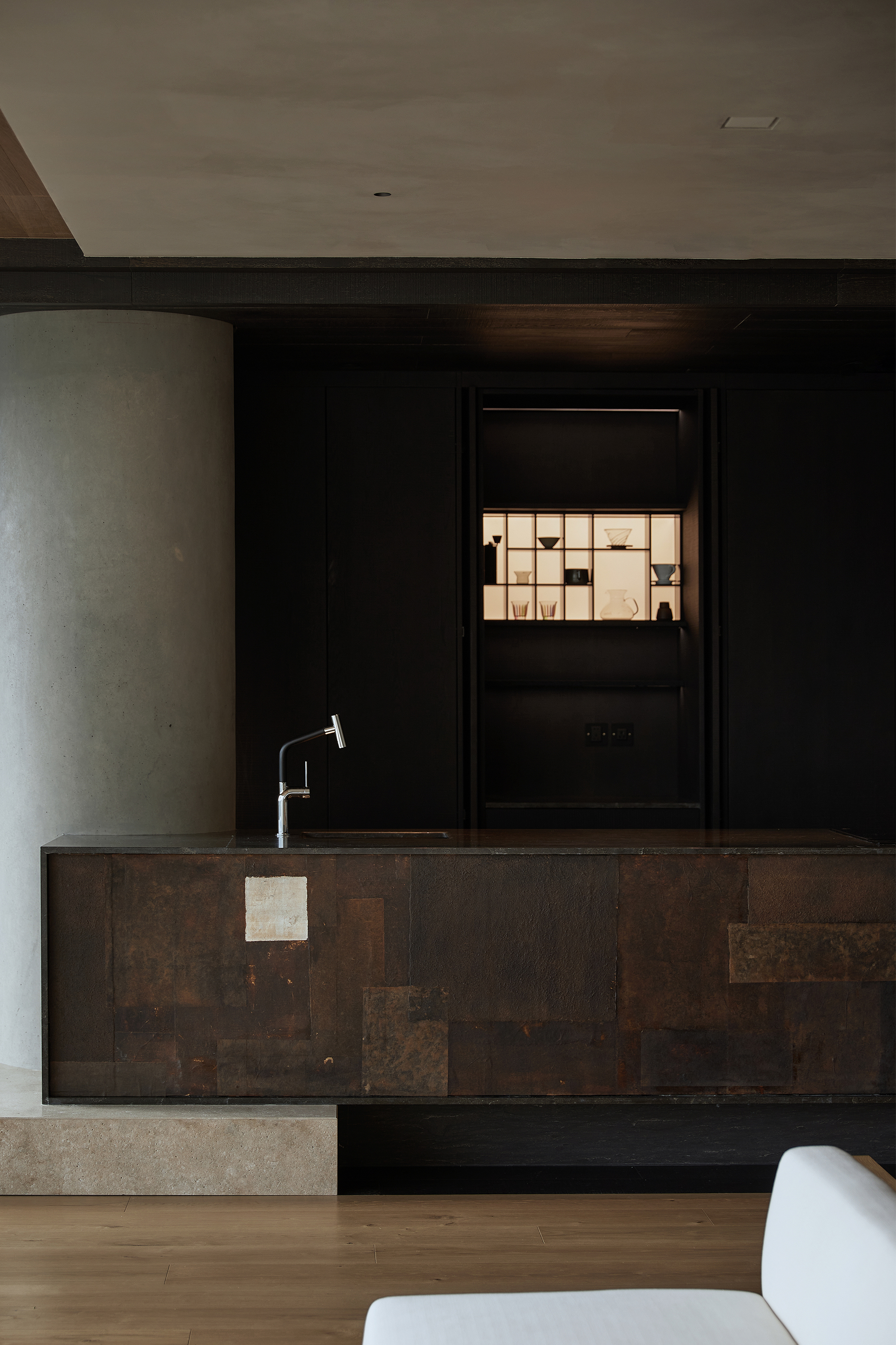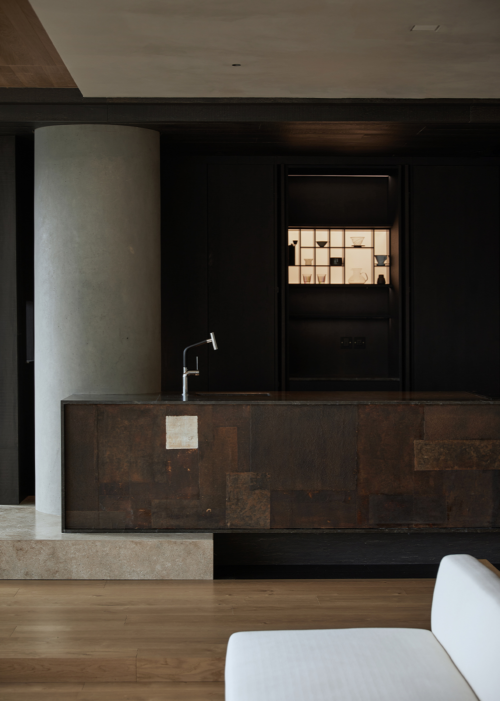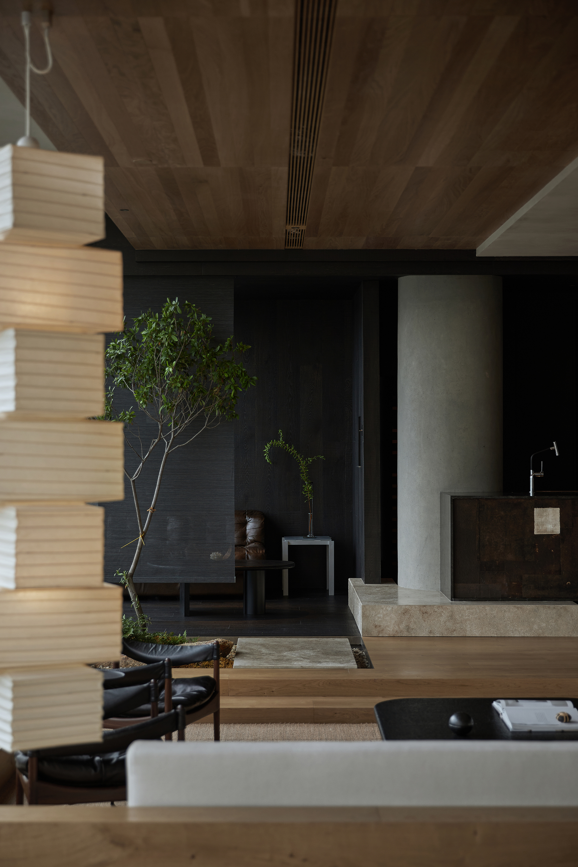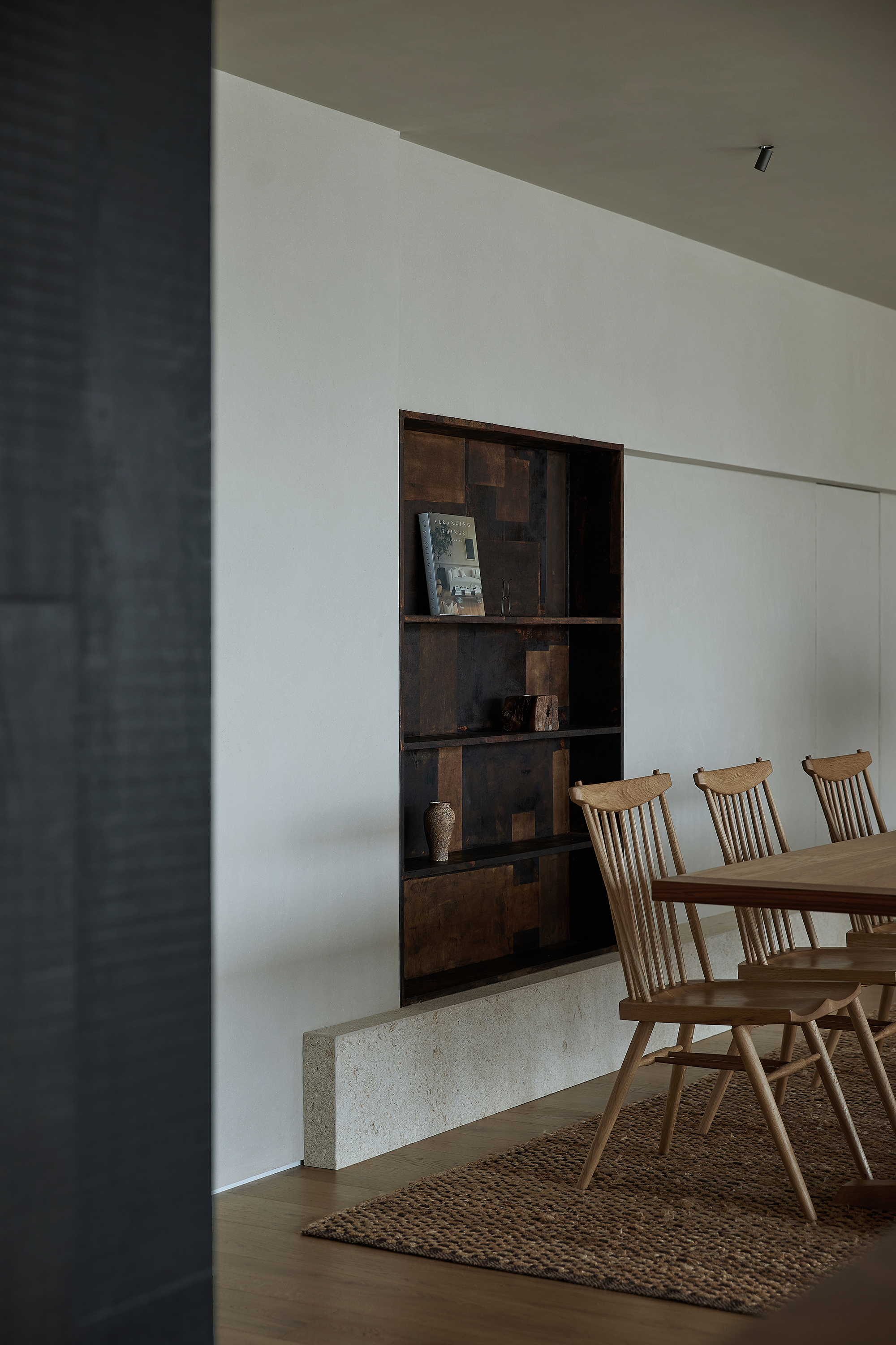In terms of material selection, we have retained the original gray cement wall in OōEli and incorporated warm wood and natural stone. Different textures harmonize with each other in collision, softening the coldness of concrete and injecting a "home" temperature into the space. The bar counter polished with lacquer is connected to the original cement structure, establishing a dialogue of rigidity and flexibility between traditional craftsmanship and modern construction.