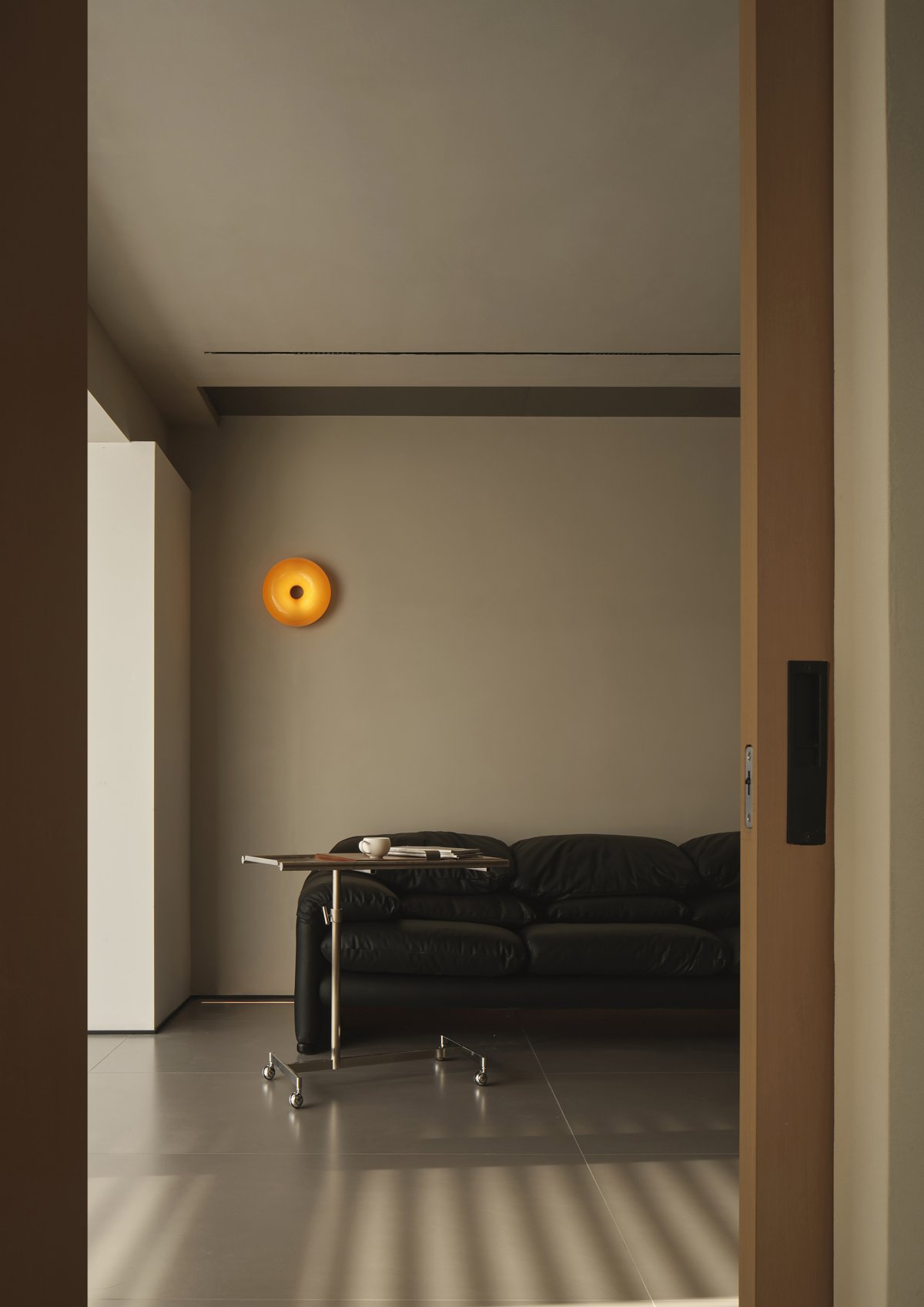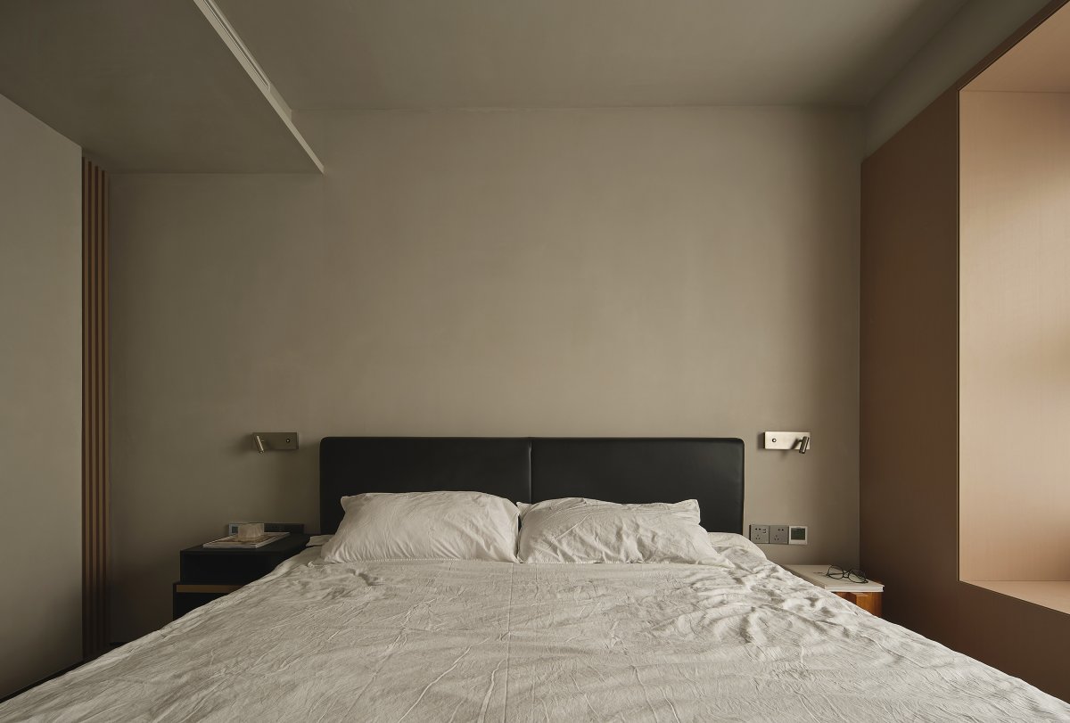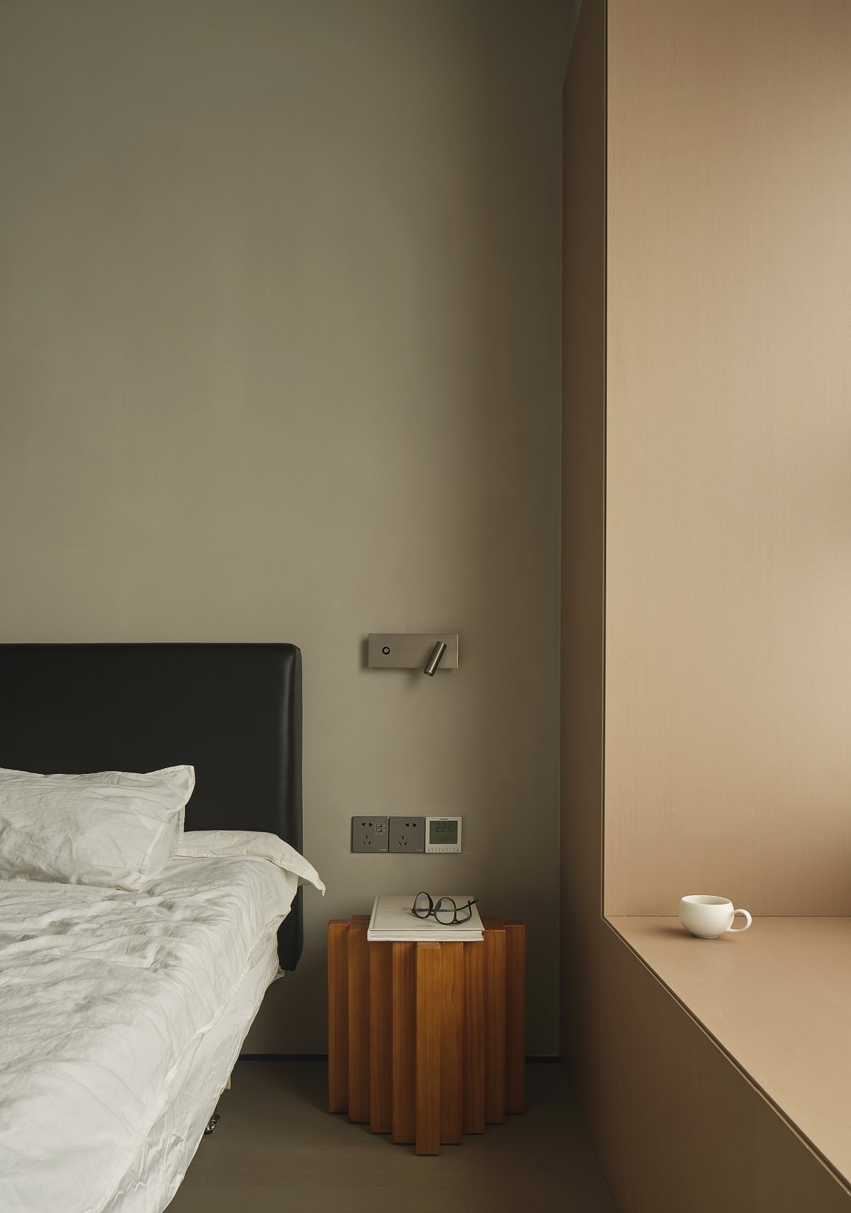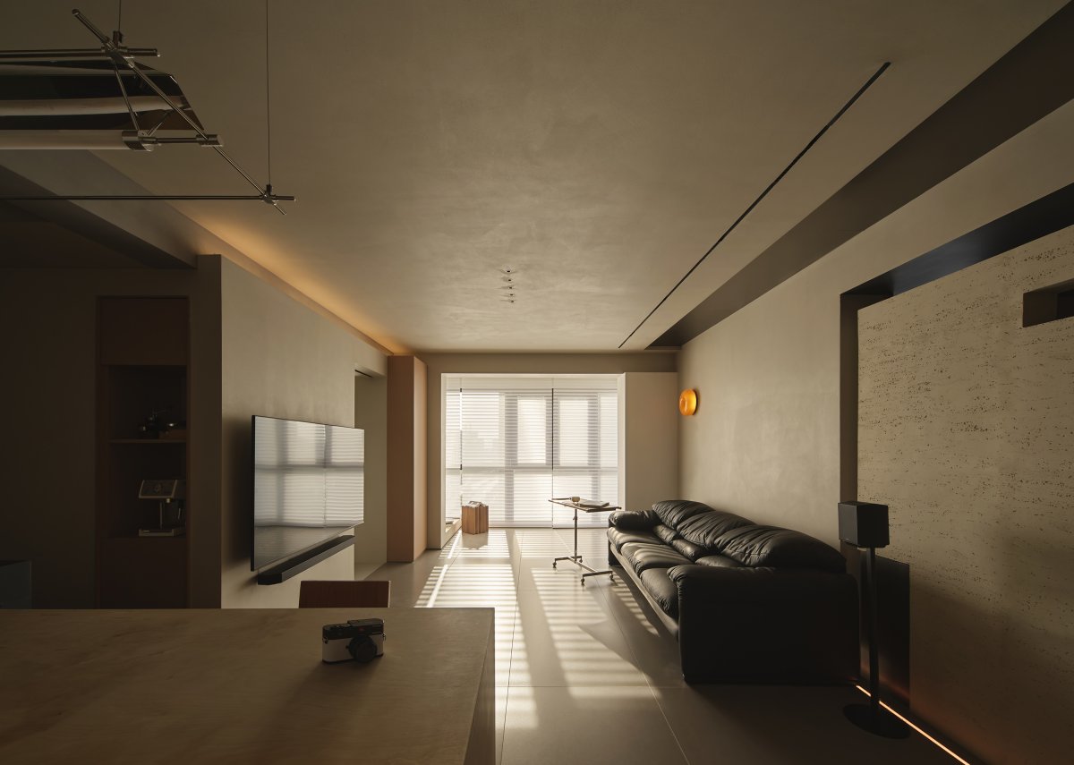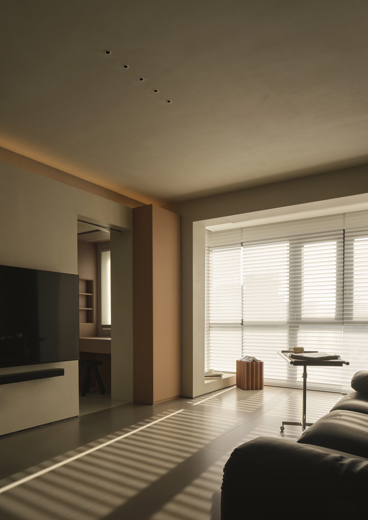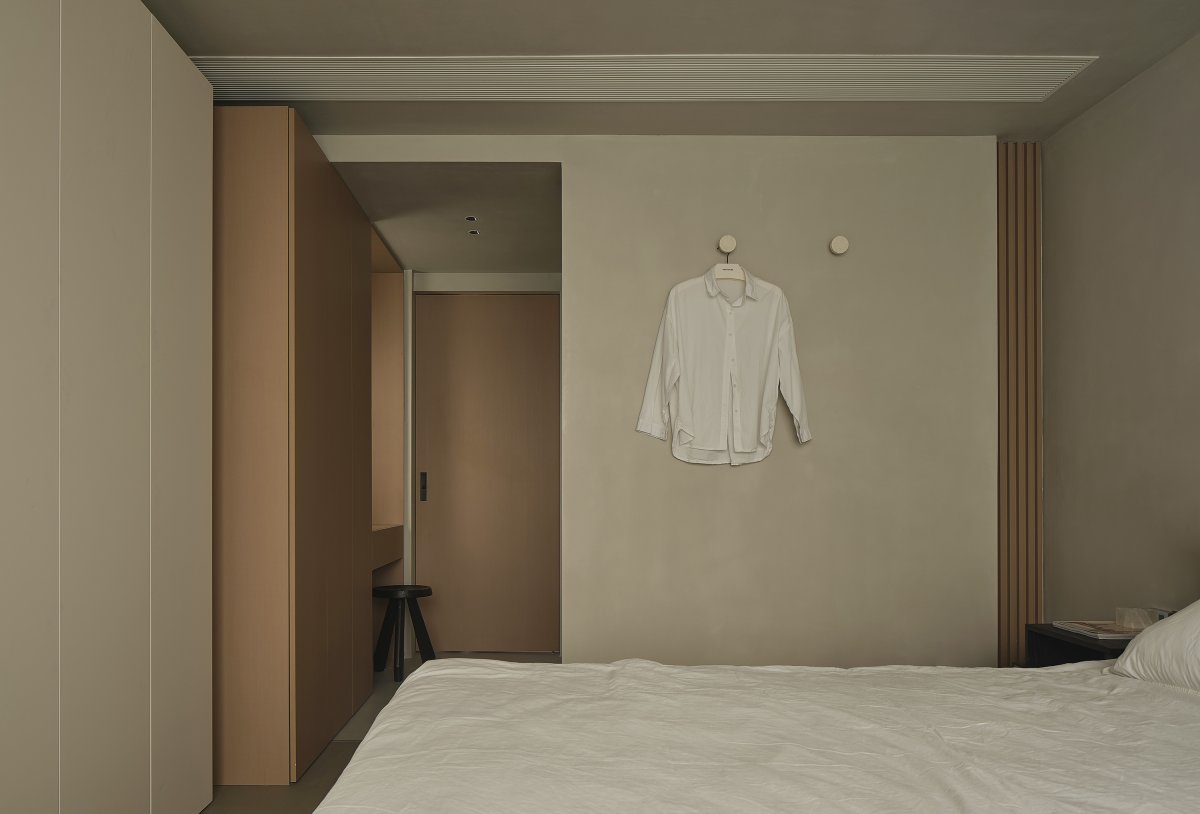 The original living room architecture is fully preserved and the warm, restrained wall material allows light to lazily adhere. On the partial top surface, a low-saturation matte metal was deliberately used to create layers with small clashes of natural travertine materials. Taking into account the owner's sensitivity to sound, pocket doors and transitional spaces connecting inside and outside were used to muffle outside distractions and noises as much as possible. The aisle leading from the outside to the sleeping area is set up with a dressing table for the lady of the house and a system of storage with different functions.