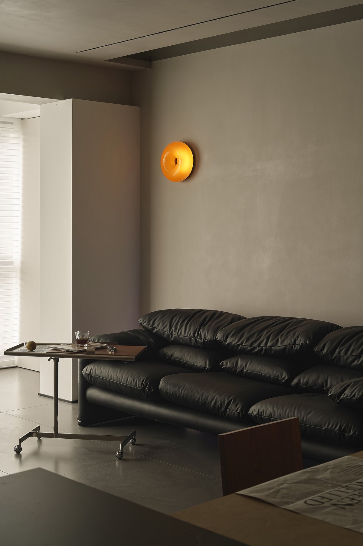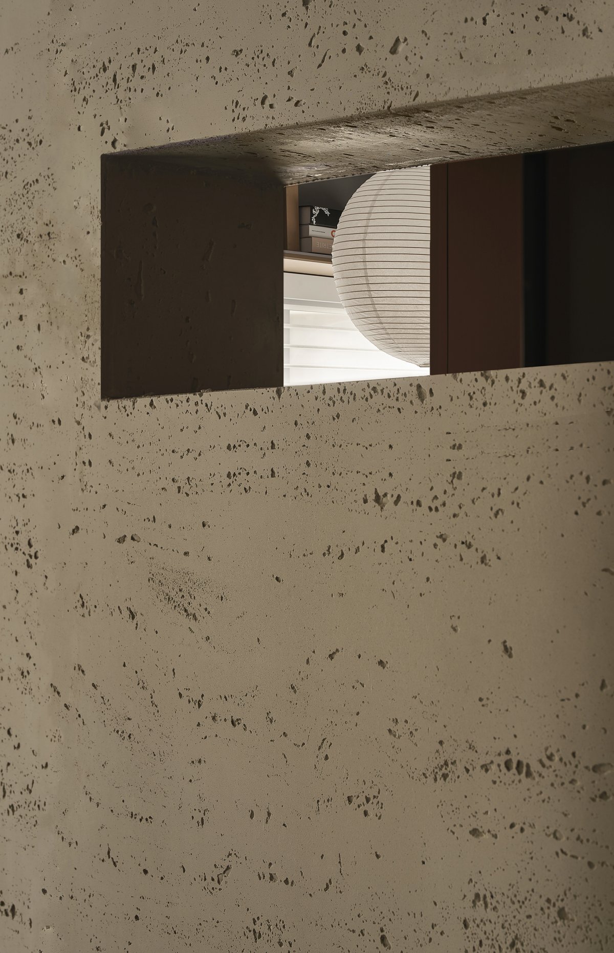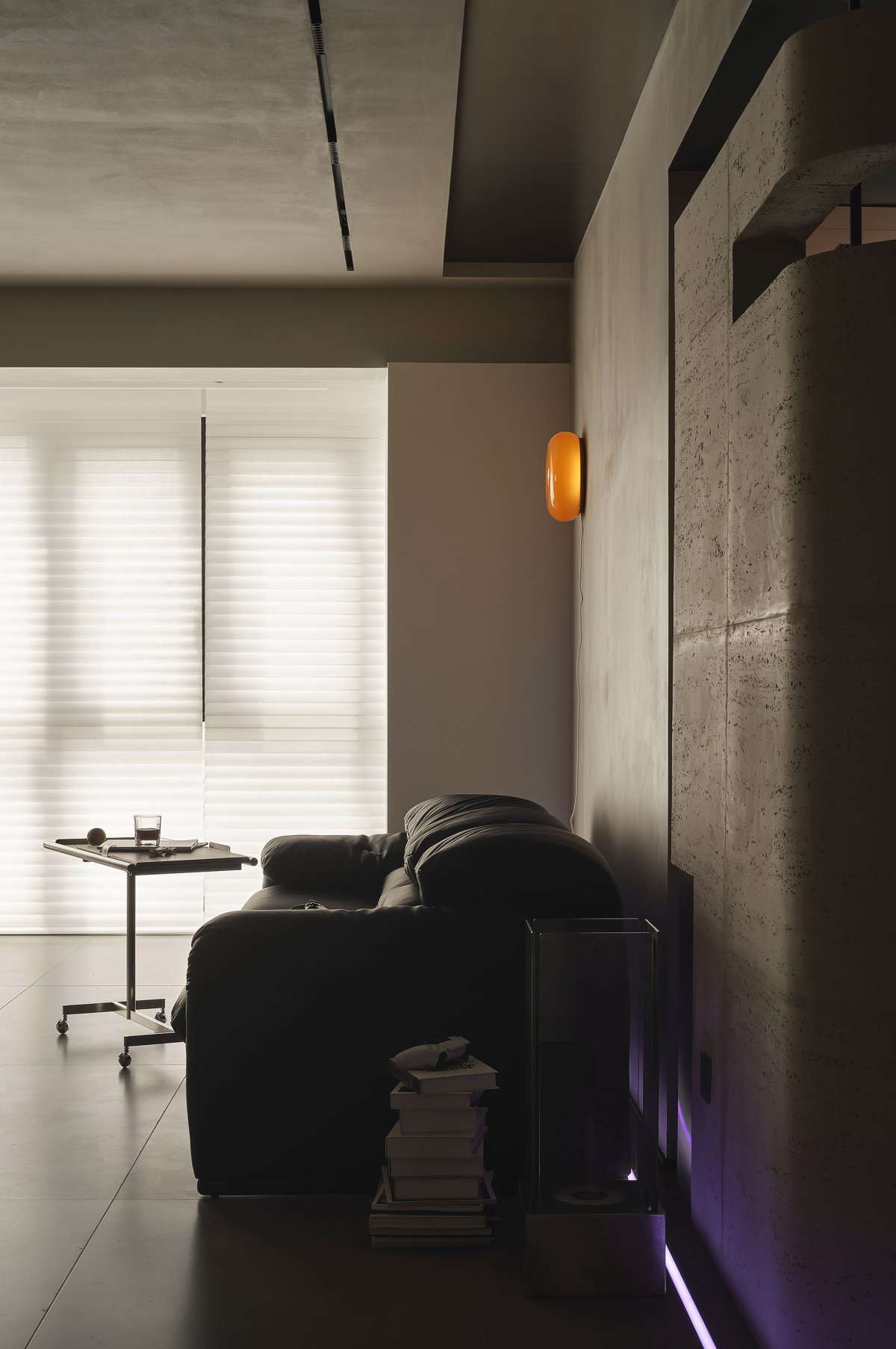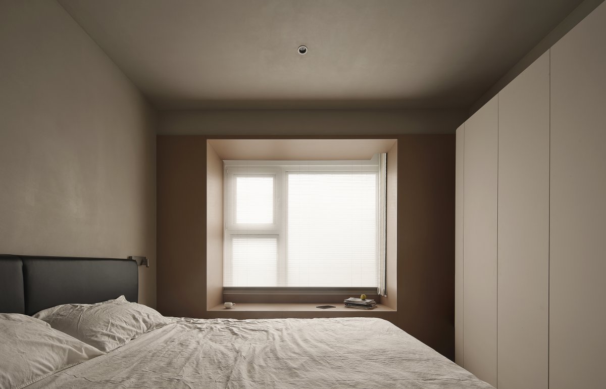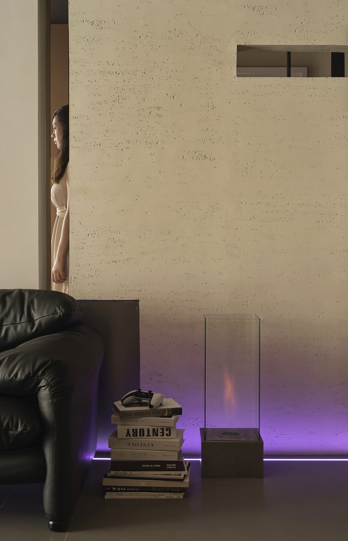 The original living room architecture is fully preserved and the warm, restrained wall material allows light to lazily adhere. On the partial top surface, a low-saturation matte metal was deliberately used to create layers with small clashes of natural travertine materials. Taking into account the owner's sensitivity to sound, pocket doors and transitional spaces connecting inside and outside were used to muffle outside distractions and noises as much as possible. The aisle leading from the outside to the sleeping area is set up with a dressing table for the lady of the house and a system of storage with different functions.