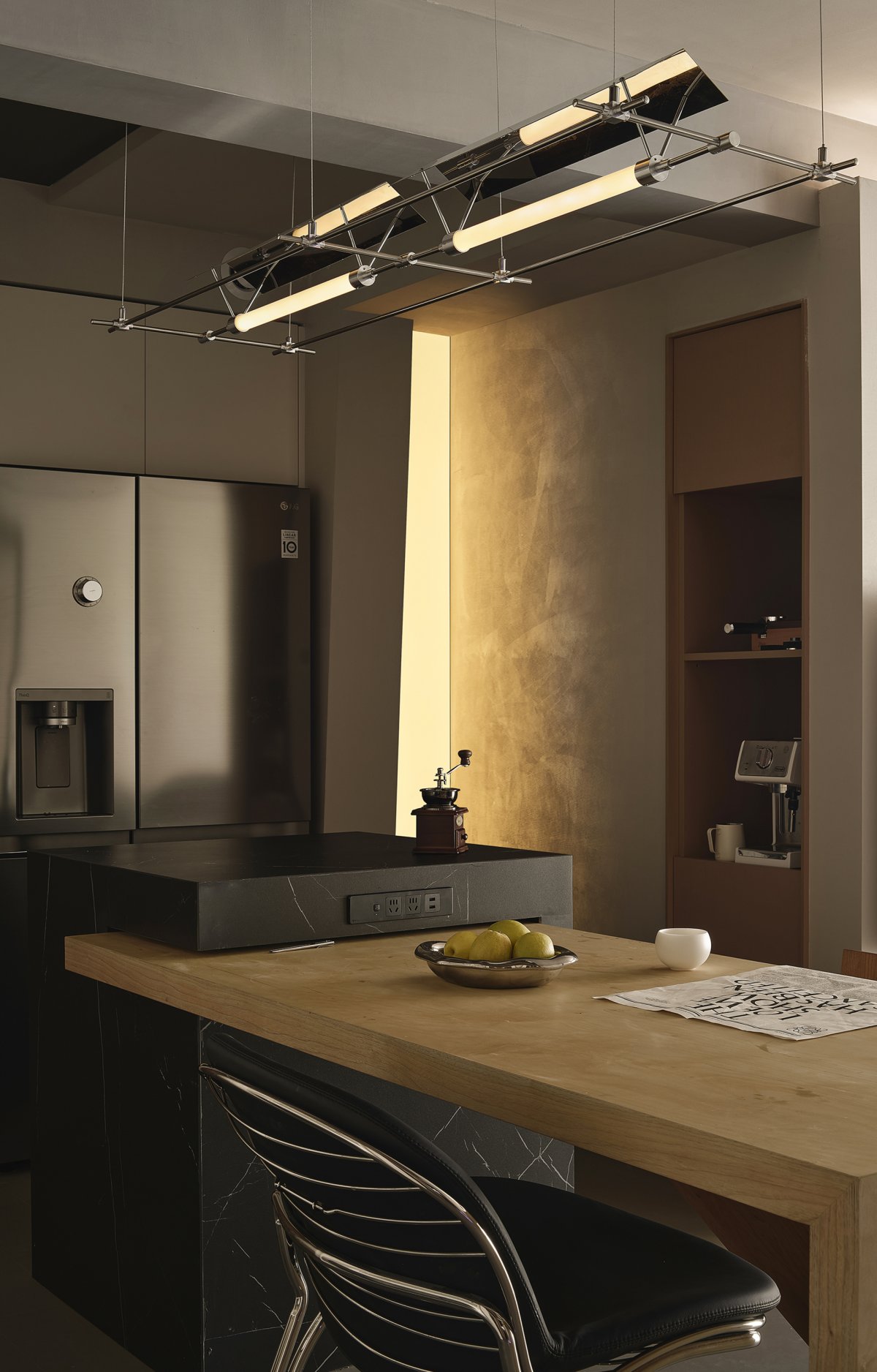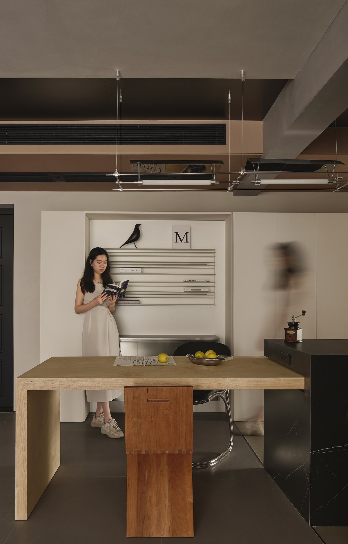 The original dining and kitchen functions have been reorganised and expanded to meet the individual needs of different users and to facilitate dialogue and communication. The dining, reading and storage functions are planned around the migratory flow of the dining room. To weaken the heaviness of the large storage system, the balance is neutralised with light steel panels and metallic suspension cabinets. The small spaces set back inside create a modest sense of enclosure, using wall gaps to fill in with soft luminous materials.