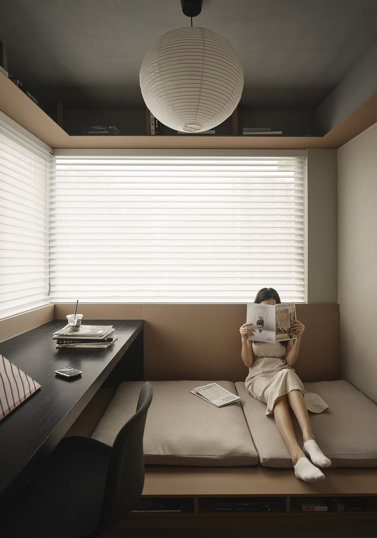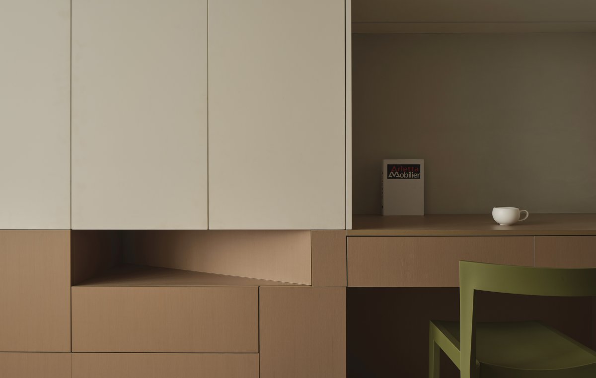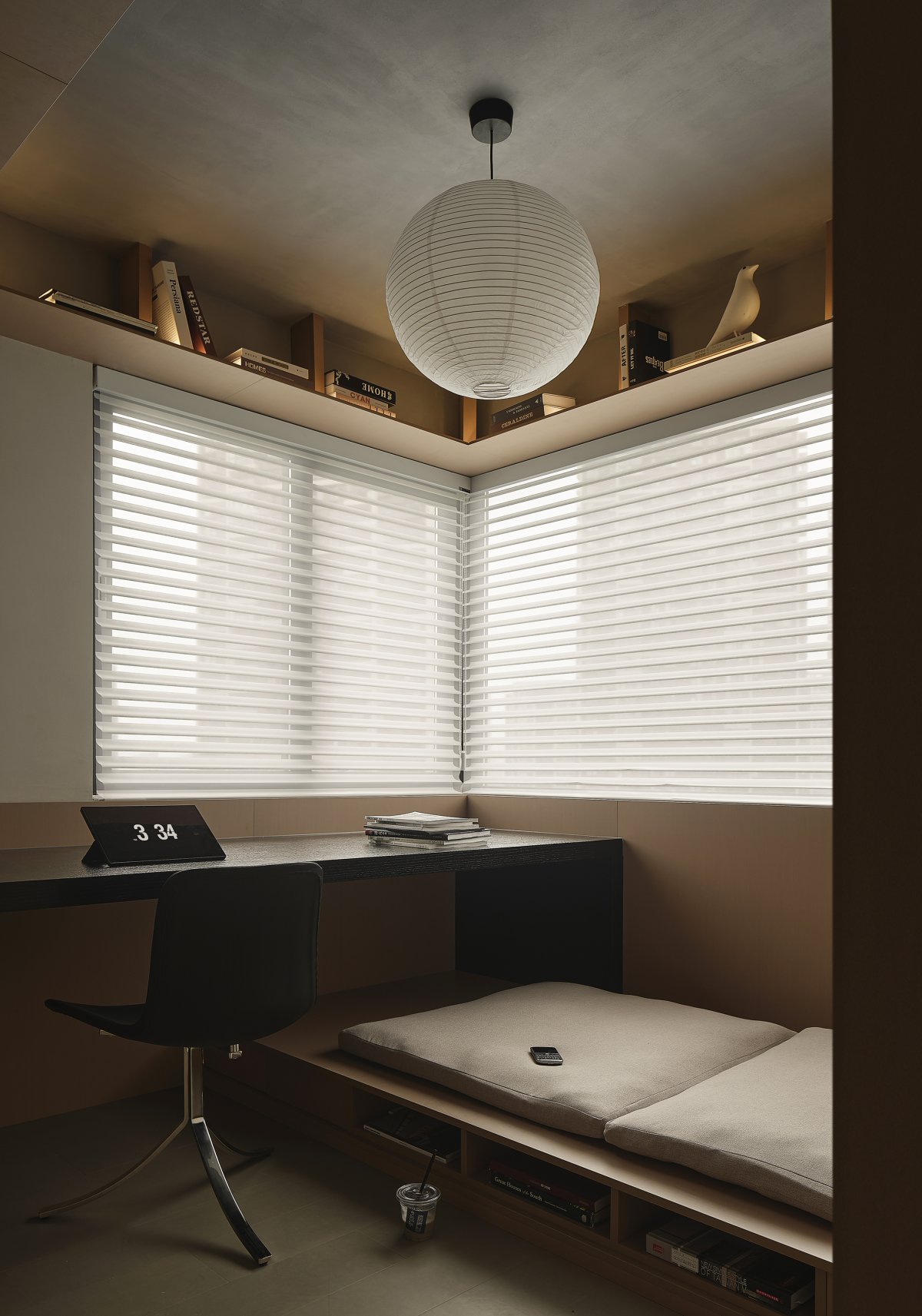 The study serves as a temporary resting place, and this is where the whole atmosphere of the residence is condensed. The bookshelves, often found on the walls, float on the top, and the dark desk floats on the floor through the wall support, amplifying and controlling the light coming in through the windows.