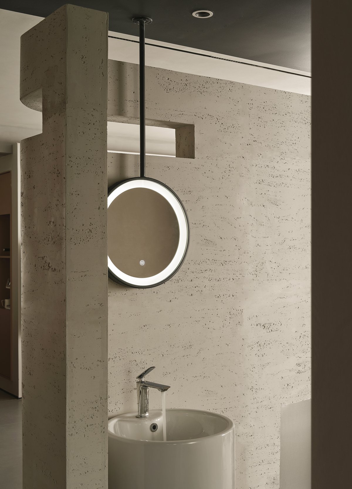 The wall of the living room is extended and interrupted, naturally forming a barrier between the washbasin and the common area, with restrained curves and cut-outs forming.