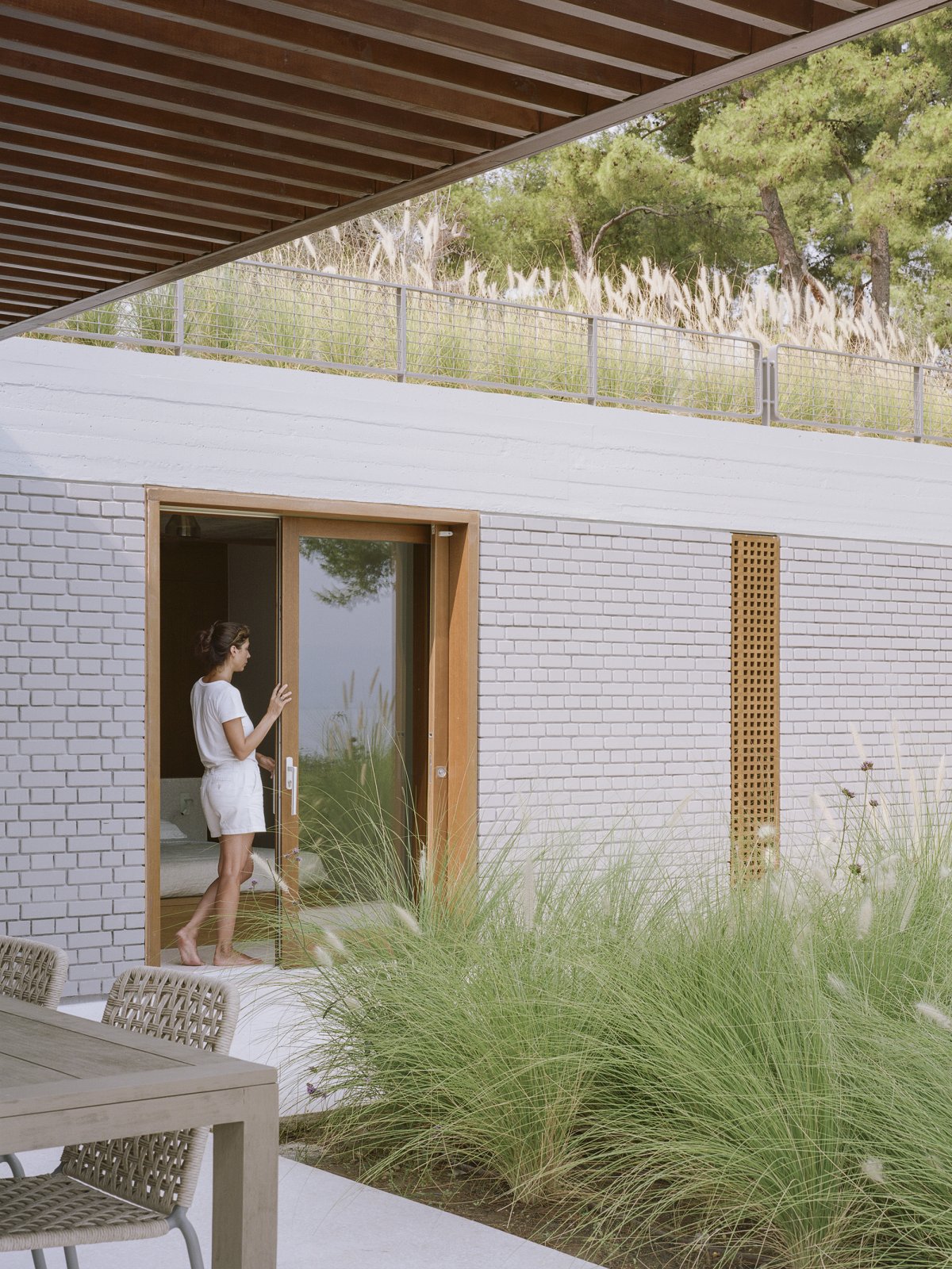 Crossing perpendicular to this primary axis a one-story bar of more private bedroom spaces are tucked into the existing slope of the landscape. The house disappears into the olive groves and wild pine forest from the approach road but opens up across two stories to embrace the full extent of the seafront views. Extensive terraces around the house create a multi-level network of outdoor living rooms.