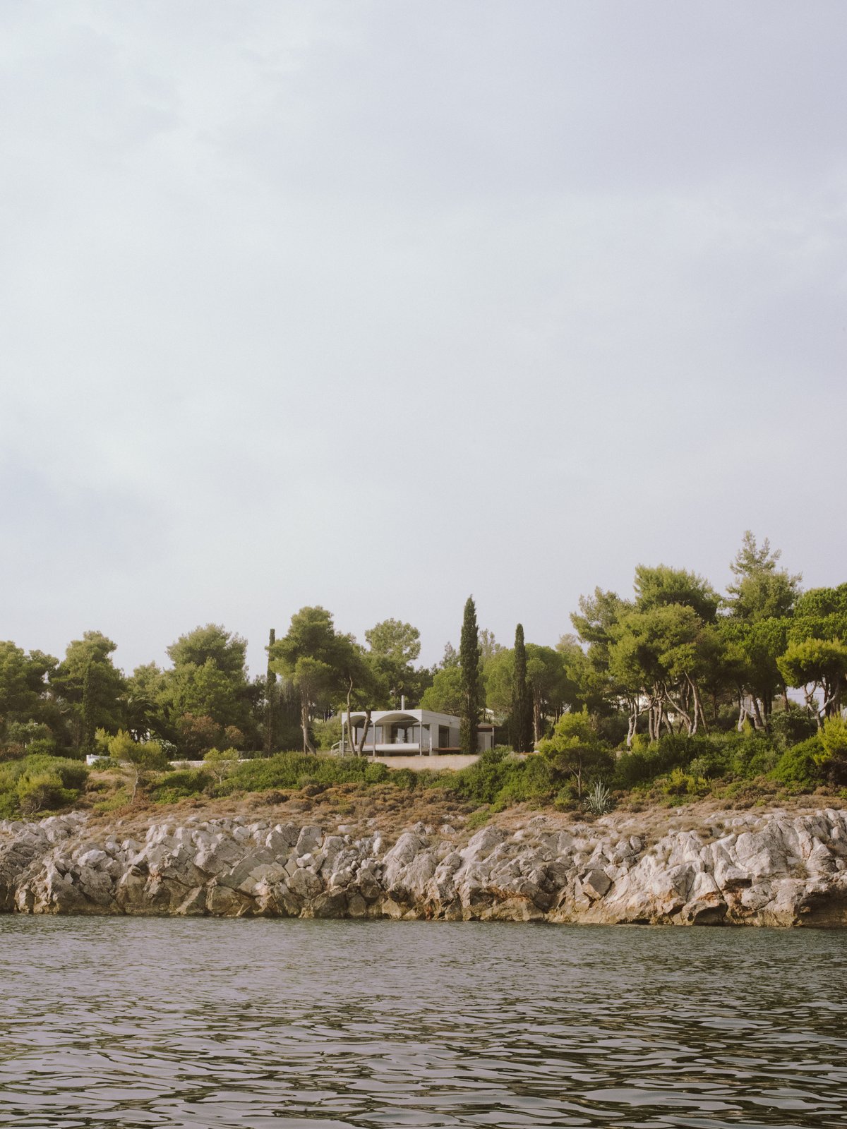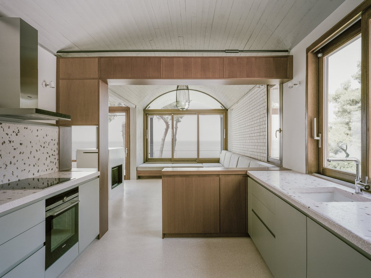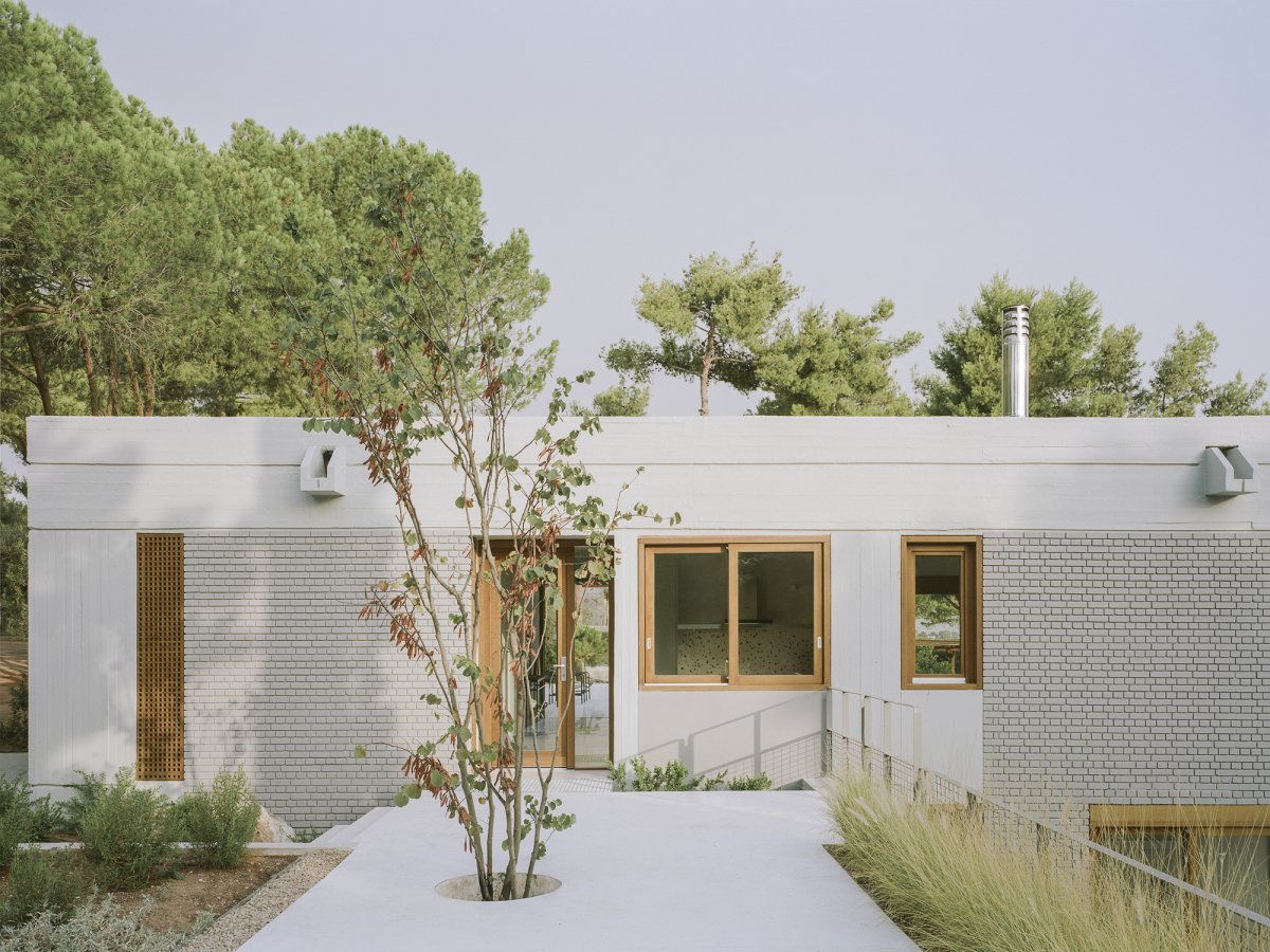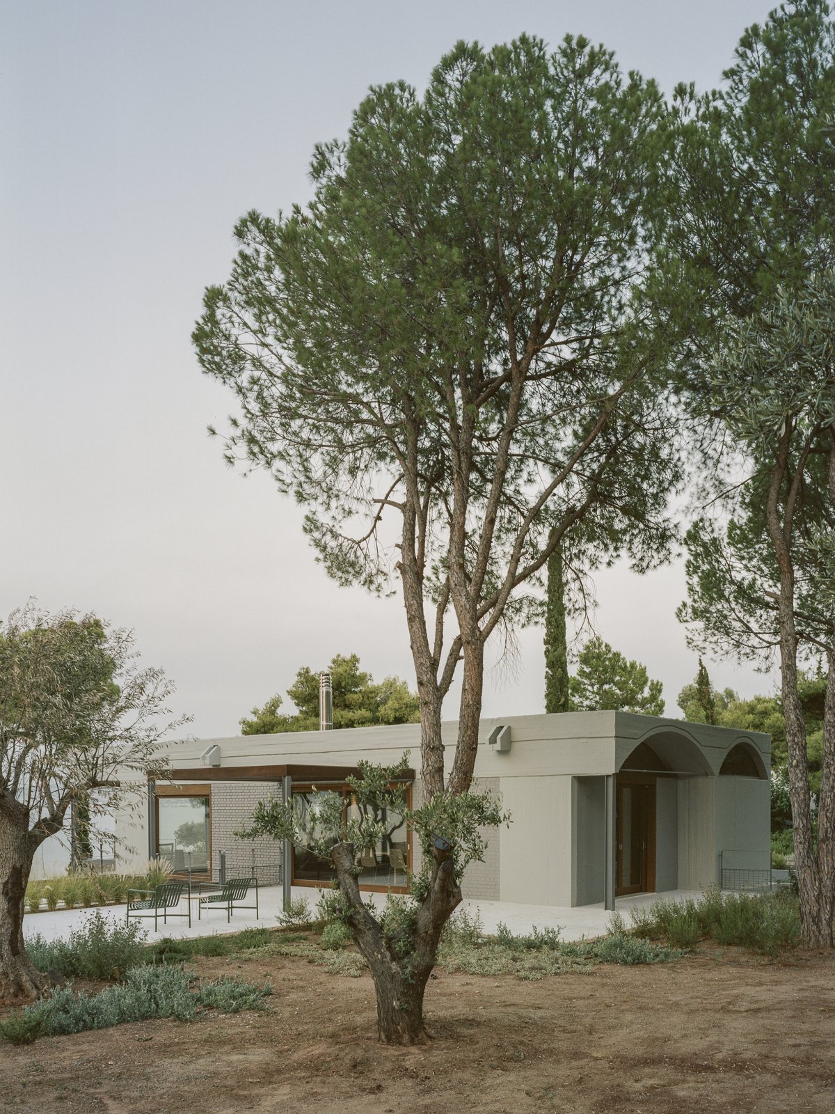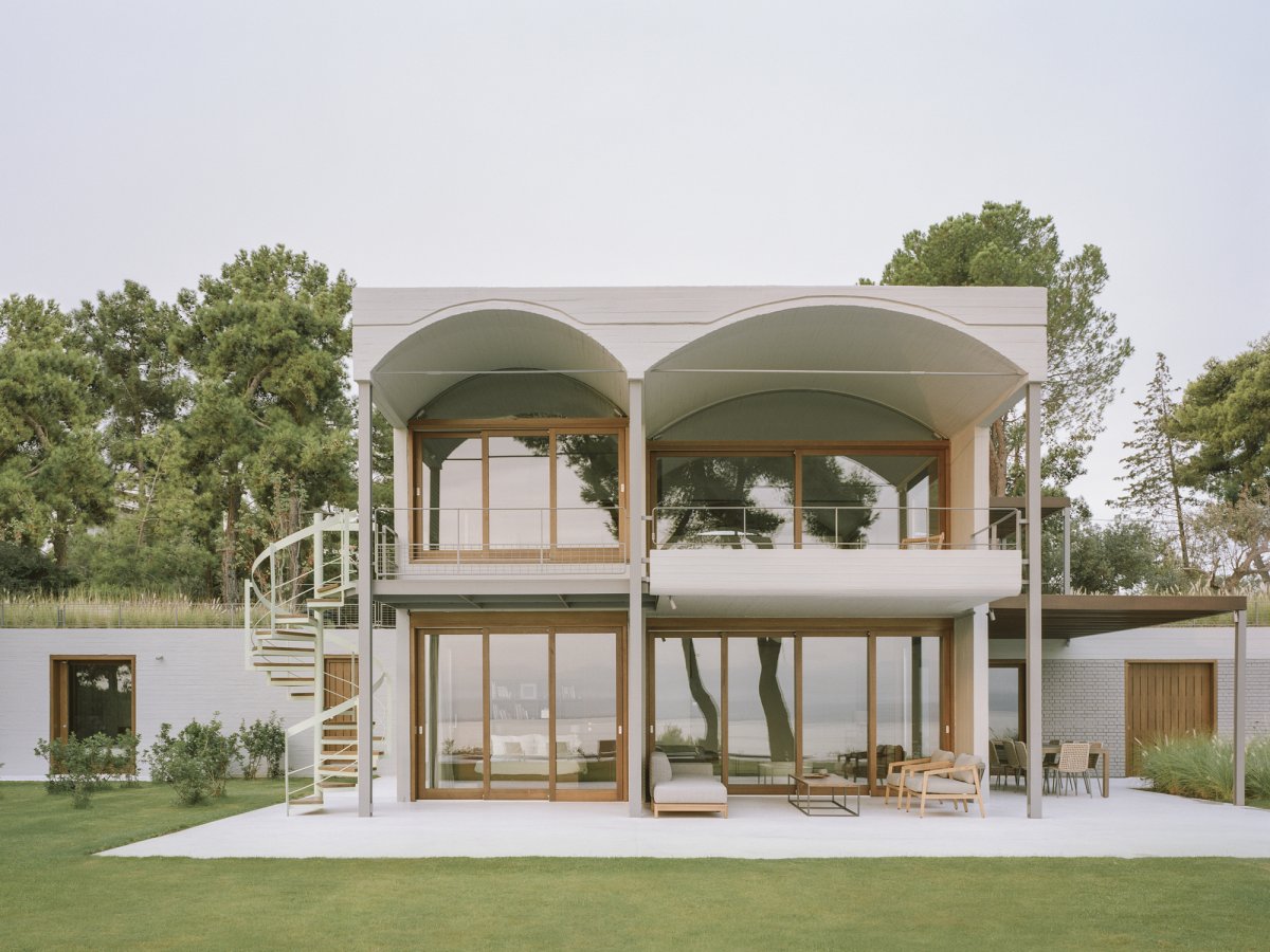 On a spectacular site overlooking the Euboean Sea near the small village of St. Minas, a mix of raw and refined materials combine to create a unique summer house that opens up to the landscape in all directions. Two large shallow concrete arches orient the main living spaces towards the sea.