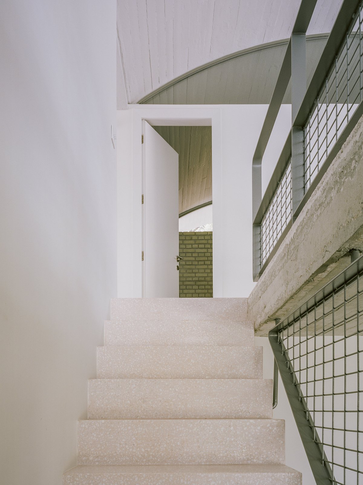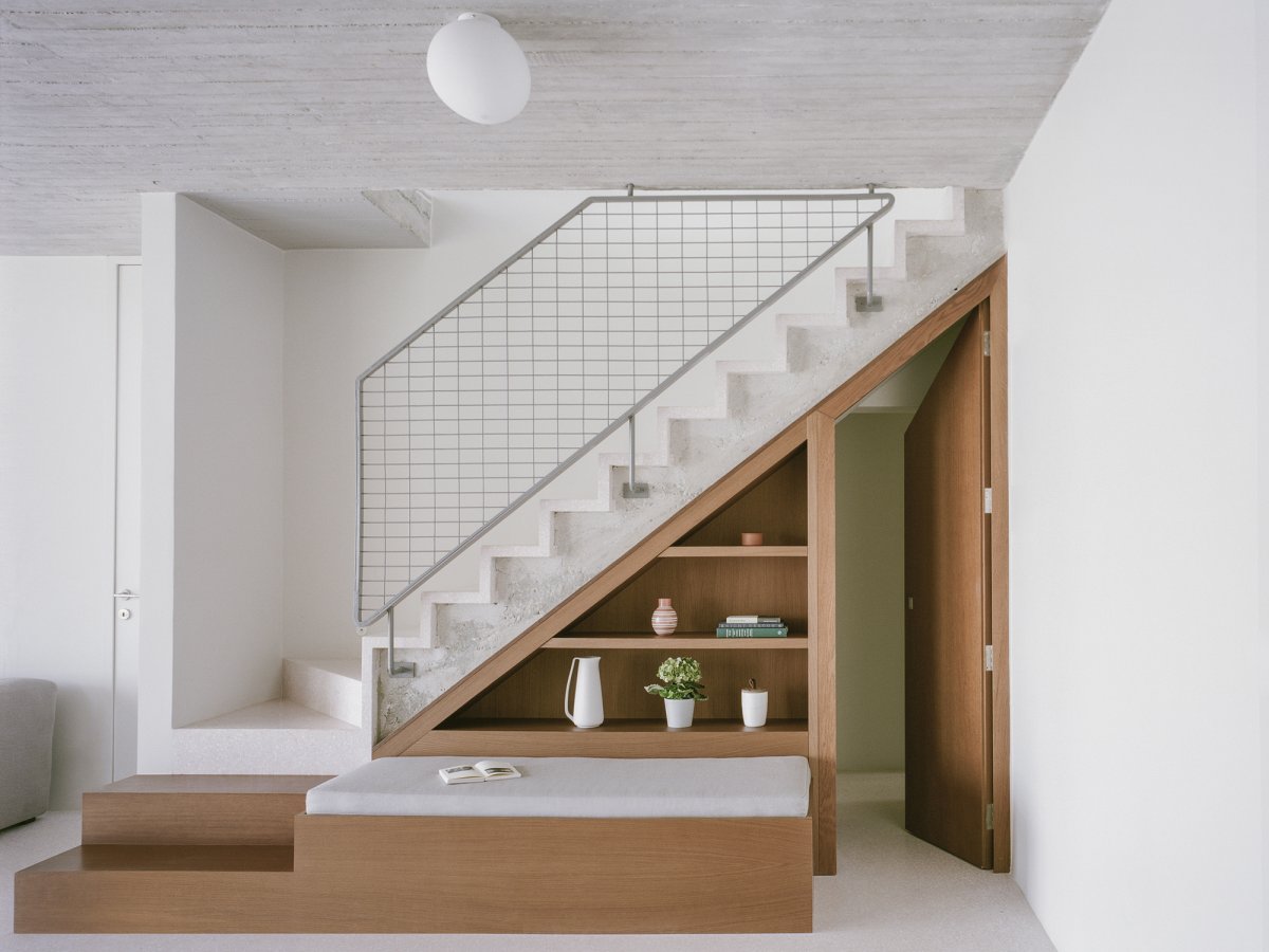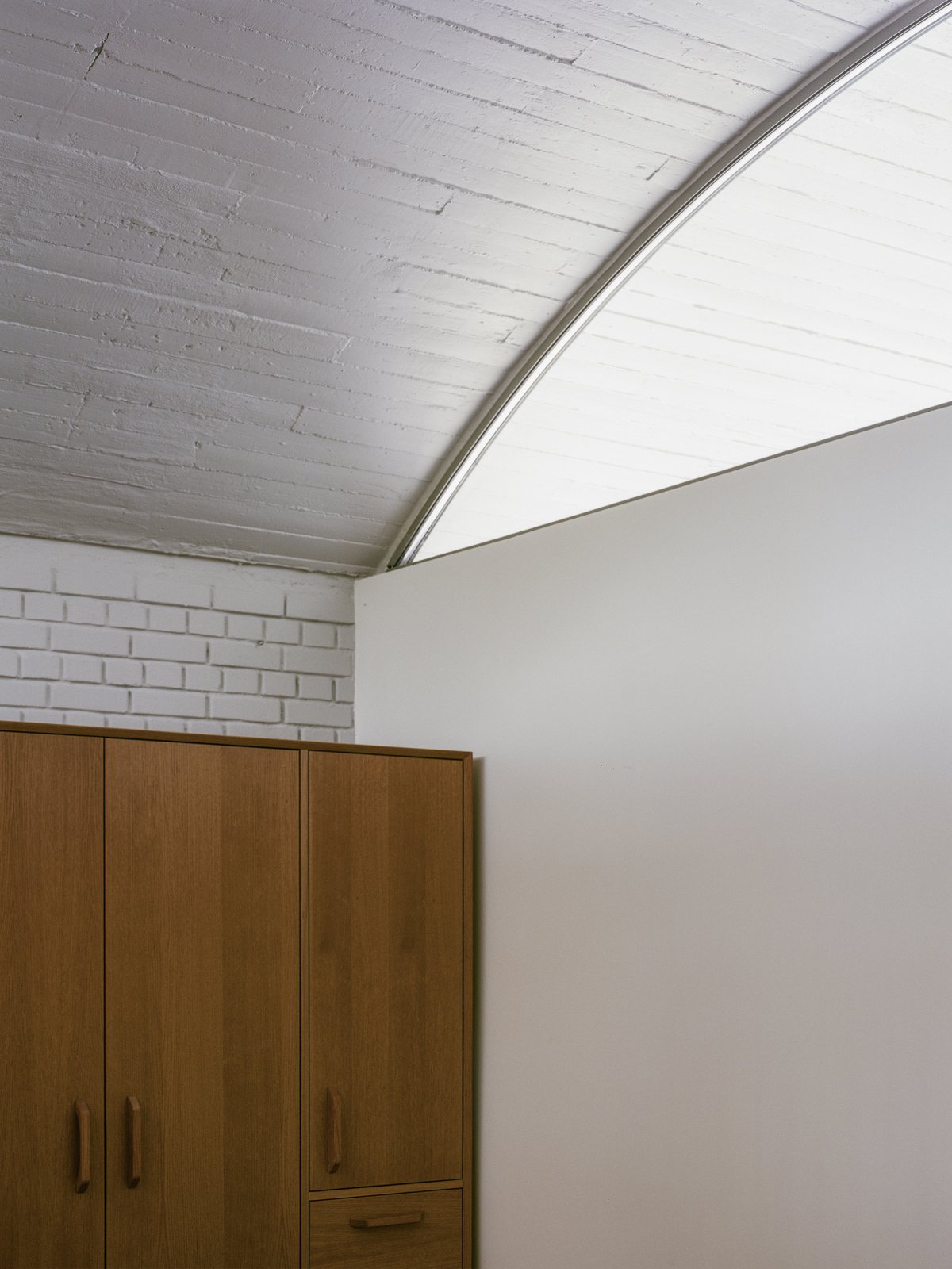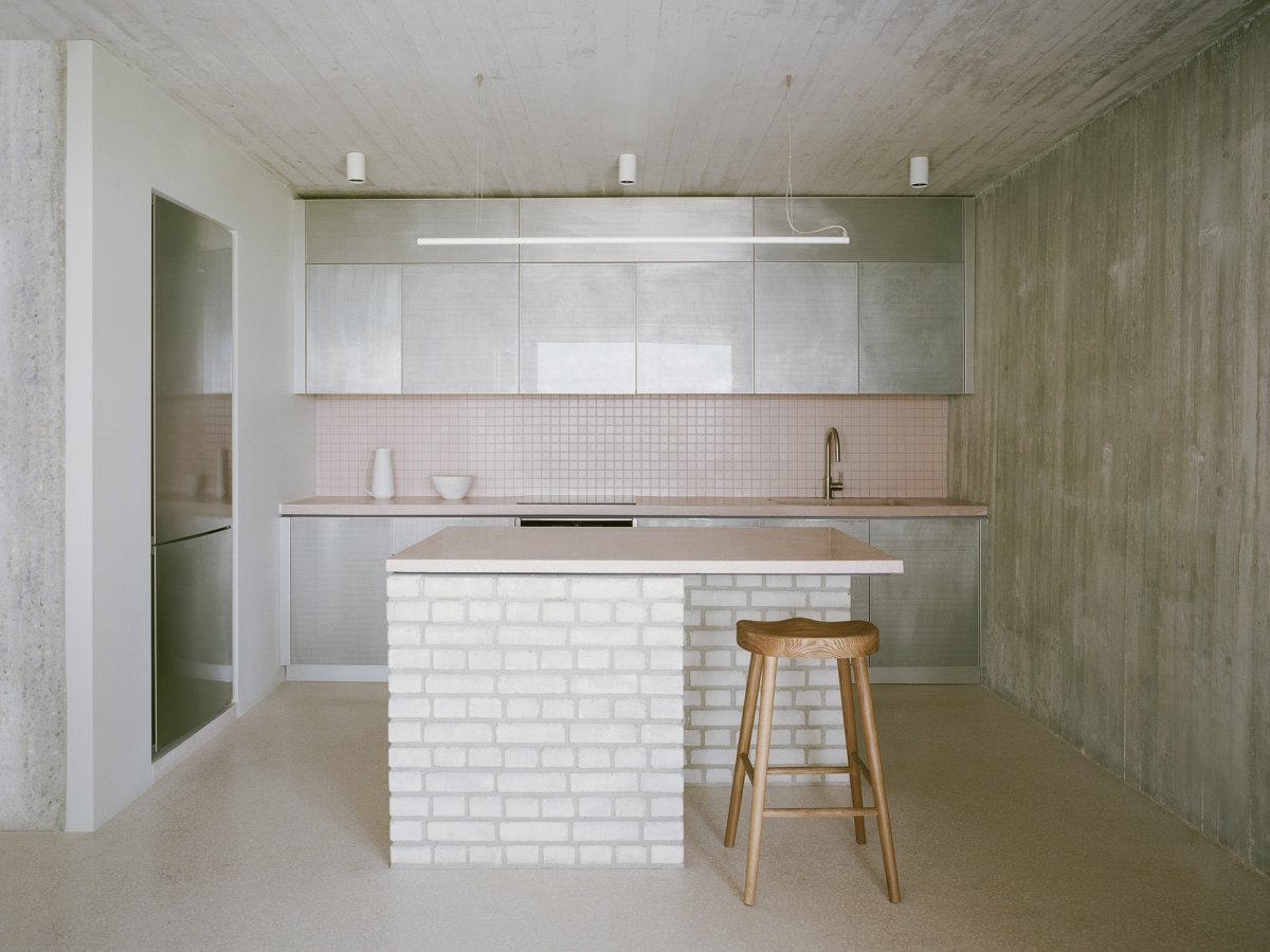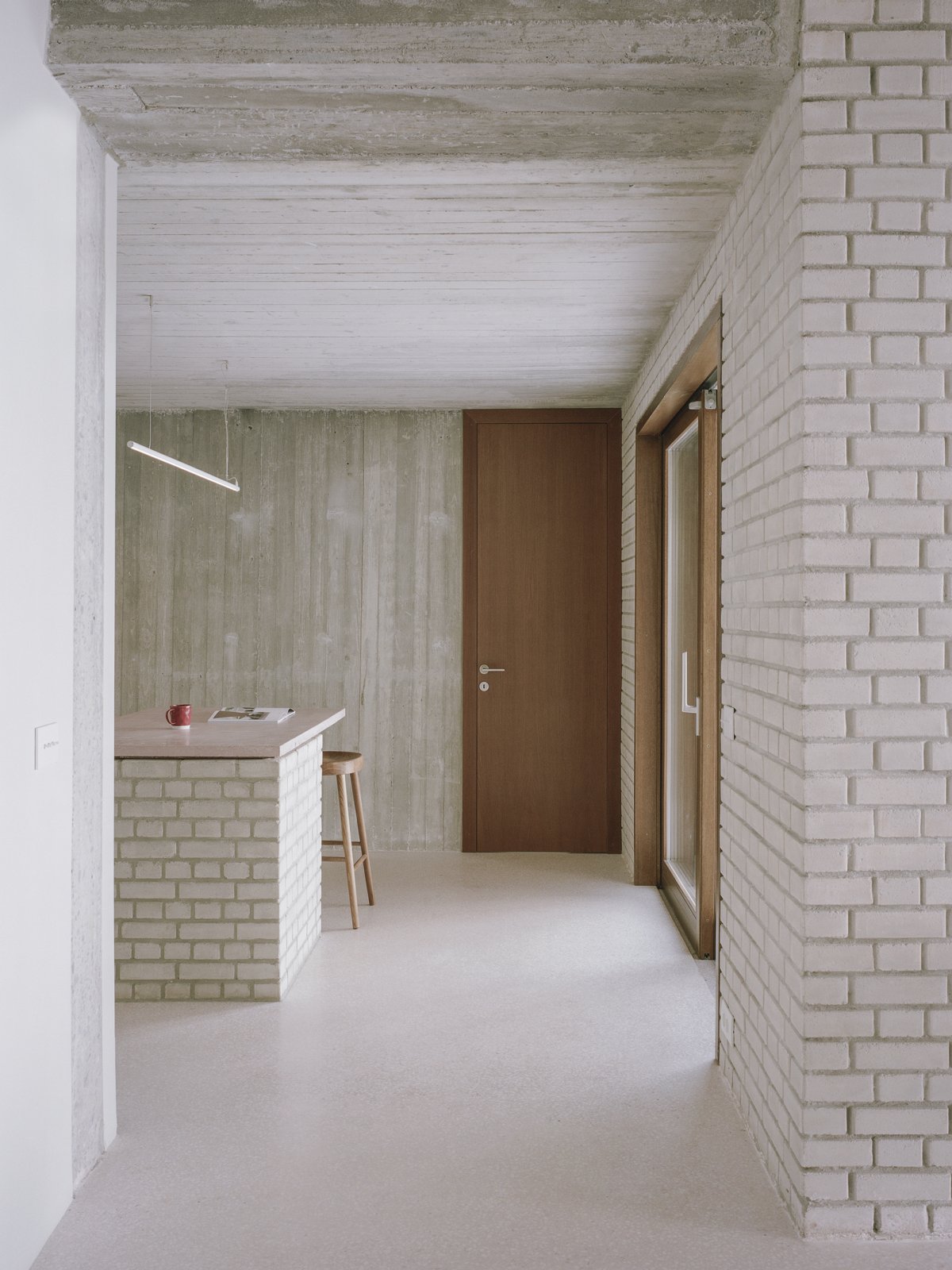 The house is deliberately ambiguous in its treatment of old and new, and unprecious in its deference to the original house;at times revealing the traces of the manipulations and incisions to the original, at other times blending new with old, conflating past and present.The exposed concrete of the structural walls and ceiling is complemented by exposed brick, wood windows, custom terrazzo floors, perforated aluminum cabinets, and built-in upholstered furniture throughout.
