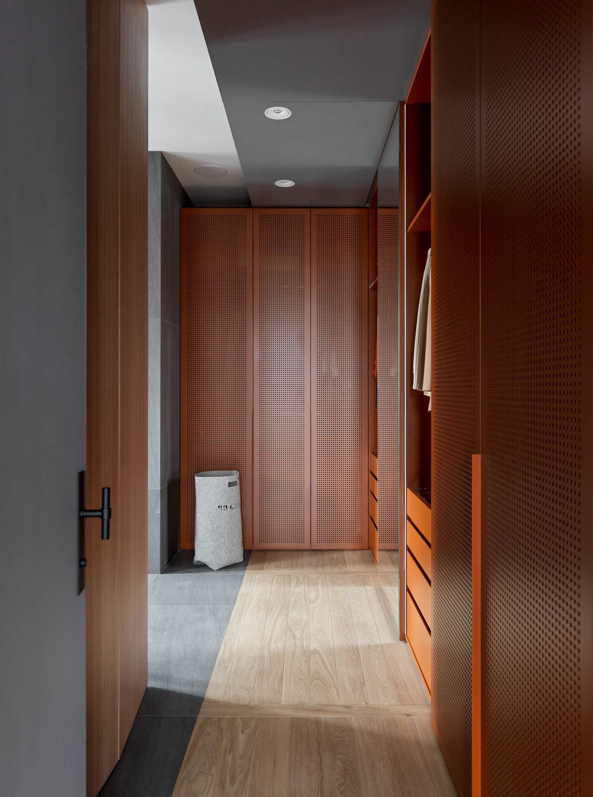 The planning solution zones the space into three blocks: a common living room,dining ,kitchen area and two blocks of bedrooms with en-suite bathrooms, and also, in the main bedroom, a dressing room. The circular movement in the block of the main bedroom unites areas that are compact in area, while maintaining a sense of spaciousness and providing ease of navigation around the apartment in various life scenarios. Also, such a solution makes it possible to ensure maximum natural insolation.
