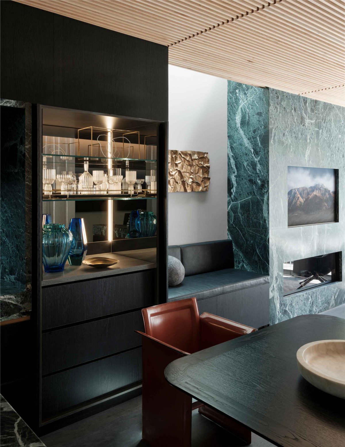 Nina Maya Interiors were intent on creating luxurious inner-city living through consideration for quality materials and craftsmanship, ensuring everything was handmade with custom finishes, this led to engaging a number of artisans. Together they worked with an elegant material palette of bronze, brass, marble, large format porcelain tiles, fluted glass and steel, as well as natural timber and textural fabrics. These materials are interwoven with subdued green, grey and salmon tones. The Glasshouse is also made unique through Nina Maya Interiors’ selection and placement of lighting. lighting is discreetly integrated into the ceiling, plasterwork and walls, while Arch Wall Light adds personality in the bathroom.