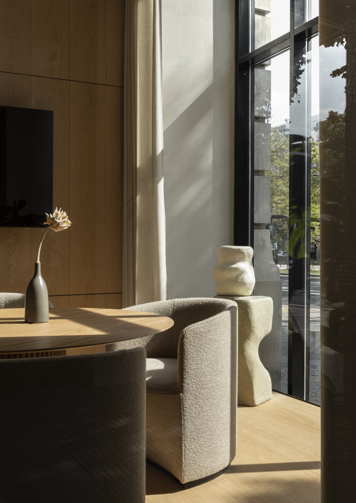 The entrance of the adjacent street level faces the outdoor avenue. The color of the linden tree planted on the sidewalk is cleverly introduced into the space, making it have a certain relationship with the site. At the same time, in order to strengthen this connection, the grey tiles on the floor are similar to the pavement on the outside, so that the street flows naturally into the interior space, achieving the connection between inside and outside.