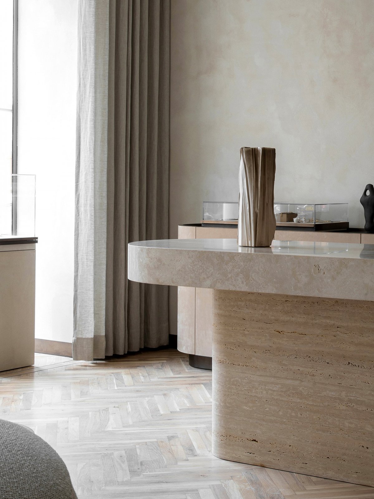 Along the entire back wall of the store stands a colonnade inspired by The neoclassical architecture of Copenhagen. The repeated niches between them create intimate Spaces where platforms alone display beautiful artwork on jewels and pure travertine. When a customer tries on a piece of jewelry, he can enter a more private area of the store, giving him the opportunity to fully immerse himself in the experience and allow creativity to unfold.