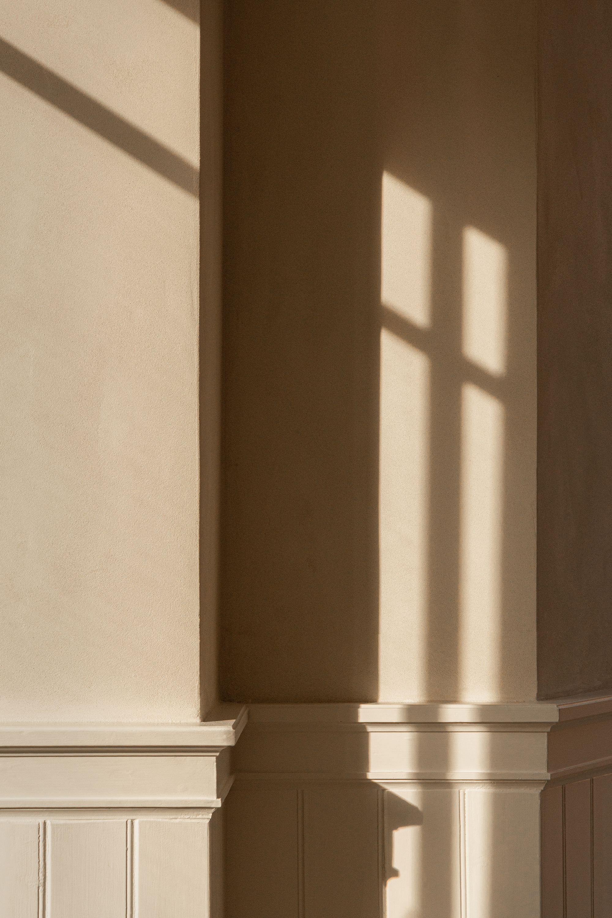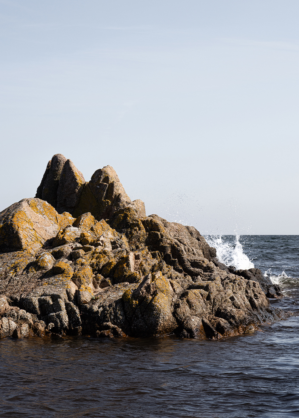 Every detail within the gallery is guided by intention. The interior unfolds an a composition of subtle contorture light and shadow, smooth and technical, refined, and new. Soft tones of sand, ooh, and stone mirror the landscape outside – the granite cliffs, the sea gems, and the pale northern light that filters through the windows. As the day passes, light moves slowly across surfaces of oak, linen, and paper, revealing the quiet poetry in their textures. This gentle honesty lies at the heart of the project.