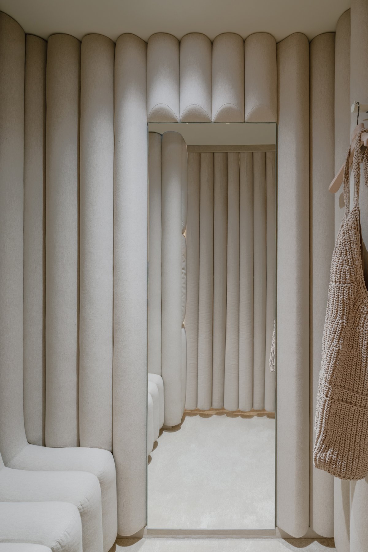 From pillows reminiscent of the textiles of Provence to terracruda, a clay-based material echoing the landscape of the south of France, the boutiques are clad entirely in a single material, creating continuity throughout each space. In the store at the Galeries Lafayette in Paris, the walls, doors, fitting room, and display elements are upholstered in white cushioning, exuding the ease and comfort of a day spent in bed.