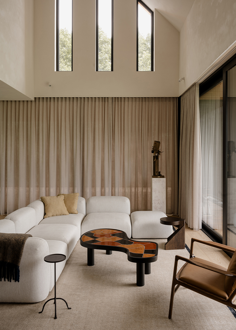 The result is a space deeply rooted in its context: the architecture, the landscape, and the lifestyle of its owners. Calm and timeless, the house combines natural materials, art, and bespoke furniture into a coherent and sensitive whole. It is a place that invites one to live in harmony with nature and in the rhythm of its residents.