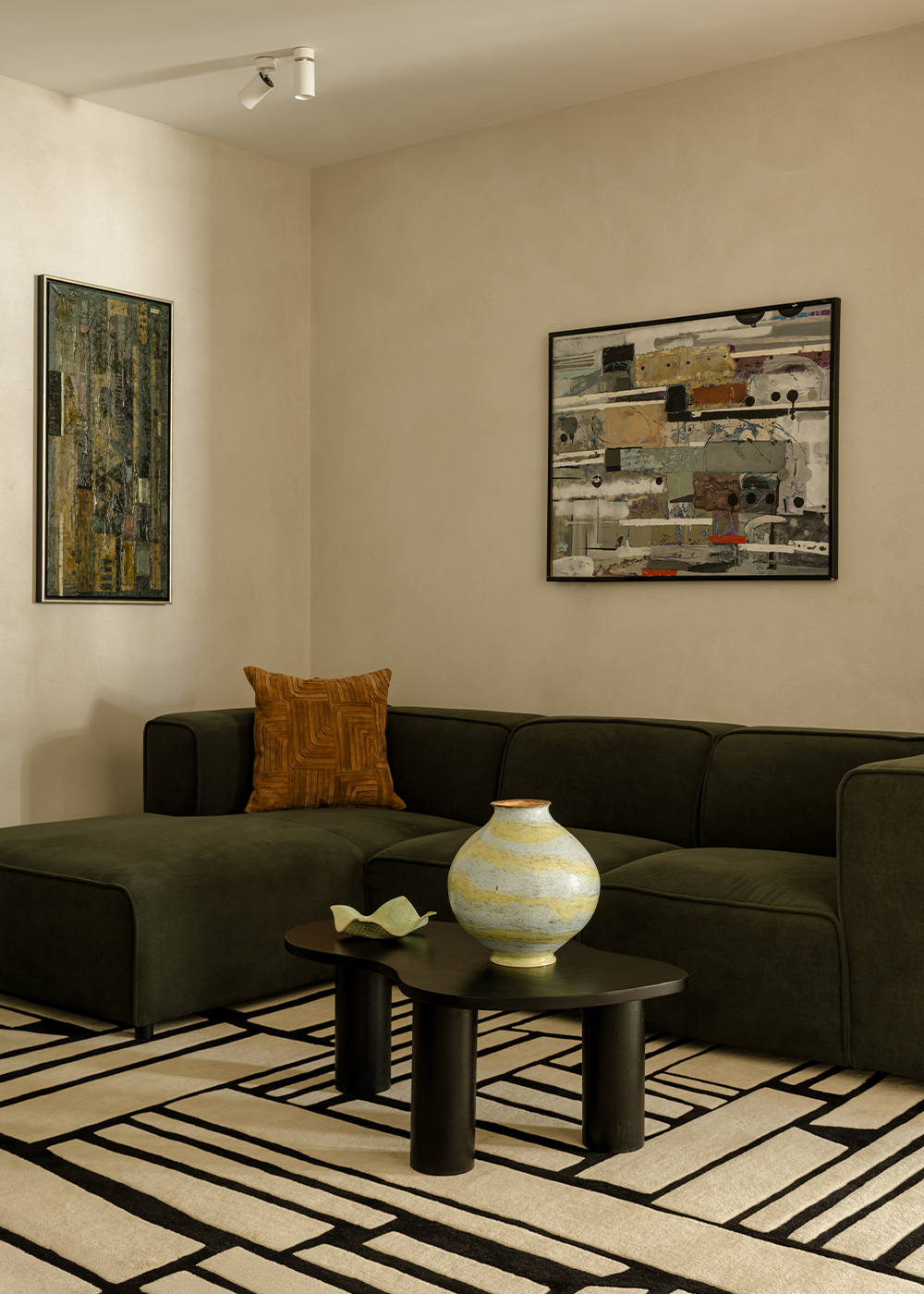 This 60 m² apartment near Nowy Kleparz in Kraków was designed for a close friend – painter Roman Kondratiuk. The goal was to create a comfortable living space that also works as a personal gallery, allowing the interior to complement his expressive art. Subtle contrasts in materials and colour help balance the artworks without dominating them.