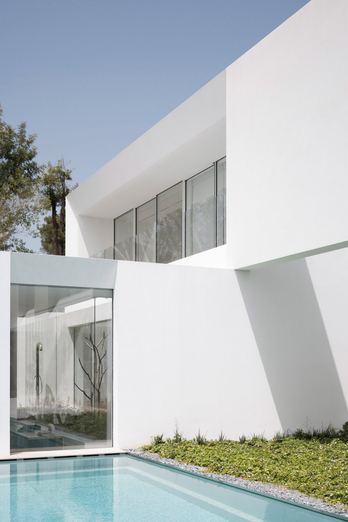 The clean-cut architectural volumes and subtle compositions, finished in a special breathable lime-based render, set the mood. The abstract almost sculptural contour adds to the sense of mystery as shadow and light move through the spaces, while also emphasizing the dimension of depth glimpsed through the facades.