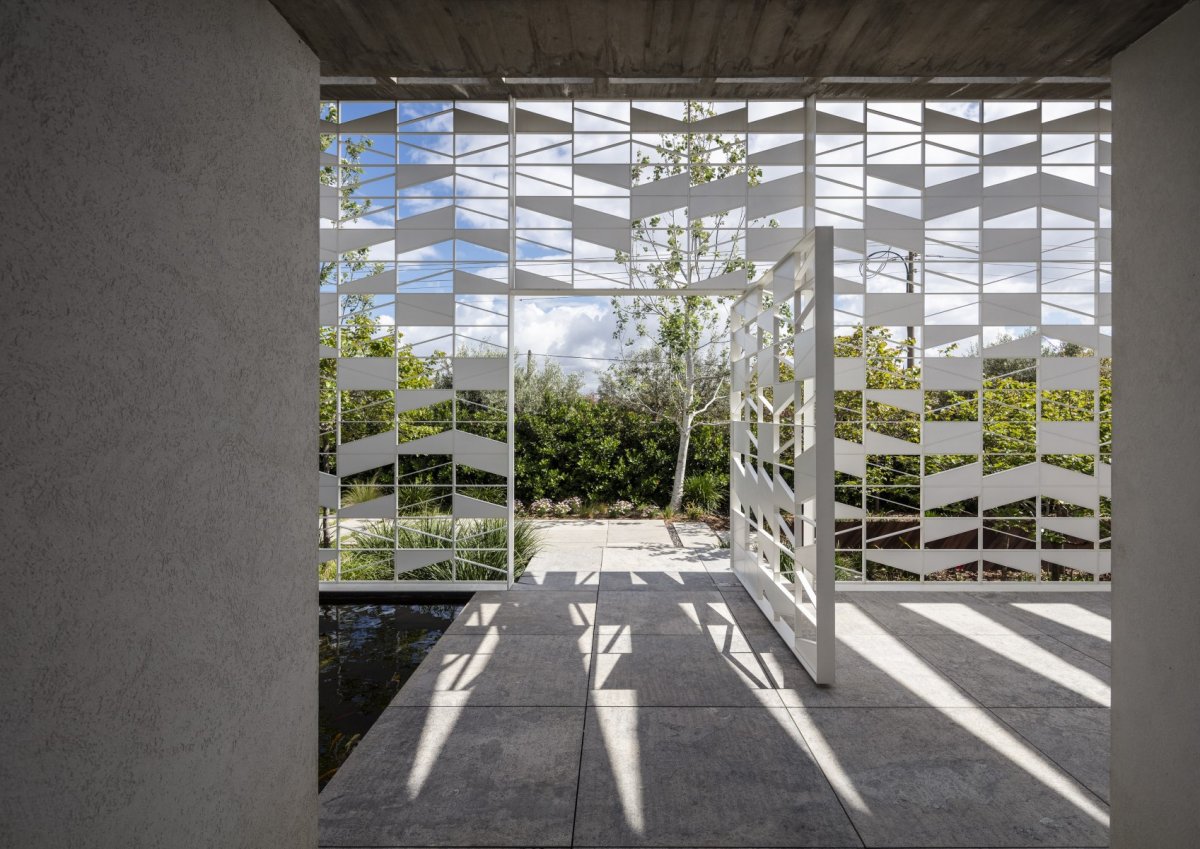 Pitsou Kedem Architects principal idea was to create a layered building design. An aluminum wall was designed for the entire façade to form a kind of perforated outer envelope, enwrapping the building and creating another layer between the house and the street and neighbors.