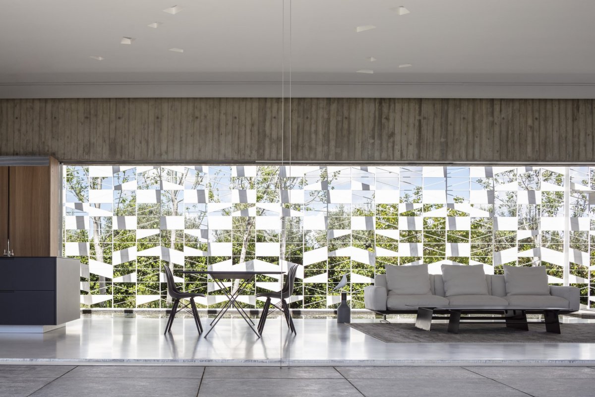 The aluminum wall was created with a repetitive pattern so that light could penetrate it and introduce dramatic shadow play throughout the day in keeping with the movement of the sun. The openings allow one to glance out to the environment or into the house; they allow natural light to penetrate the house by day, and artificial light to shine outwards at night. Additionally, the slashed and perforated envelope forms a sort of minimalist and polished object that emphasizes the monastic and tightly-controlled language the designers chose to use.