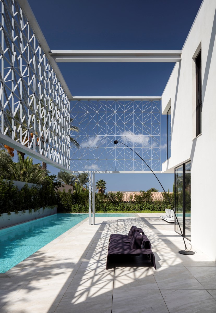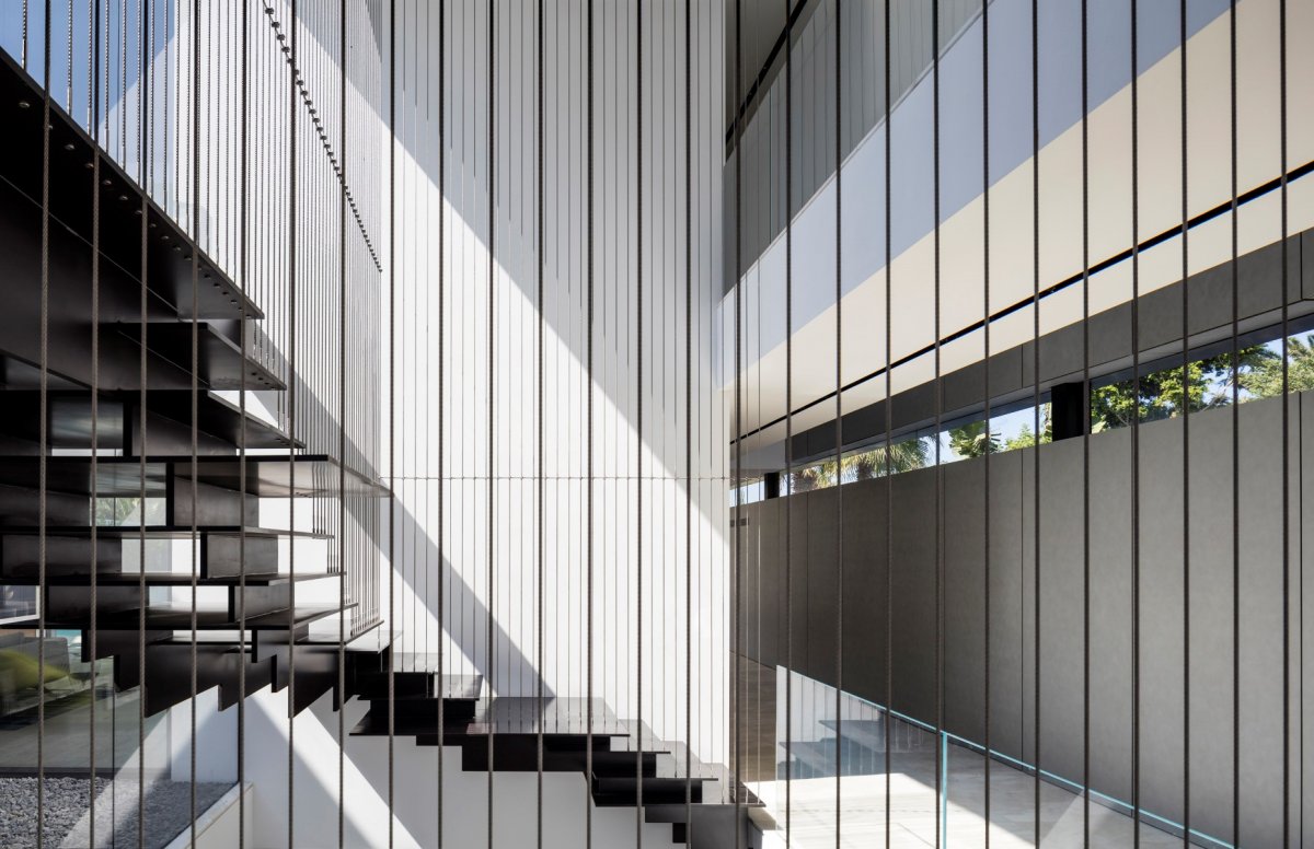 The second stage is beyond this wall, at a more private entrance hall that reveals the house and yet is separated from it with a glass wall. The third stage is at the main front door where there are two hallways – the main one crosses through the house whereas the second leads to the guest bathroom. The fourth stage is when moving along the main hall, which at its left is an internal patio rising three stories high, and housing both the staircase and a sitting area.