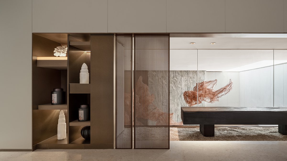 Starting from the concept of architecture and landscape, the outdoor pine branches quietly enter the room through the floor-to-ceiling glass door of the teahouse, while a dwarf pine stands quietly beside the indoor tea table, forming a sense of asymmetrical balance of the established picture. In the dark space of the negative floor, the hanging pictures with golden background and the transparent platinum crystal tea set reflect the faint light. It is a joy to drink alone or drink with relatives and friends.