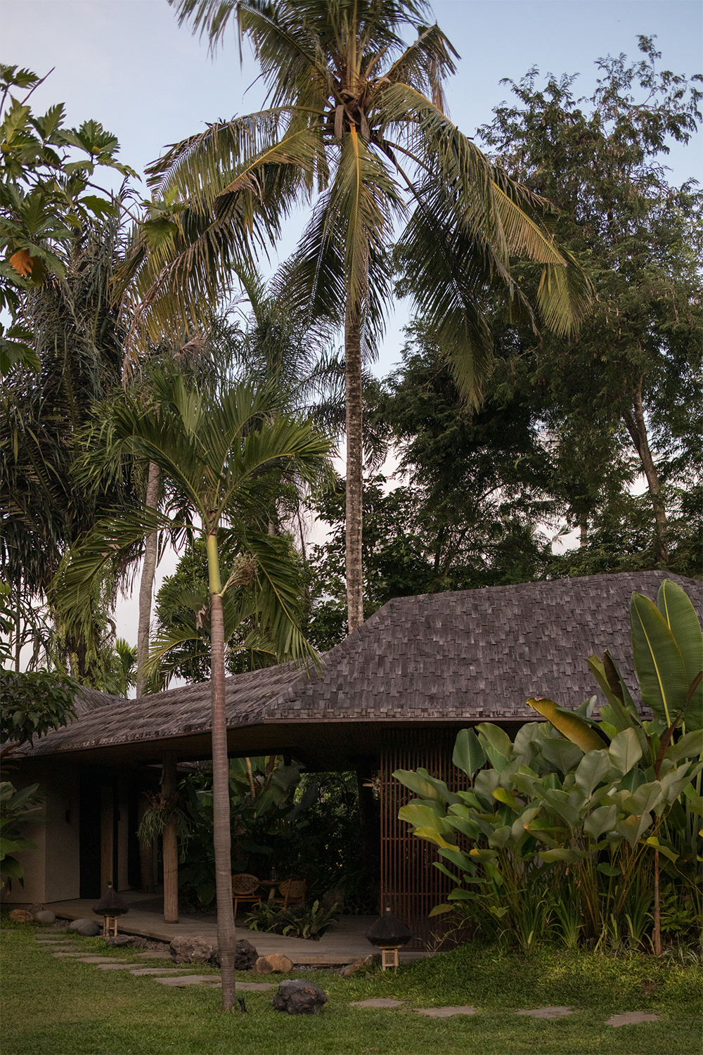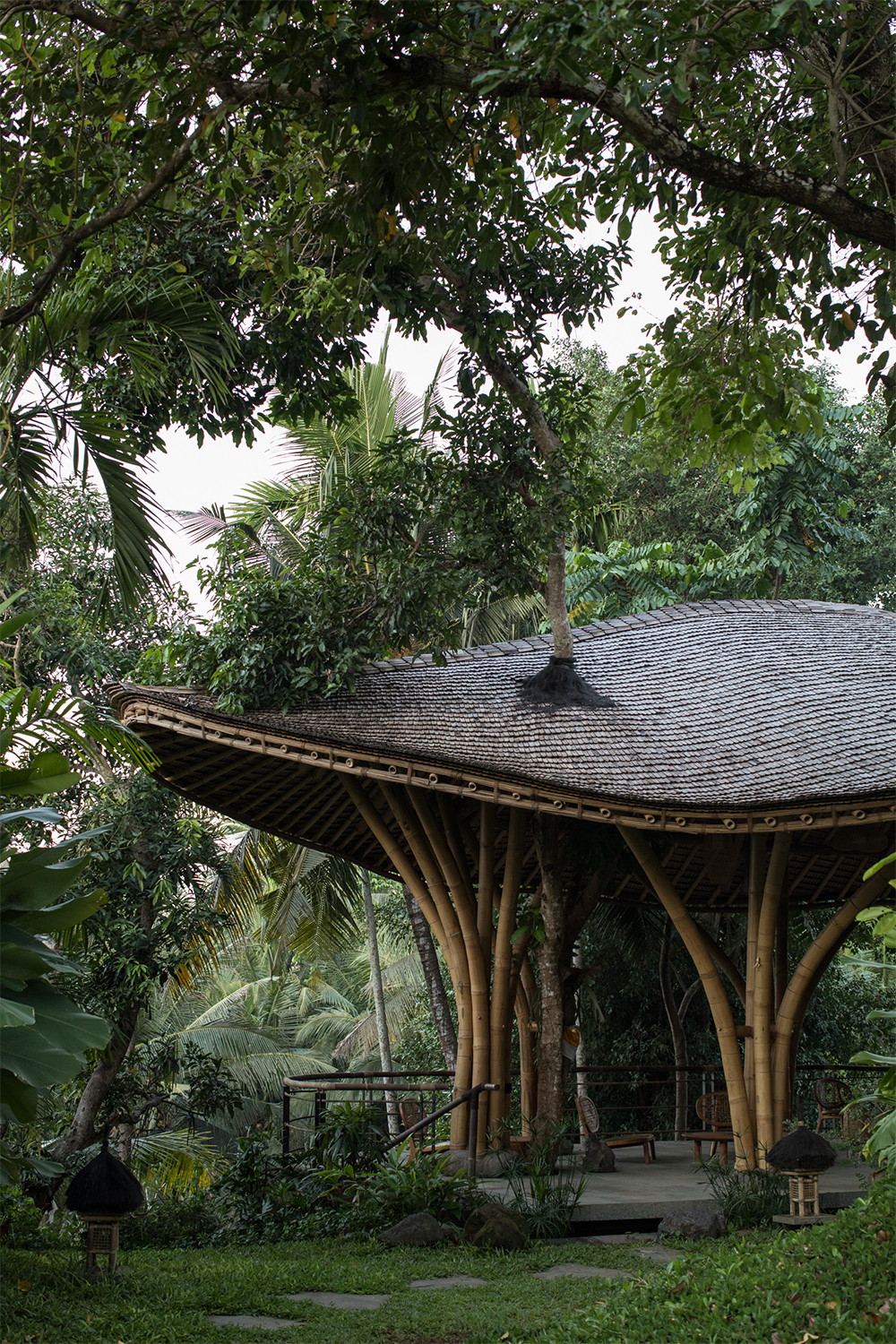 Rather than introducing a new aesthetic, the architectural intervention was designed to integrate seamlessly with the existing context, and complement the foundation’s amphitheatre and stage. The project merges architecture with landscape as a seamless, living system: adapting to the land, honoring native vegetation, and allowing nature to lead both form and experience. Built in part from natural materials found on-site—salvaged wood, bamboo, volcanic stone, and handmade terracotta—the structures weave around existing trees, follow the land’s contours, and open toward the light and quiet of the rice fields. Interiors were created in close collaboration with local artisans, with all furniture and fixtures custom-made for the site.