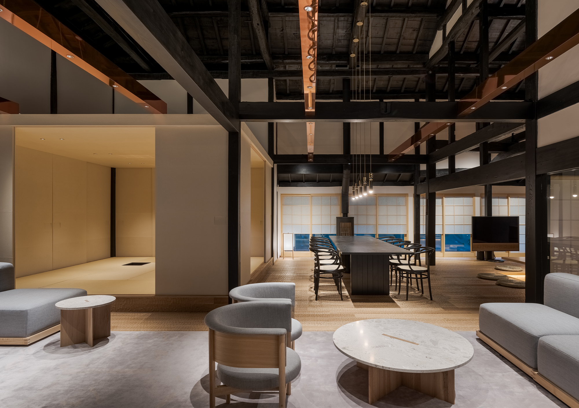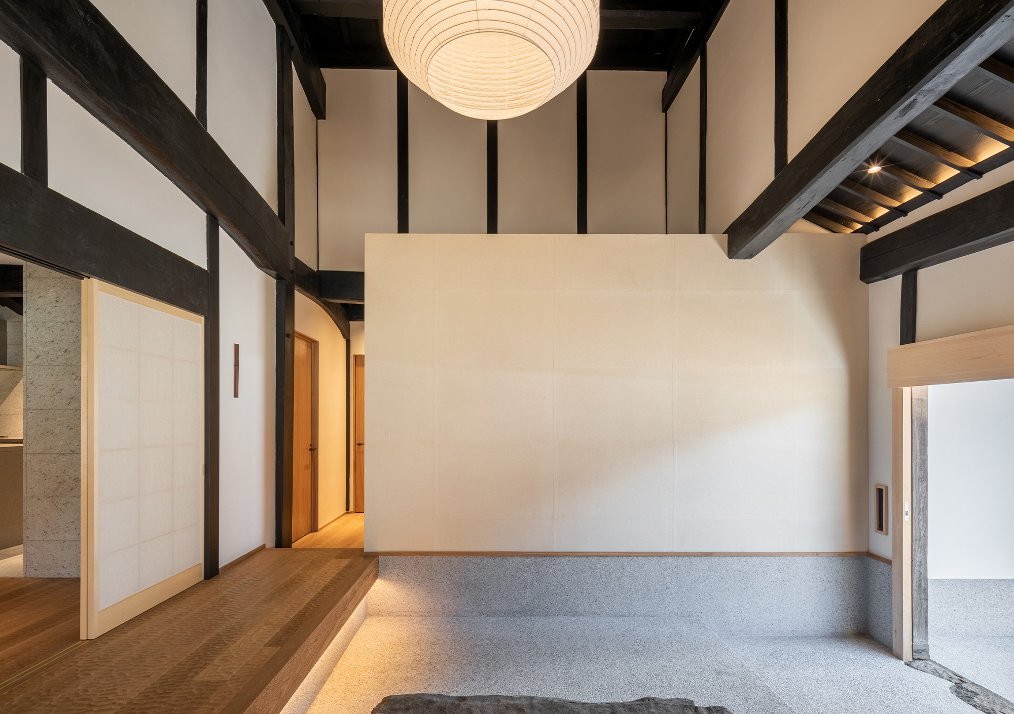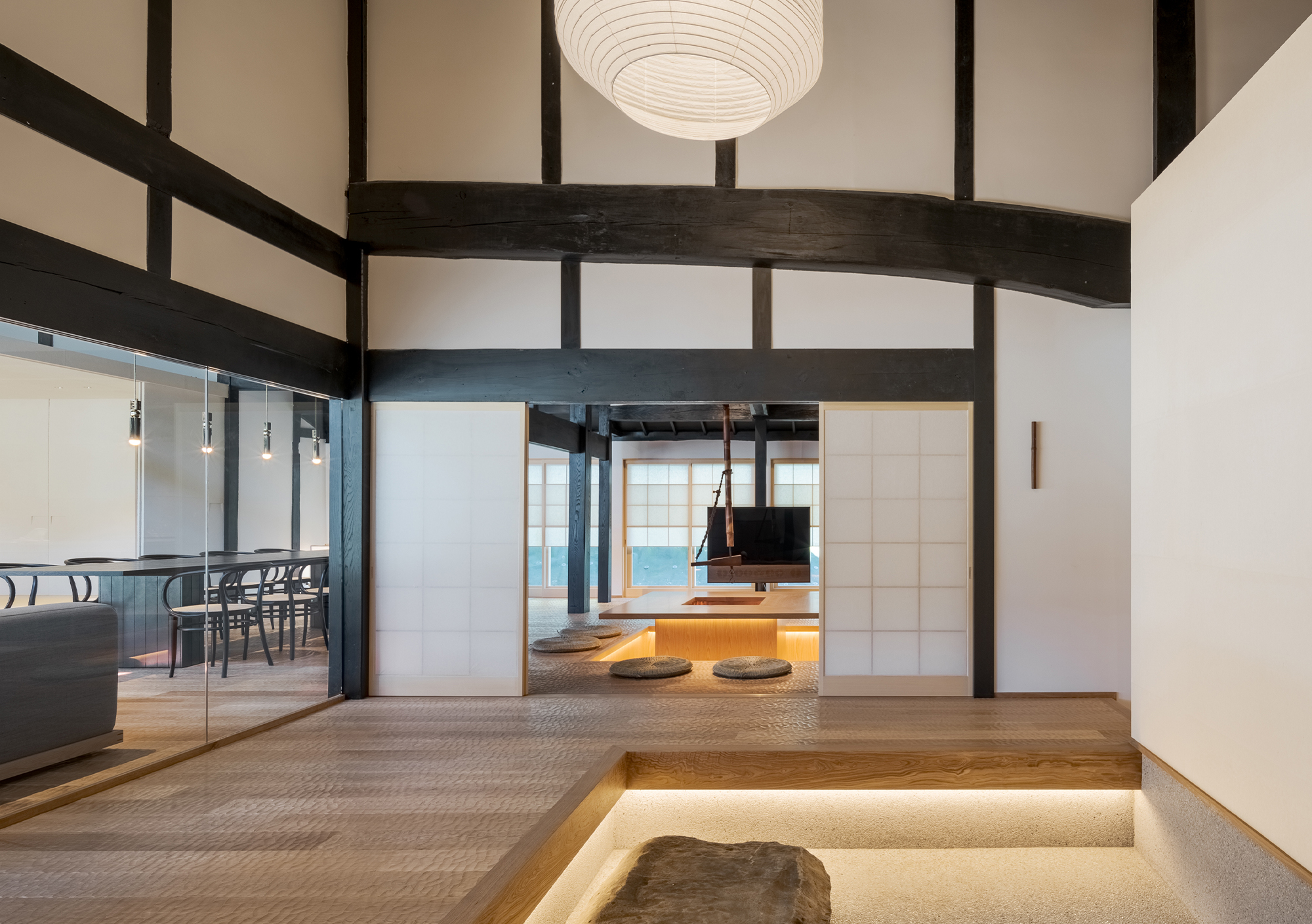 For the floor plan zoning of the main house, we made use of the Igura-zukuri characteristics of having four rooms arranged in squares partitioned by sliding screen doors, and an entrance and bath near the earthen floor in the southeast side. The toilet that was located on the northwest side was moved near the bath, more considerate of modern living. To make the most of the four spaces arranged in squares, we designed a dining room with an original 10-seat table to enjoy meals with large groups, a sunken hearth space with a sunken kotatsu table, providing a connection with the unchanging scenes of the past, an expanded living room area, with Naguri chiseled flooring on the veranda, and a Japanese-style room with a raised tatami floor for tea ceremony or playing the shamisen. We brought in Wataru Hatano, a papermaker from Kurotani Washi, to apply Japanese paper to the ceiling, walls, and sliding screen doors.