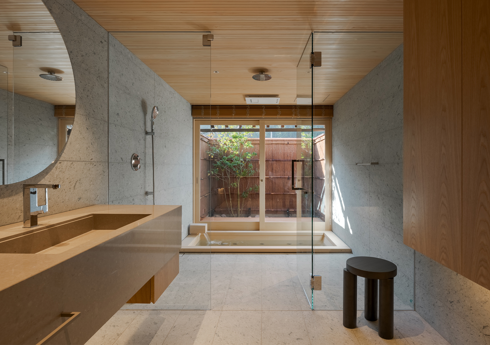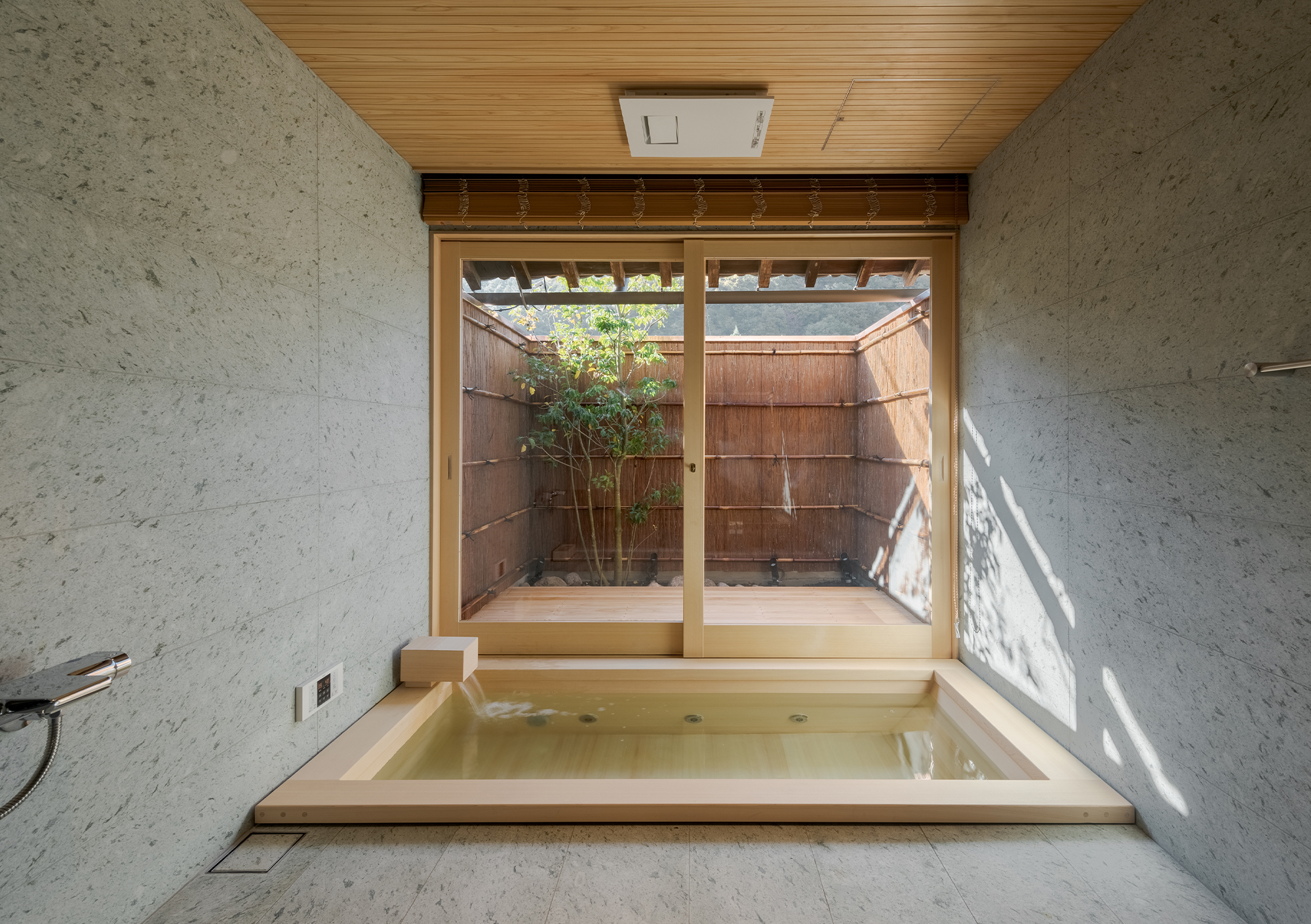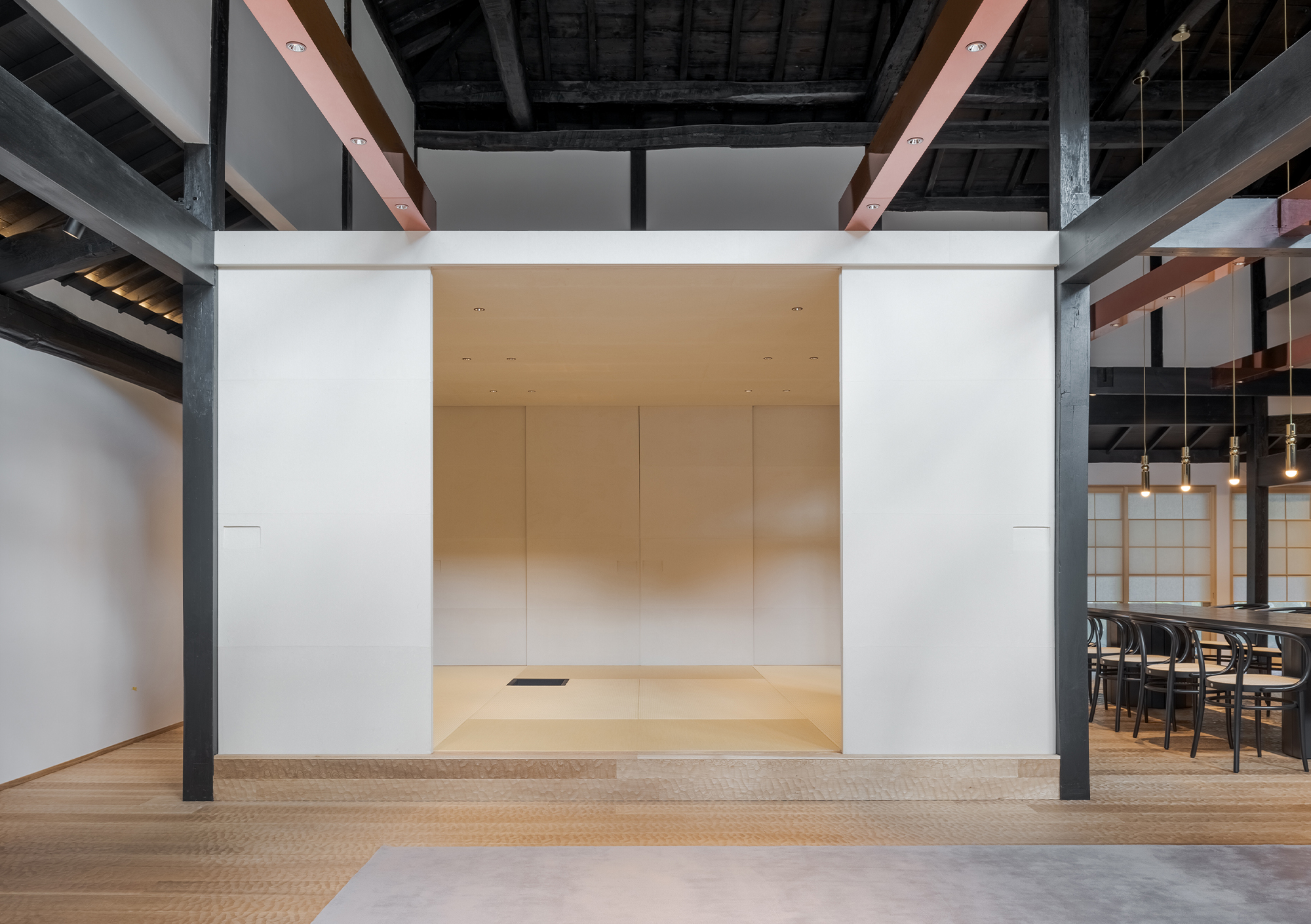 For the floor plan zoning of the main house, we made use of the Igura-zukuri characteristics of having four rooms arranged in squares partitioned by sliding screen doors, and an entrance and bath near the earthen floor in the southeast side. The toilet that was located on the northwest side was moved near the bath, more considerate of modern living. To make the most of the four spaces arranged in squares, we designed a dining room with an original 10-seat table to enjoy meals with large groups, a sunken hearth space with a sunken kotatsu table, providing a connection with the unchanging scenes of the past, an expanded living room area, with Naguri chiseled flooring on the veranda, and a Japanese-style room with a raised tatami floor for tea ceremony or playing the shamisen. We brought in Wataru Hatano, a papermaker from Kurotani Washi, to apply Japanese paper to the ceiling, walls, and sliding screen doors.