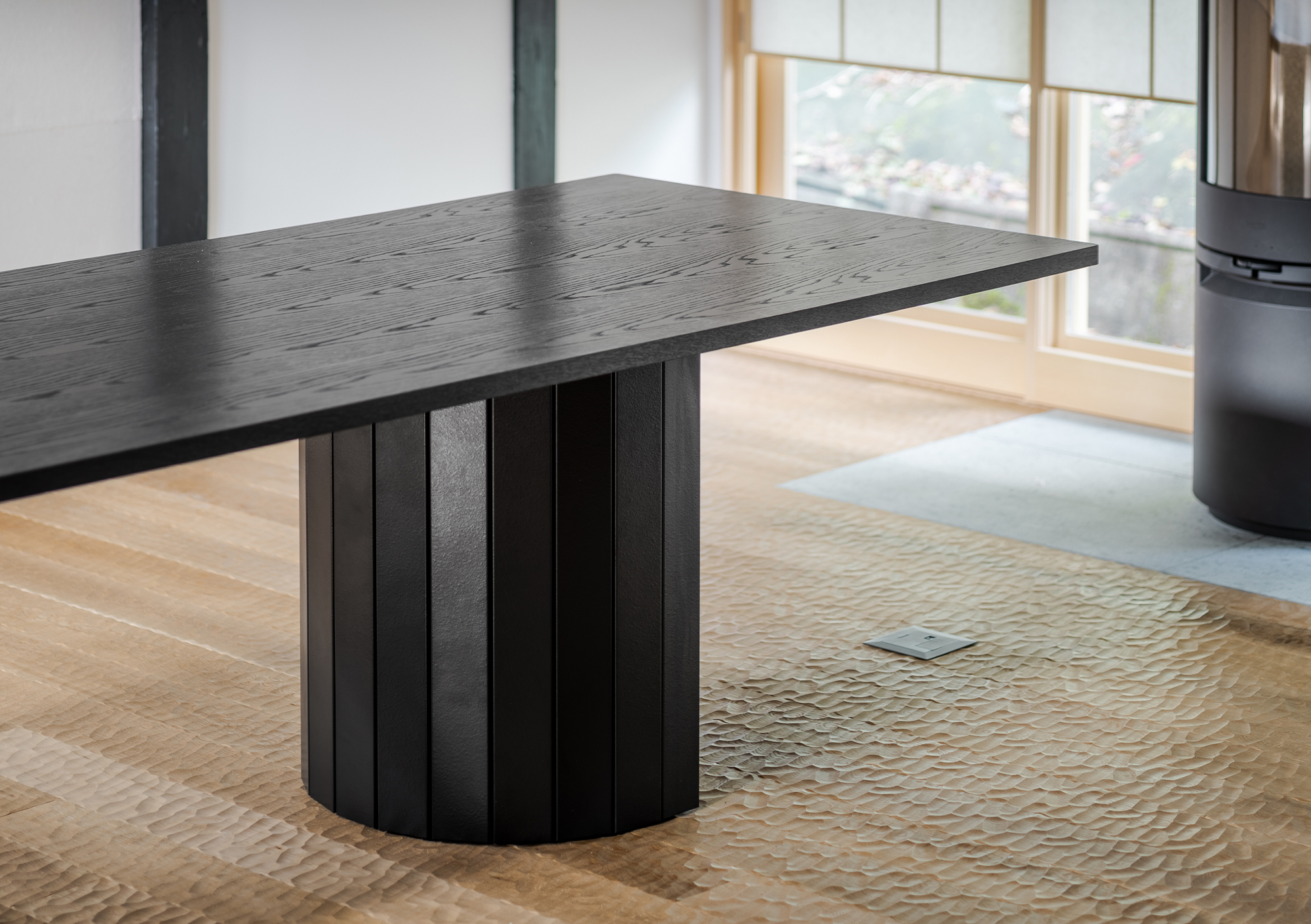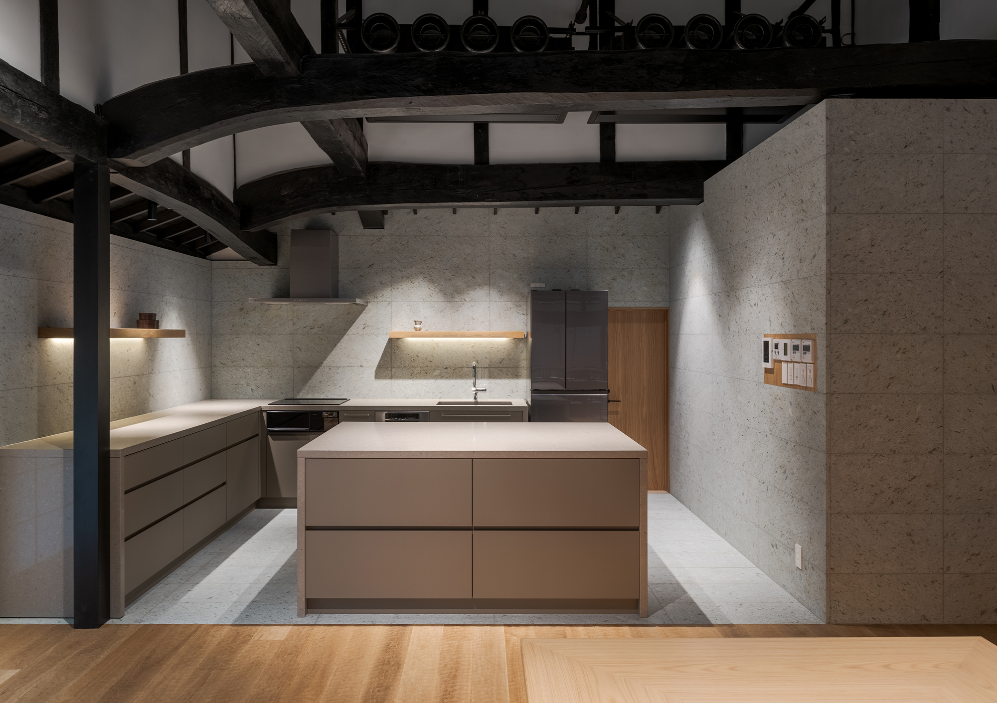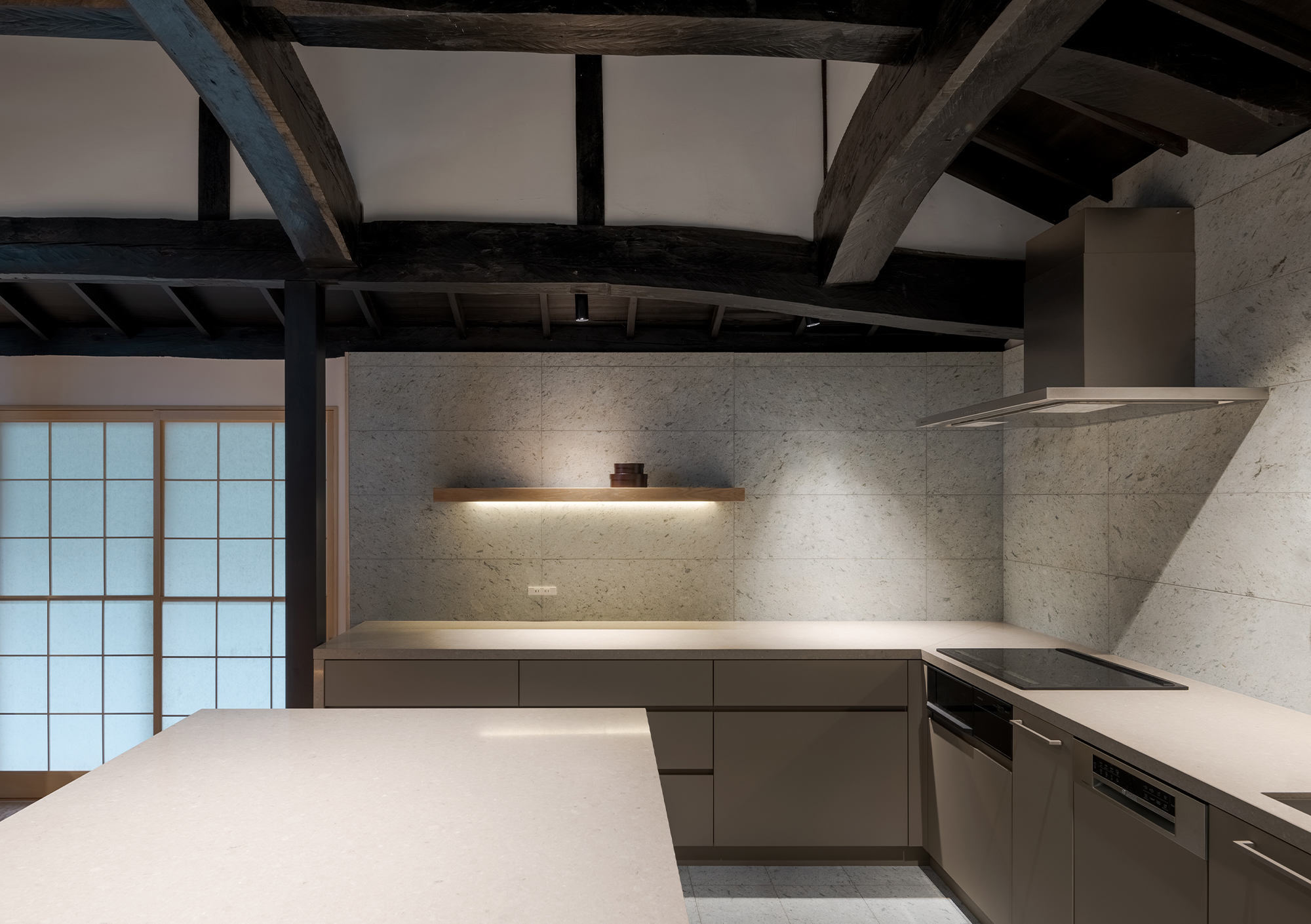 For the kitchen and bathroom, we used the natural green color of Towada stone to contrast with the black and beige tones for an organic effect. The pillars, beams, and kamoi that support the entirety of the 8m open space had been smoked black by the charcoal from the hearth, and we followed this style by finishing them in a dark charcoal stain. At first glance, the area is separated into four separate squares, but we overlapped the floor material and furniture placement to sublimate them into a single connected space.