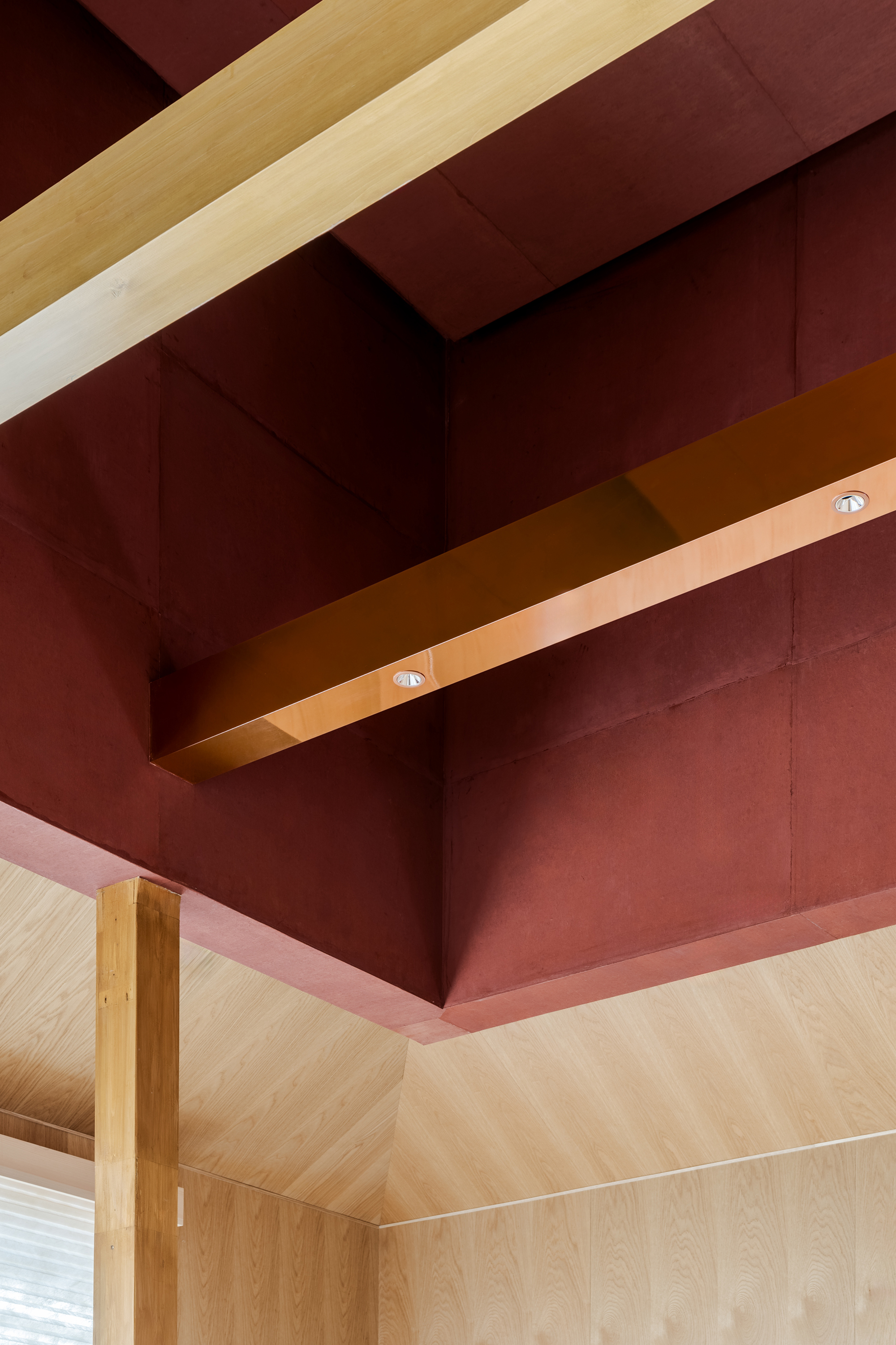 The standard method for lighting design when renovating this style of old Japanese house is to install wiring duct rails on existing beams and create direct light using spotlights. Instead, we scattered downlights along copper-colored pseudo-beams placed between the existing beams to serve as both indirect and direct light, using this modern technique to lead the way to richer living.