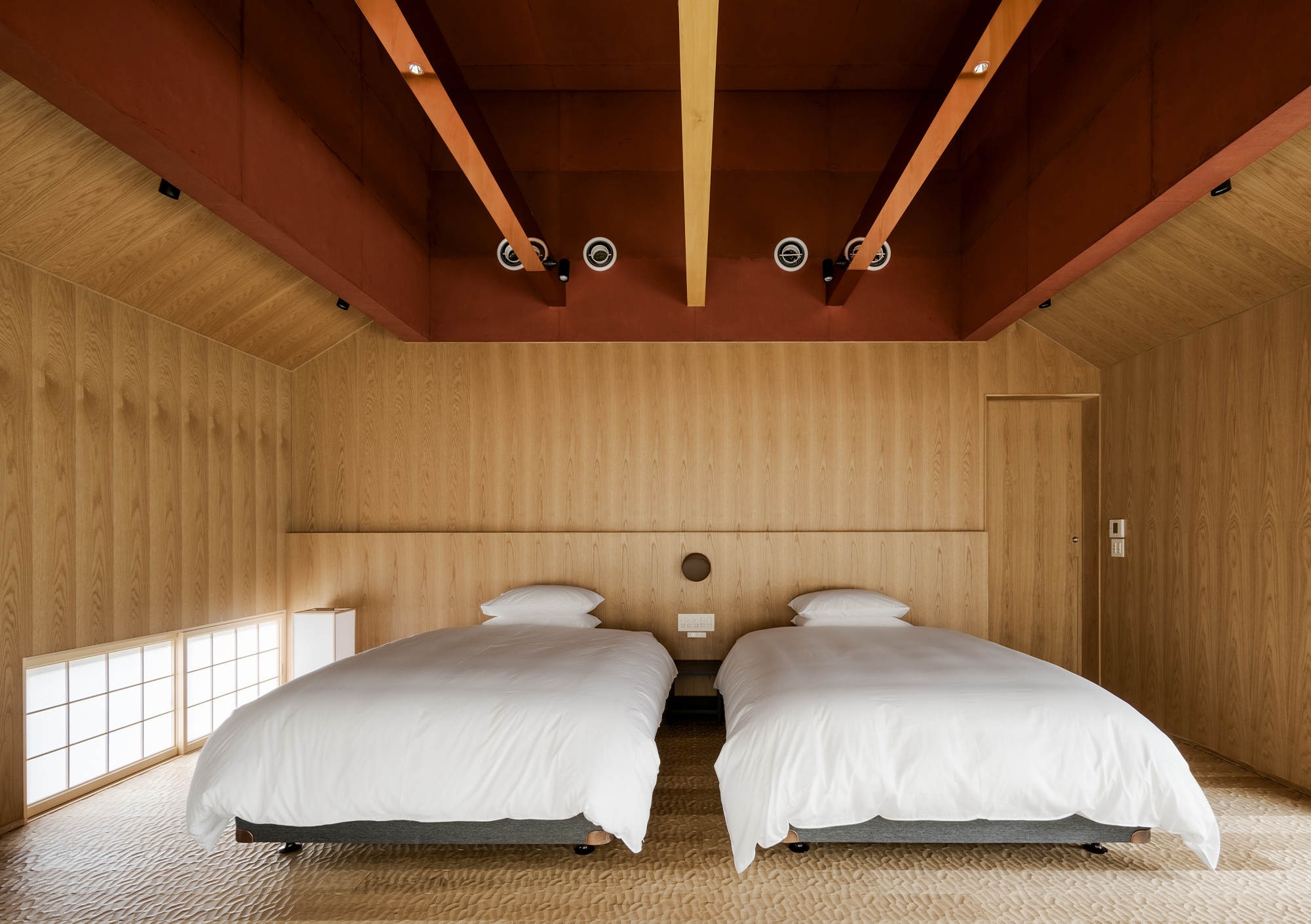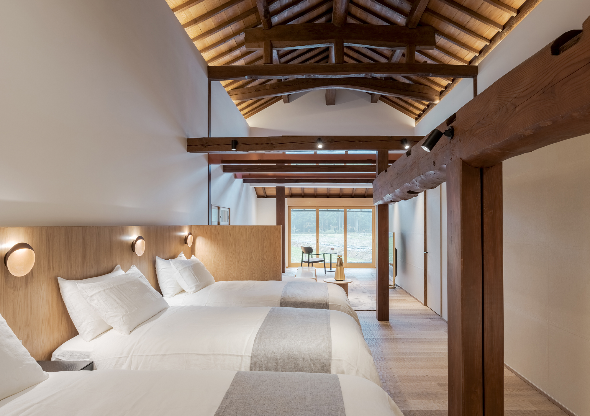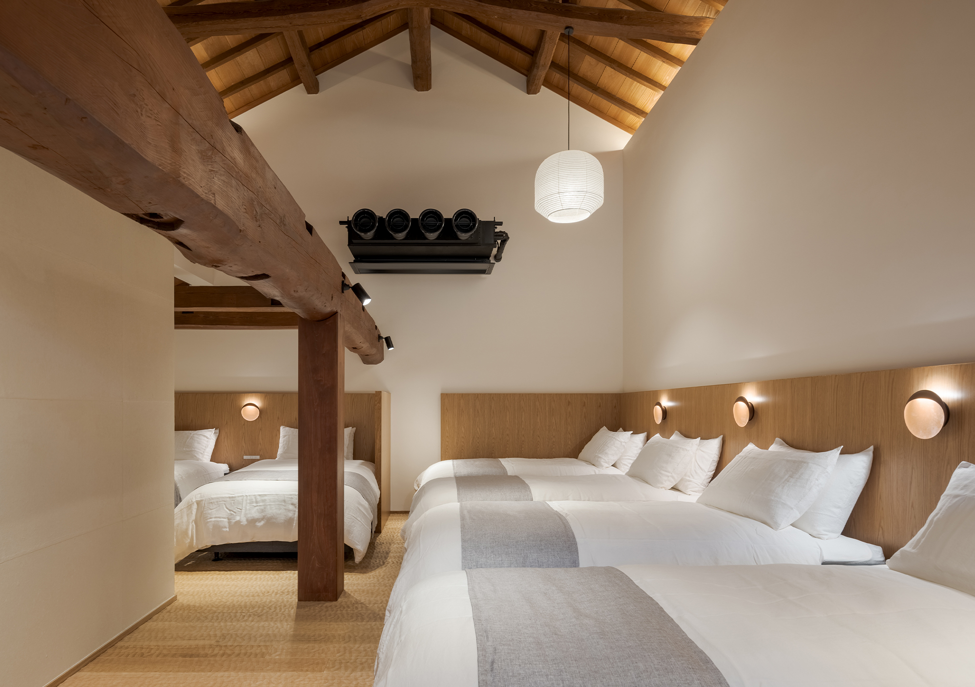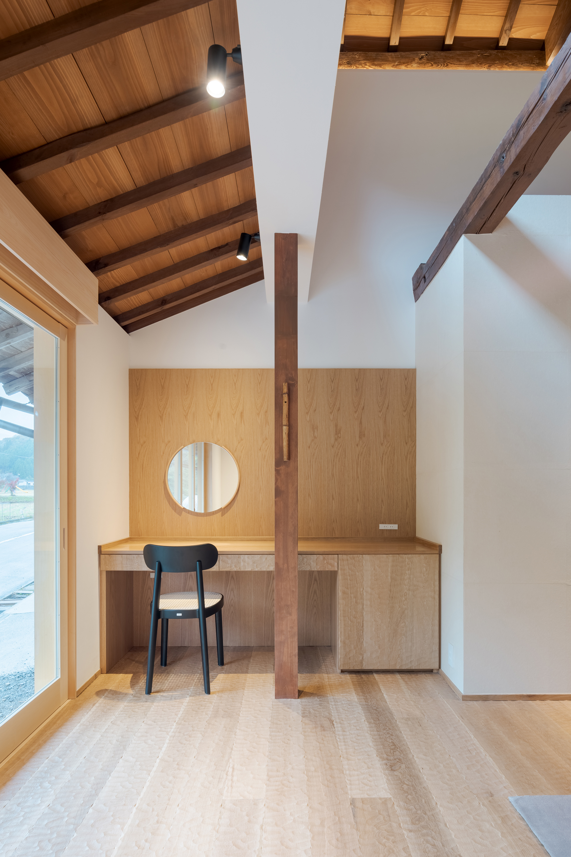 During the inspection, we found that although there was a second floor, there are no stairs, and it is only accessible by climbing an old wooden ladder, and on the outside, there was an upper and lower roof which had been covered with red roof tiles until a few years ago. After recognizing that it had originally been built in the Igura-zukuri style of the Kamo region in Hiroshima — a form that had long since faded from fashion — we began the renovation by quietly restoring its original illusion: a one-story house with an open floor plan that, from the outside, appears to be two stories. The barn, which we designed as a guest room, was used for cattle in the past, and unlike the main house, it has no vertical and horizontal planes. The wooden frame was also constructed rather roughly, making planning the design extremely difficult.