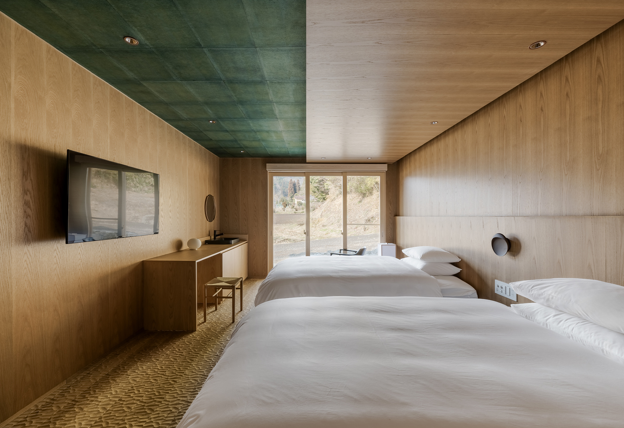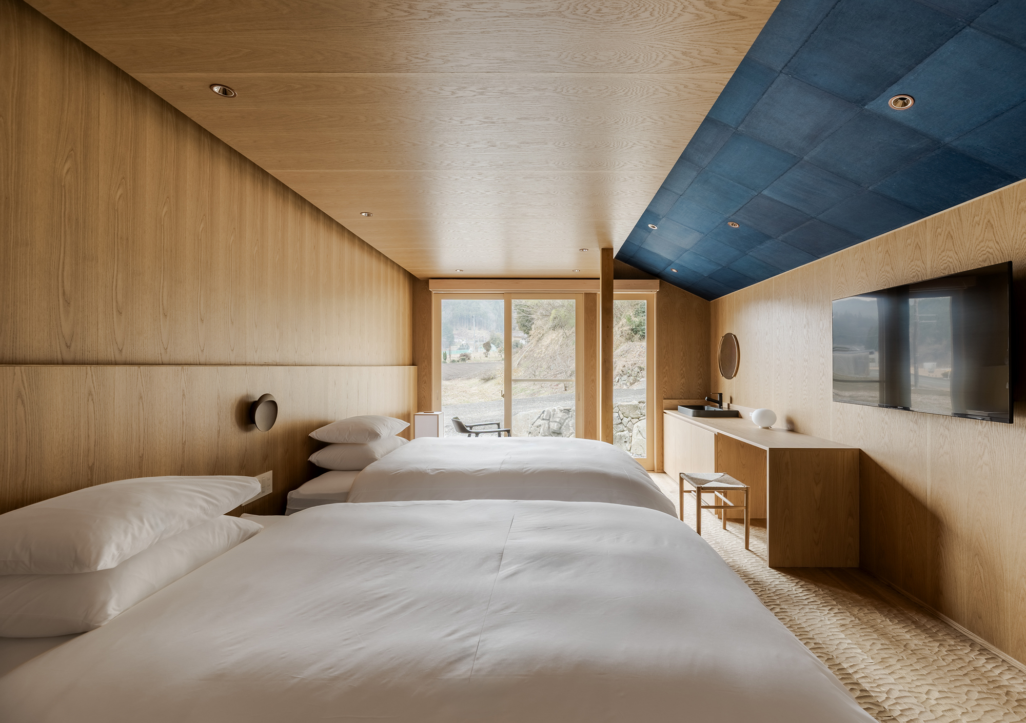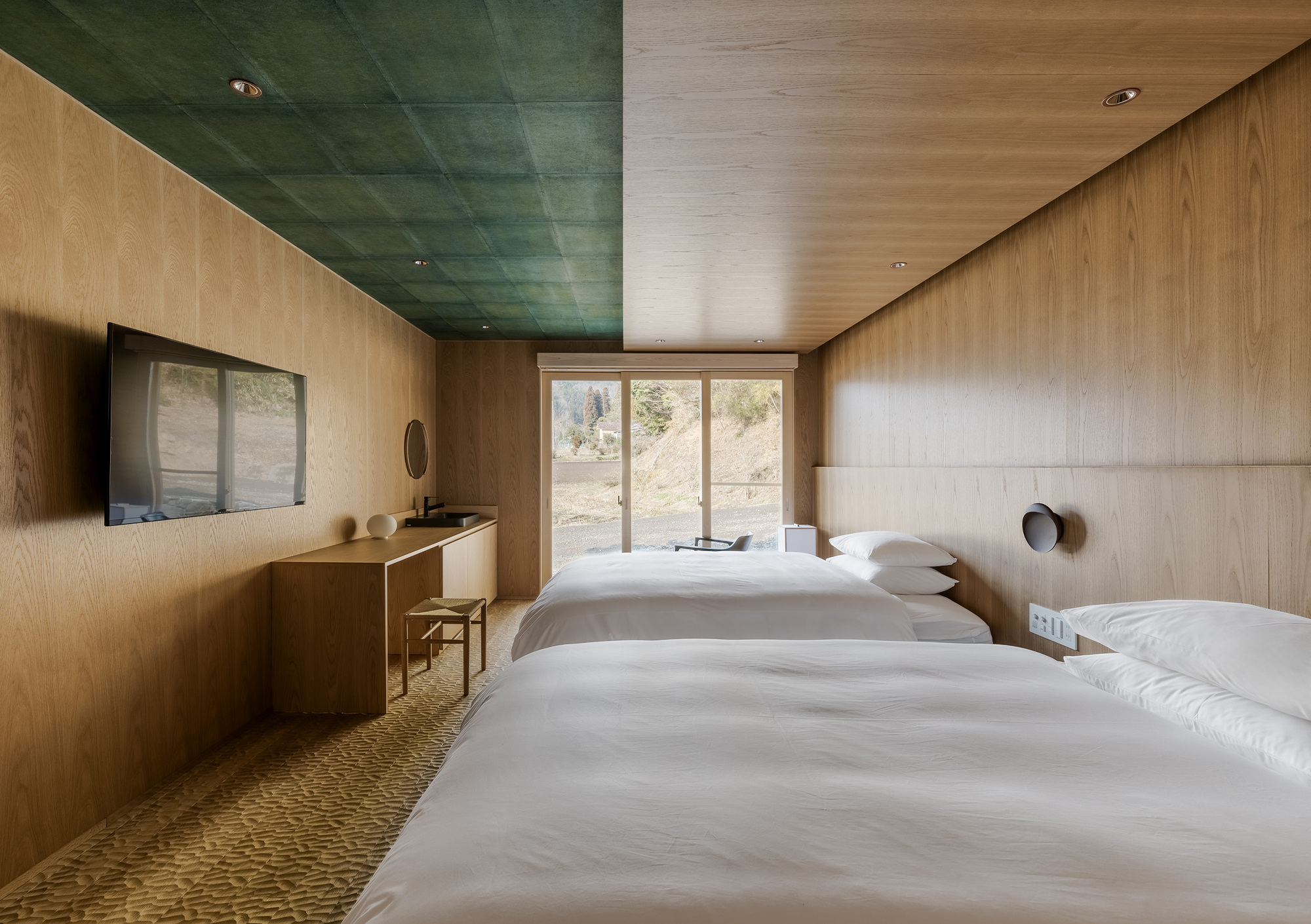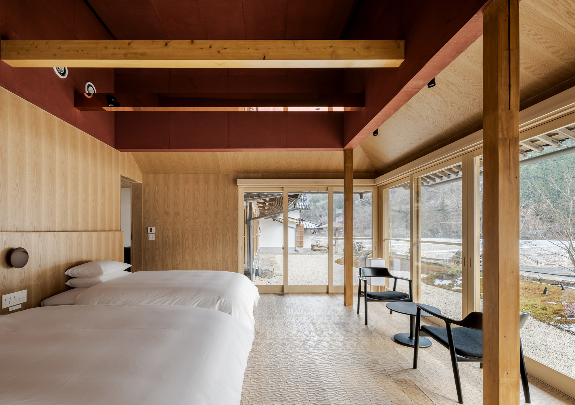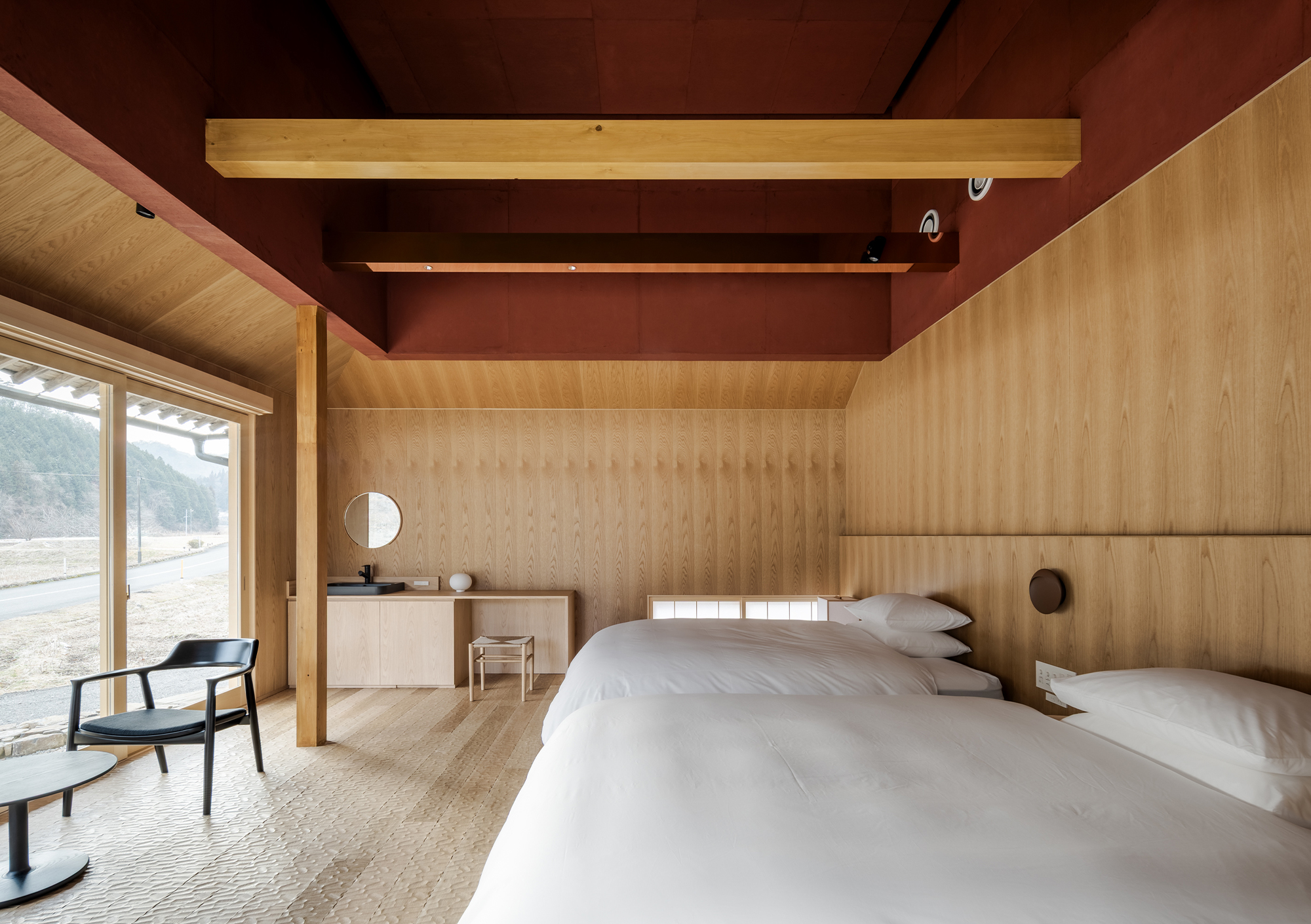 During the inspection, we found that although there was a second floor, there are no stairs, and it is only accessible by climbing an old wooden ladder, and on the outside, there was an upper and lower roof which had been covered with red roof tiles until a few years ago. After recognizing that it had originally been built in the Igura-zukuri style of the Kamo region in Hiroshima — a form that had long since faded from fashion — we began the renovation by quietly restoring its original illusion: a one-story house with an open floor plan that, from the outside, appears to be two stories. The barn, which we designed as a guest room, was used for cattle in the past, and unlike the main house, it has no vertical and horizontal planes. The wooden frame was also constructed rather roughly, making planning the design extremely difficult.