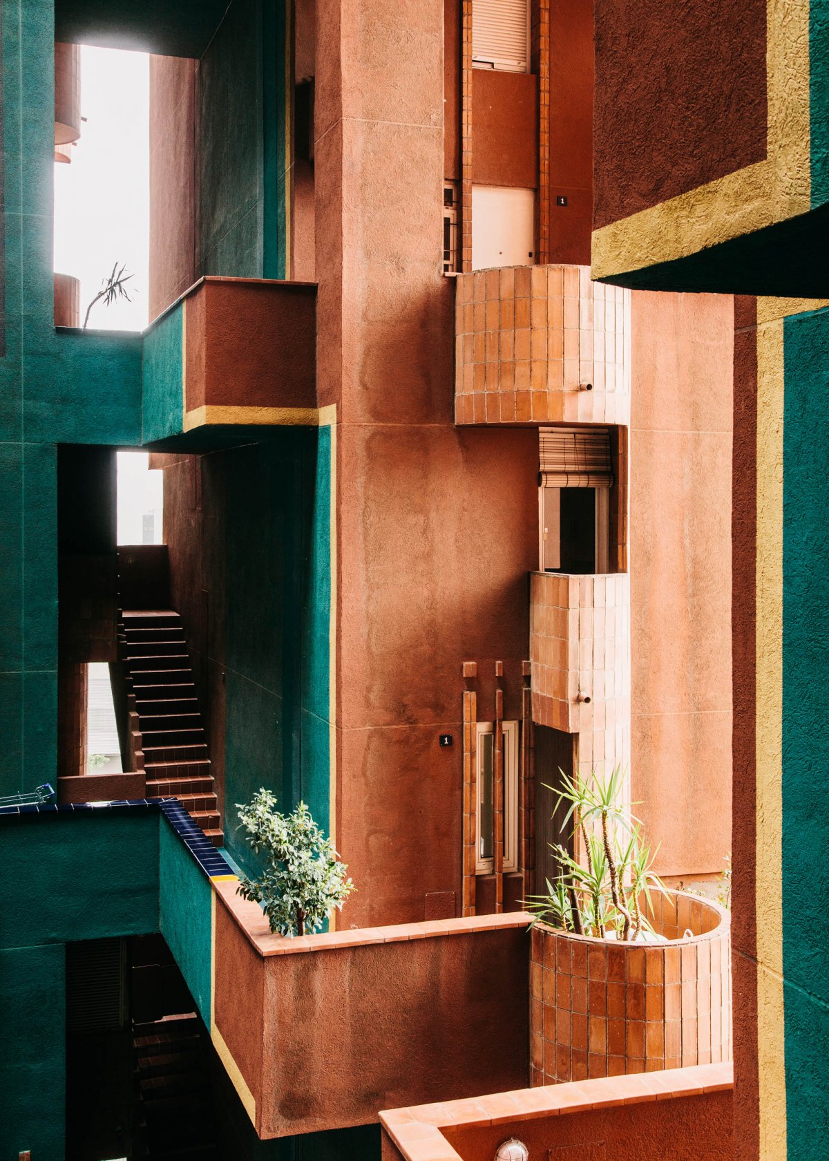 A terracotta-coloured façade is a nod to the Algerian desert, while a cooling turquoise blue in the interior takes its cue from North African medina, prompting many residents to refer to the building as “The Kasbah”. A mixture of garden furniture and pot plants scattered throughout are reminiscent of a traditional Spanish village. In a break from the region’s love affair with modernism, the building prefers jagged structural lines that resemble a distorted Rubik’s cube.