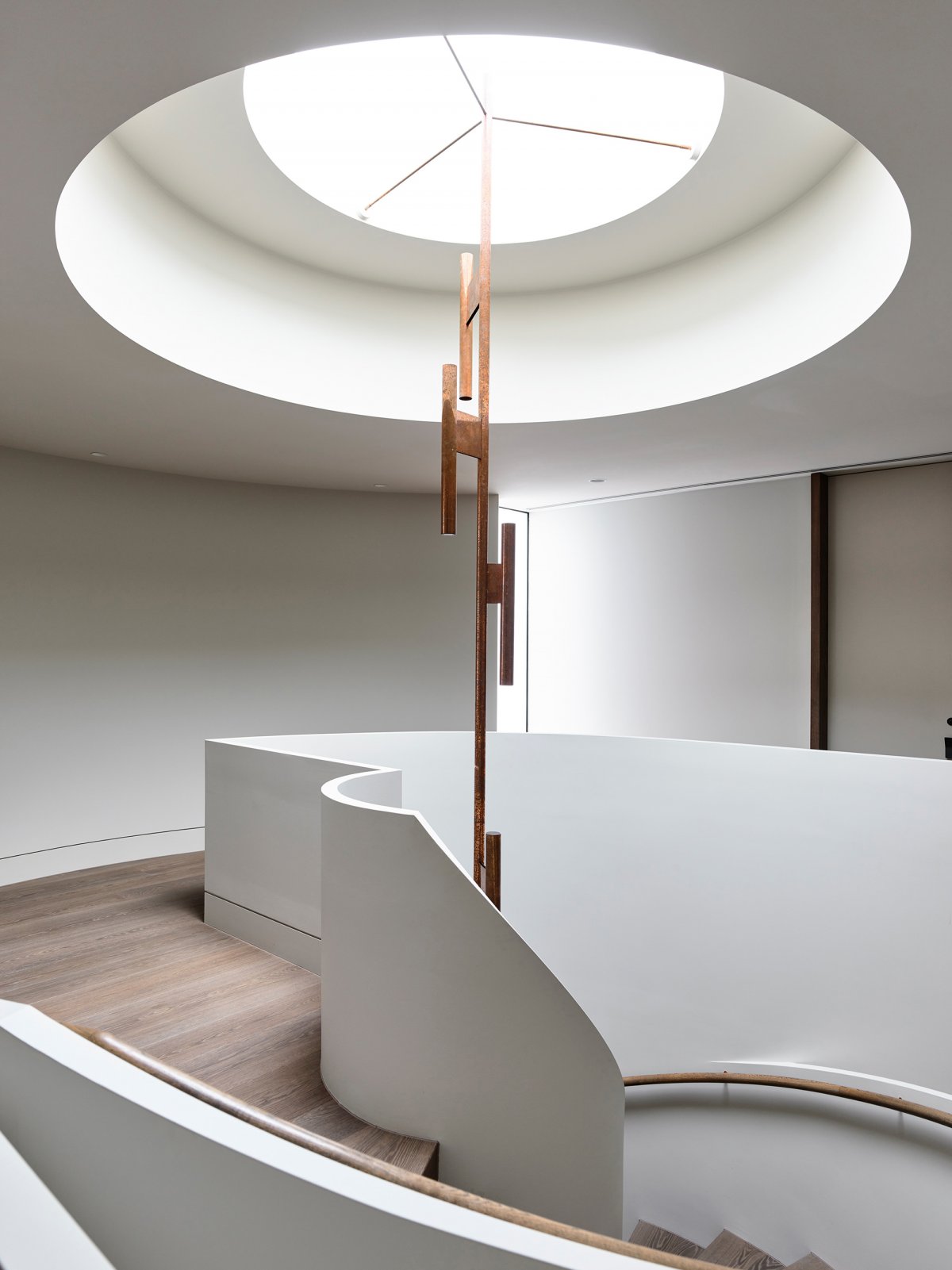The vestibule features an extensive spiral staircase, 4 meters wide at its widest point, threaded from top to bottom by bronze sculptural lights. In terms of natural light, a wide circular skylight is located at the top of the spiral staircase, and a smaller skylight in the master bathroom enlivenes the space with light changes at different times of the day.