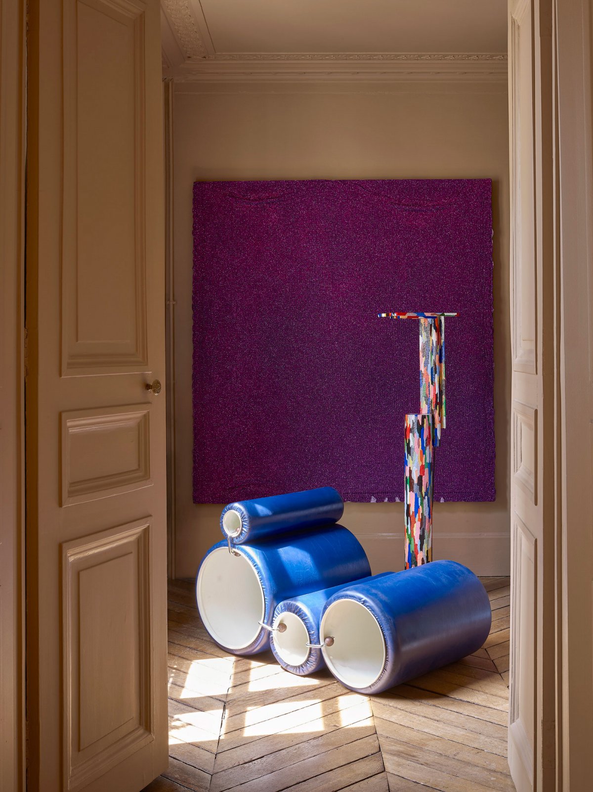 The artistic flourishes are equally outlandish, with a polymorphous sculpture by Simonnet, a‘Les Pesquiers’sculpture by Olivier Millagou, and a‘Violet Night’rendition by Jacin Giordano.There’s also a Stool Zindi by Charlotte Thon and Marc Boinet (inspired by royal nuptial stools from Nigeria),golden bronze rods from Maison Intègre,and Allpa-Qucha-Pacha vases by Jean-Baptiste Fastrez.