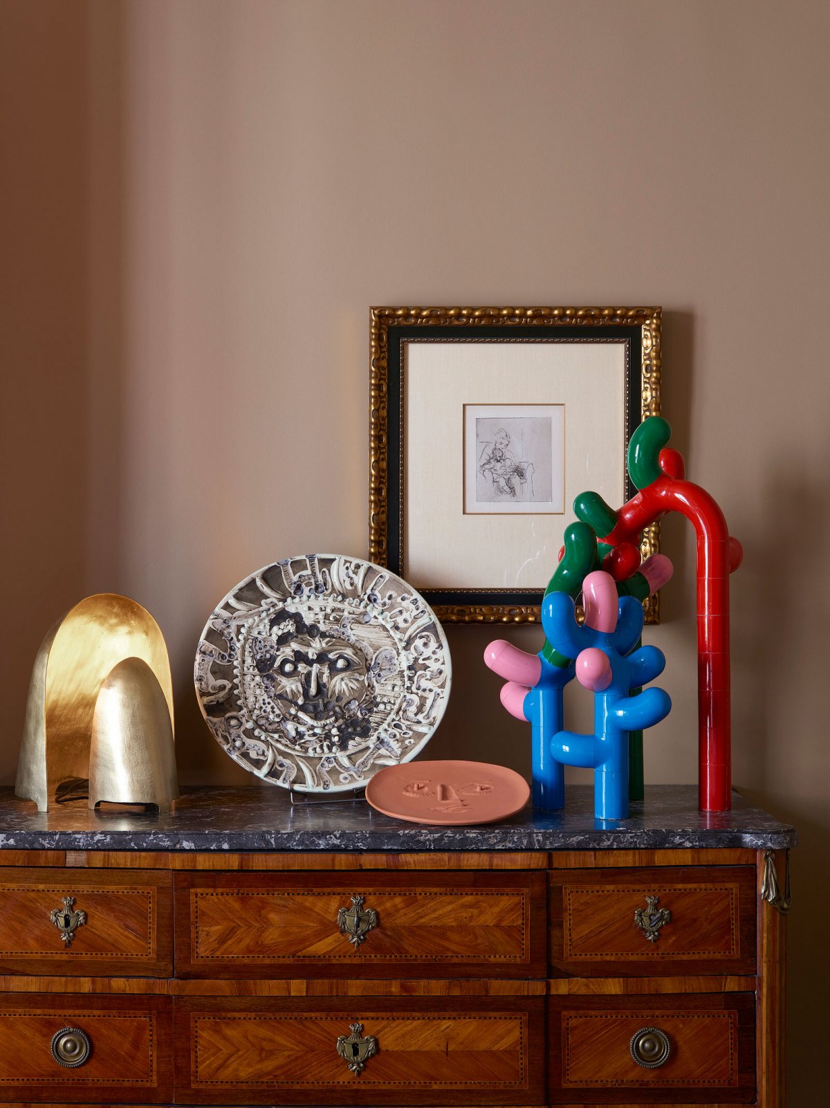 A pair of floating legs (actually a blue jeans body pillow by Pia Camil), for example, dangles over a mantel in the living room. A metallic blue Tube Chair by Joe Colombo sits outside a bedroom, while a Bubble Bench by Léa Mestres unfussily occupies a passage. Some accents, like the bust masks by Pia Camil, riff on otherworldly, thanks to their peculiar composition (these ones are a ceramic design made of synthetic hair and brass).
