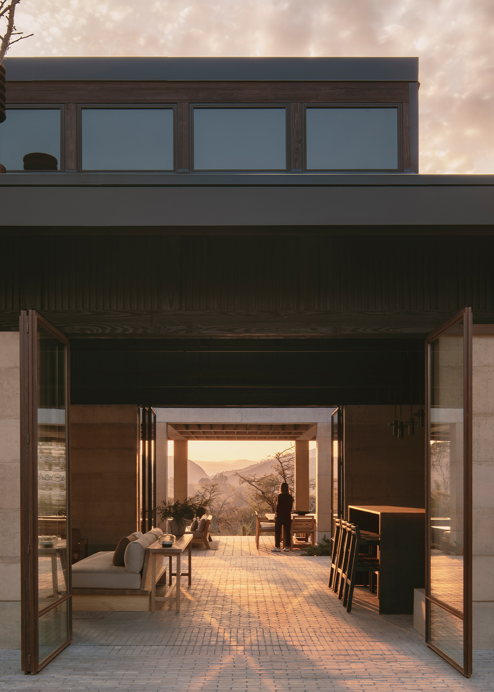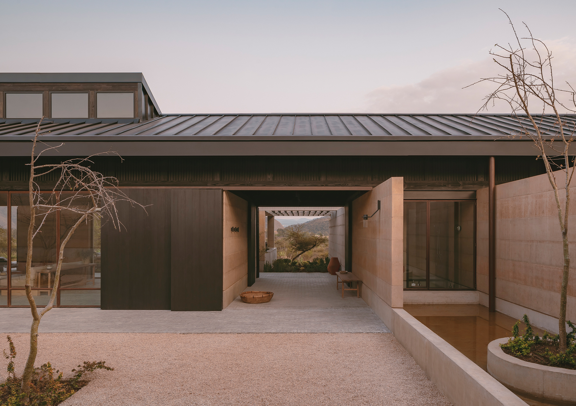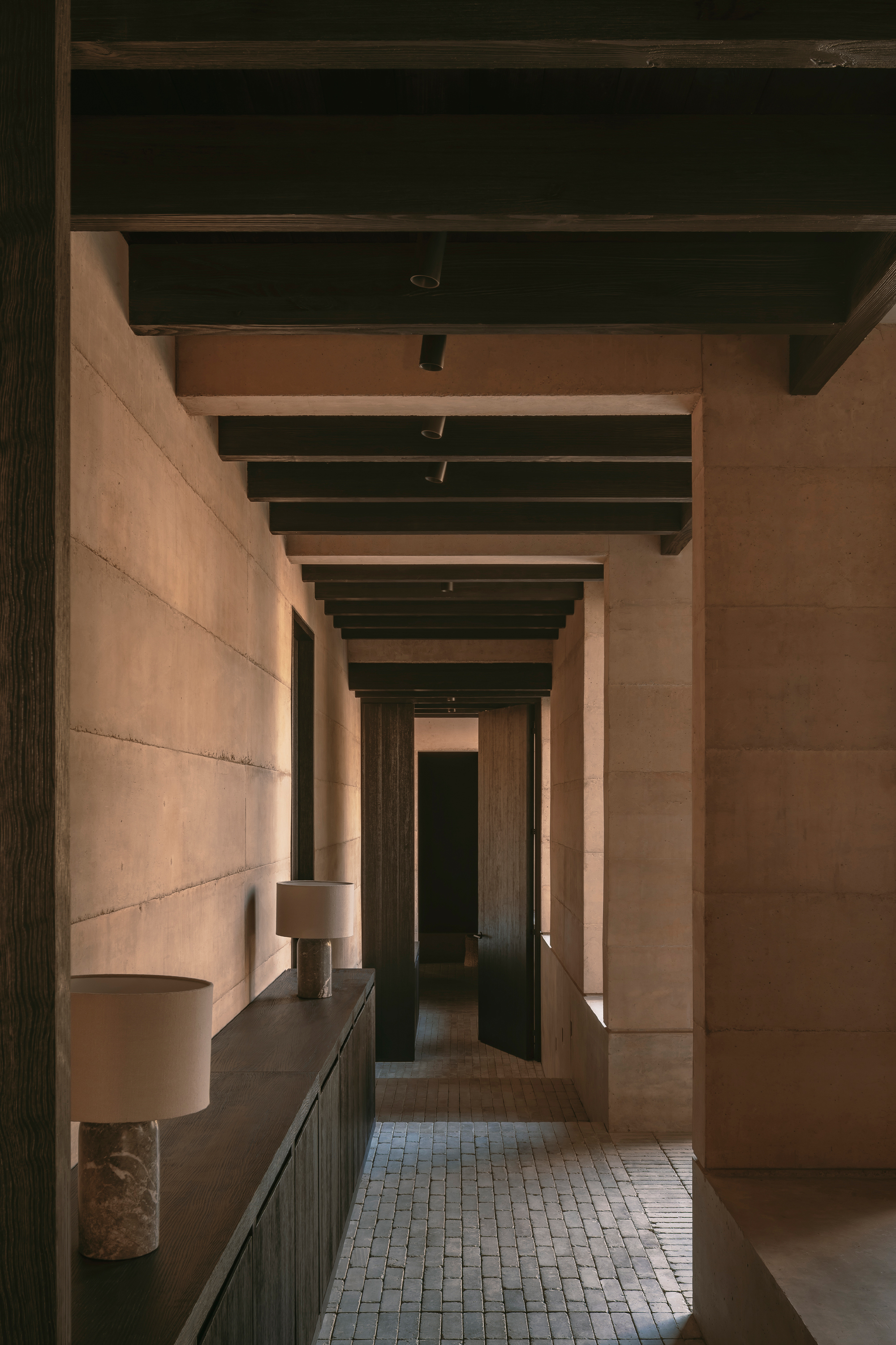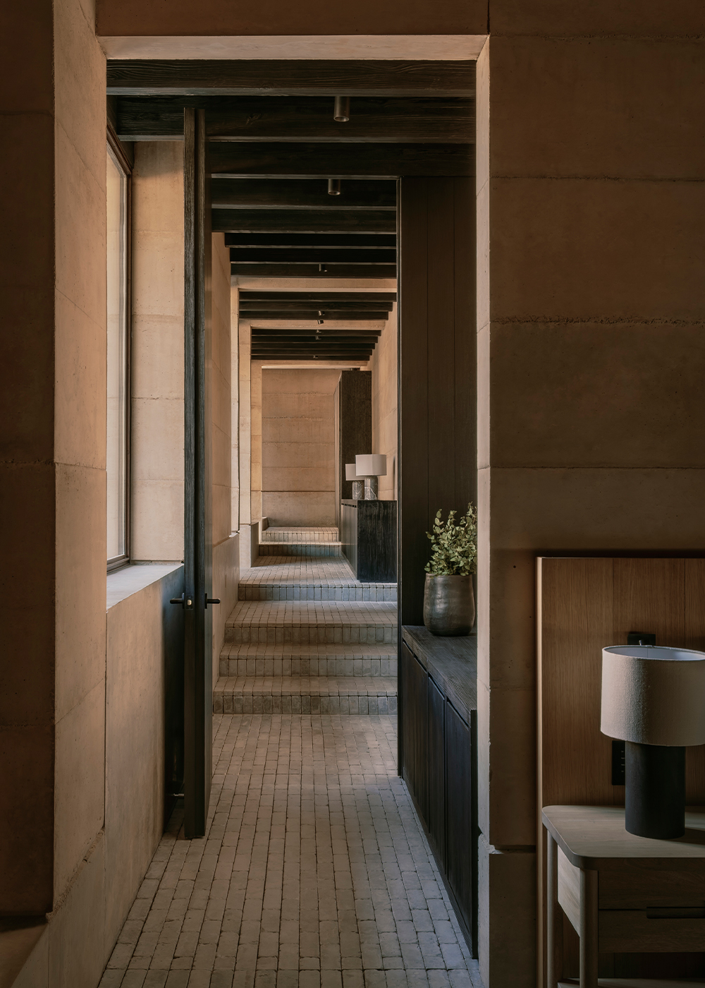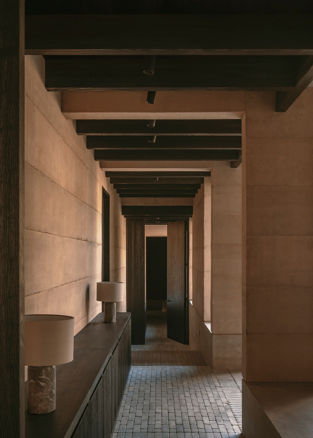 The serene darkness of the interior earth-toned walls, gray stone underfoot, dark woods and oxidized metals—supports an intimate, contained atmosphere. There is no flamboyance, only the restraint of what has been designed to endure. Crossing the threshold to the outdoors, the house transforms. The architecture opens without losing its composure toward the landscape and toward time. Each element finds an echo in the context. Shadow gives way to light, containment to openness.
