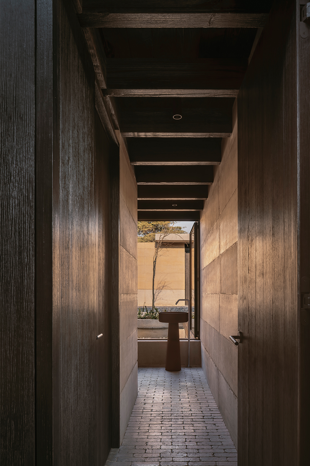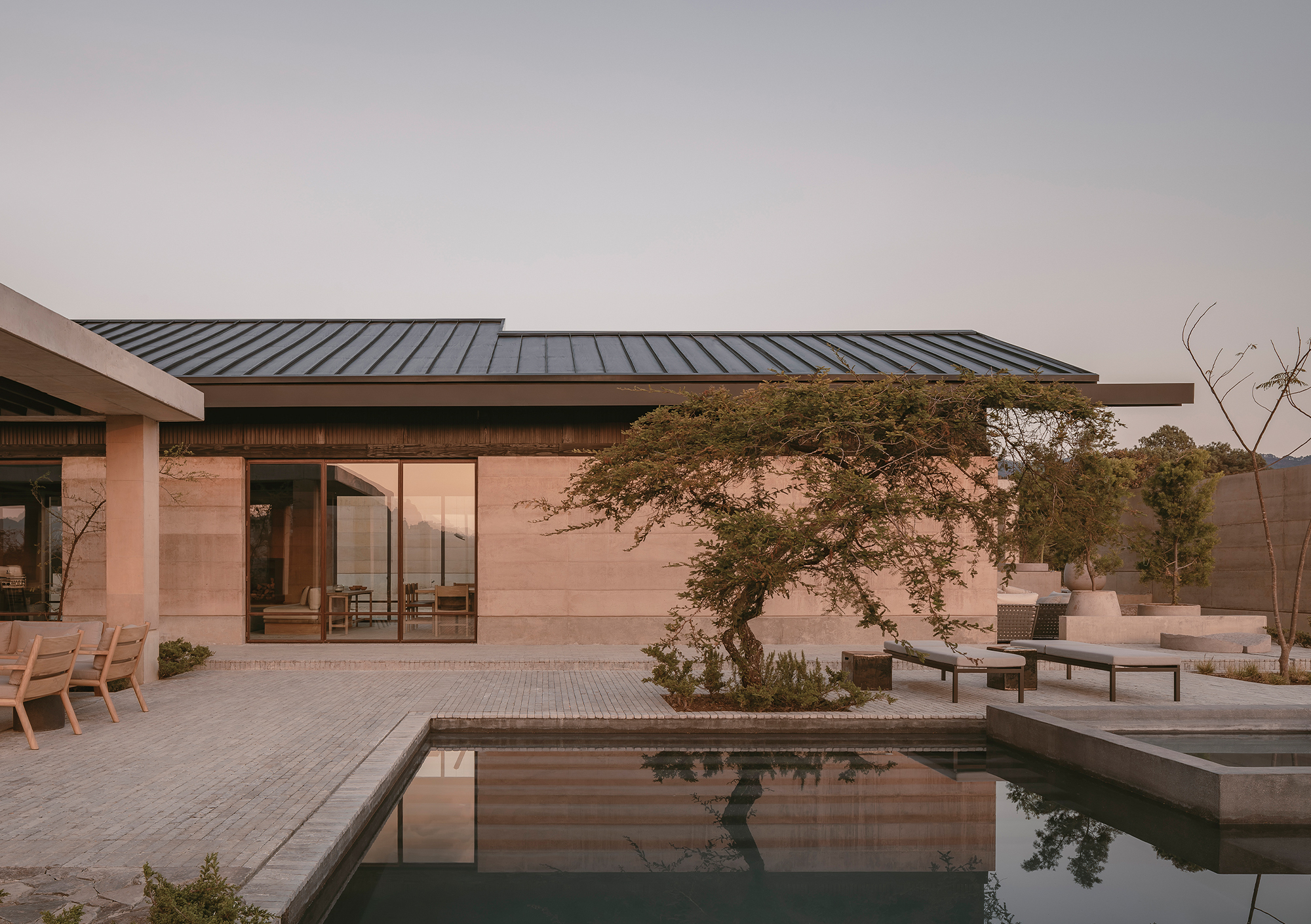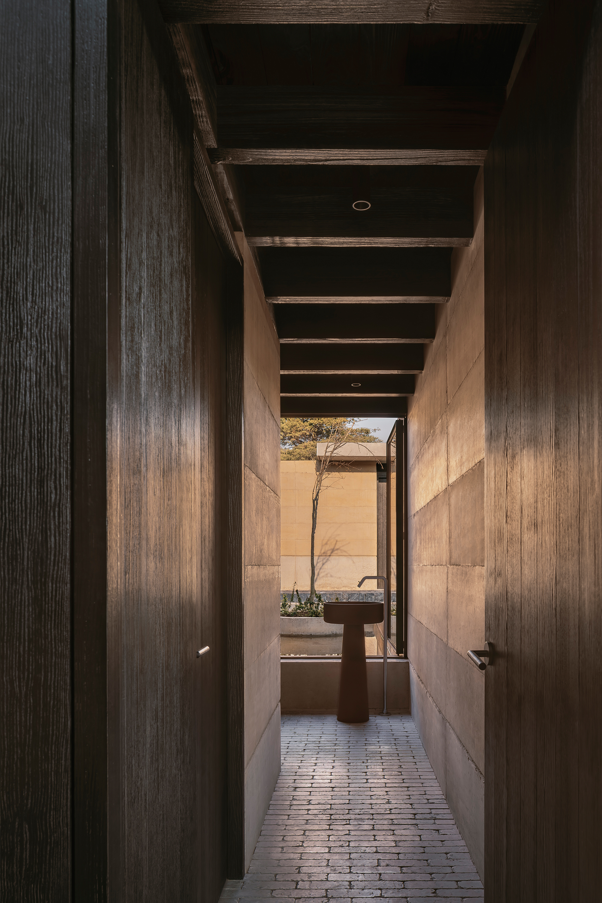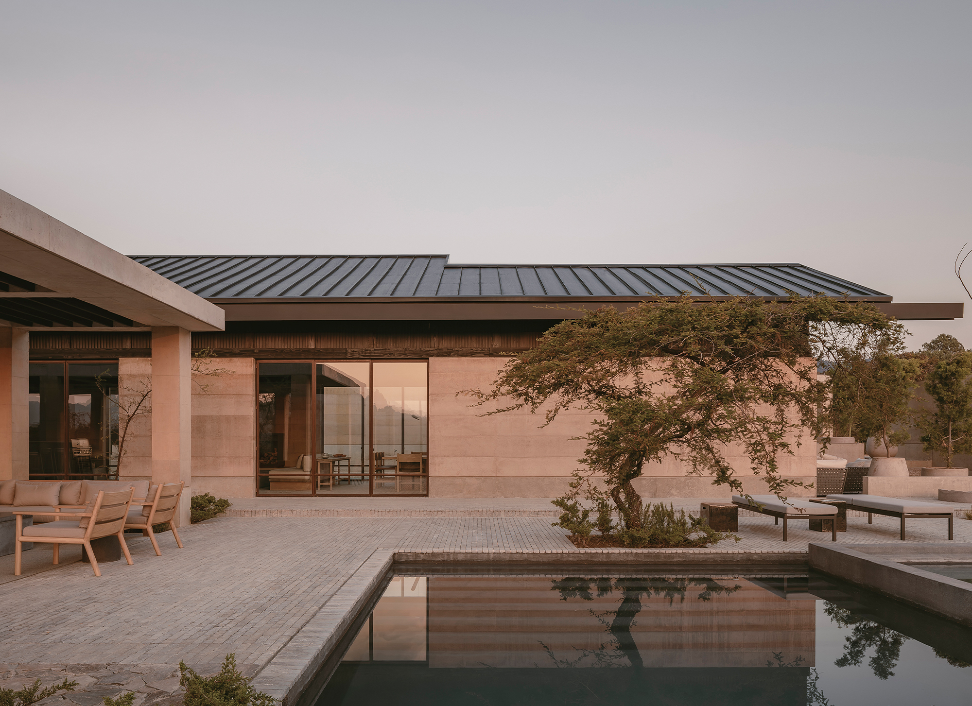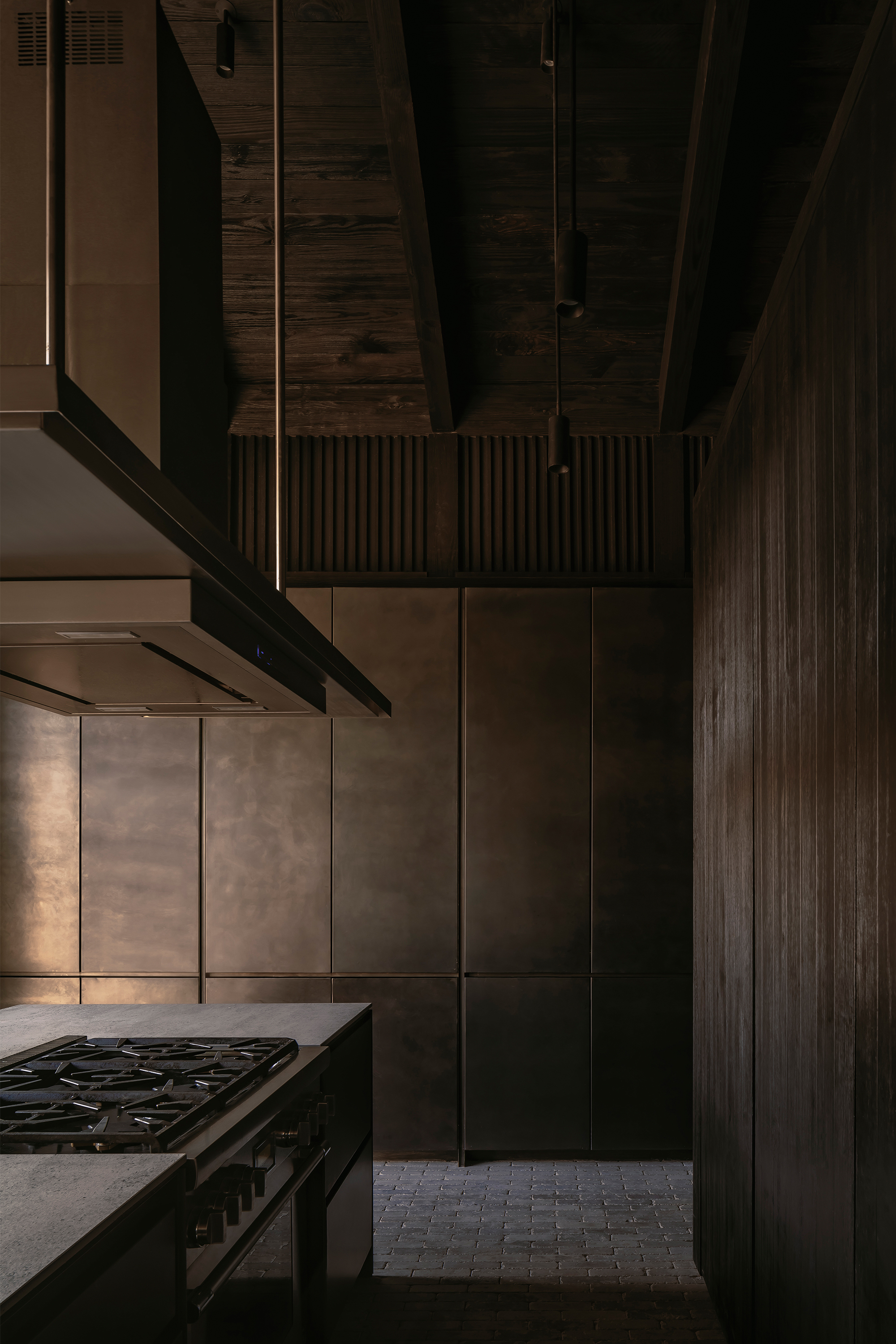 The serene darkness of the interior earth-toned walls, gray stone underfoot, dark woods and oxidized metals—supports an intimate, contained atmosphere. There is no flamboyance, only the restraint of what has been designed to endure. Crossing the threshold to the outdoors, the house transforms. The architecture opens without losing its composure toward the landscape and toward time. Each element finds an echo in the context. Shadow gives way to light, containment to openness.