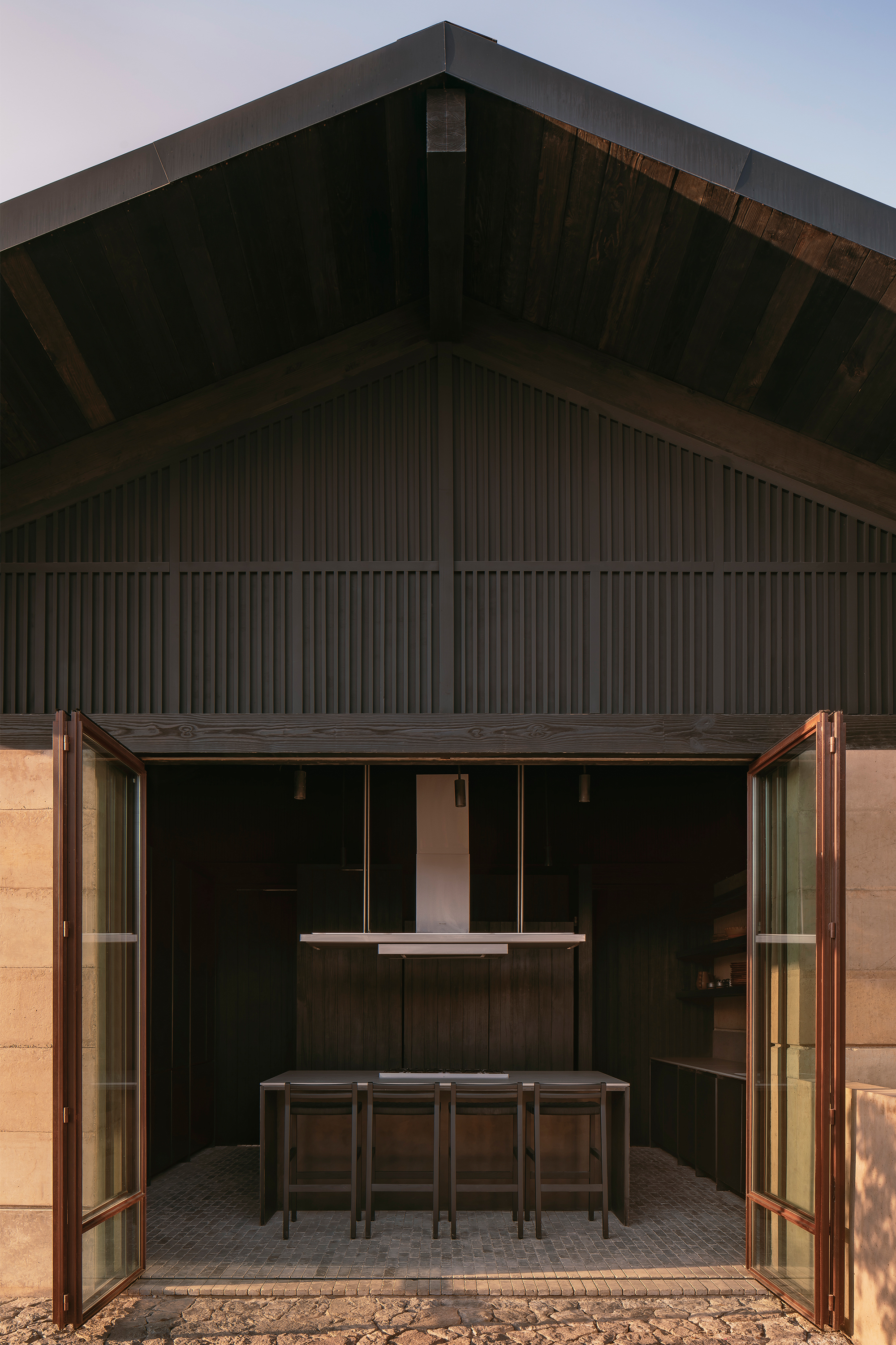 The architecture unfolds around a central gravel courtyard that greets the visitor, framed by the main house and the guest annex. This first gesturewelcomes without ostentation. From there, a covered passage opens into a gabled nave built with black-stained wood structure. It is the social heart of the house: kitchen, dining, living, and bar merge into a fluid space, open to the landscape.