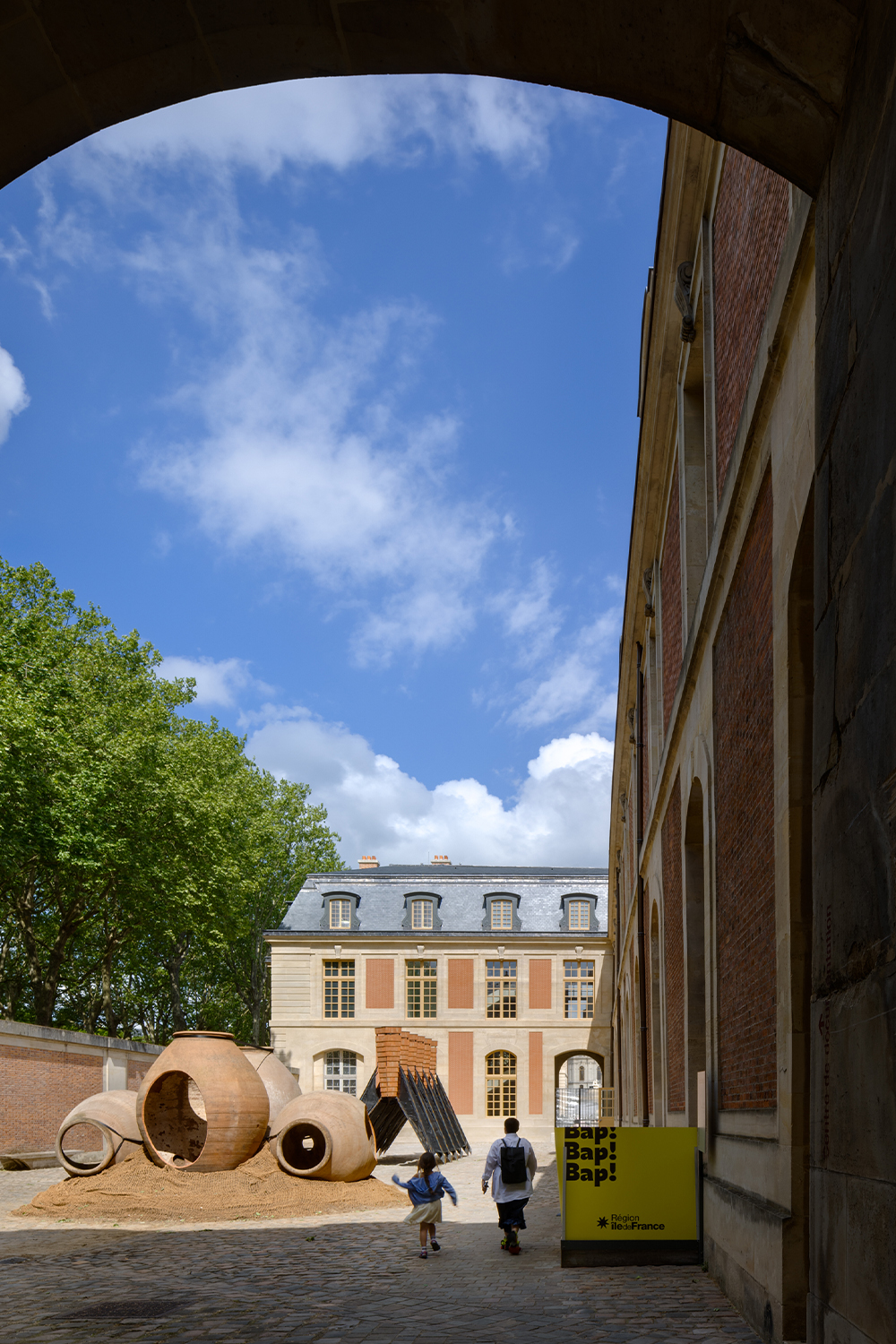 Two experimental pavilions are installed in the Cour de la Maréchalerie, serving as a visual and experiential introduction to the Biennial.