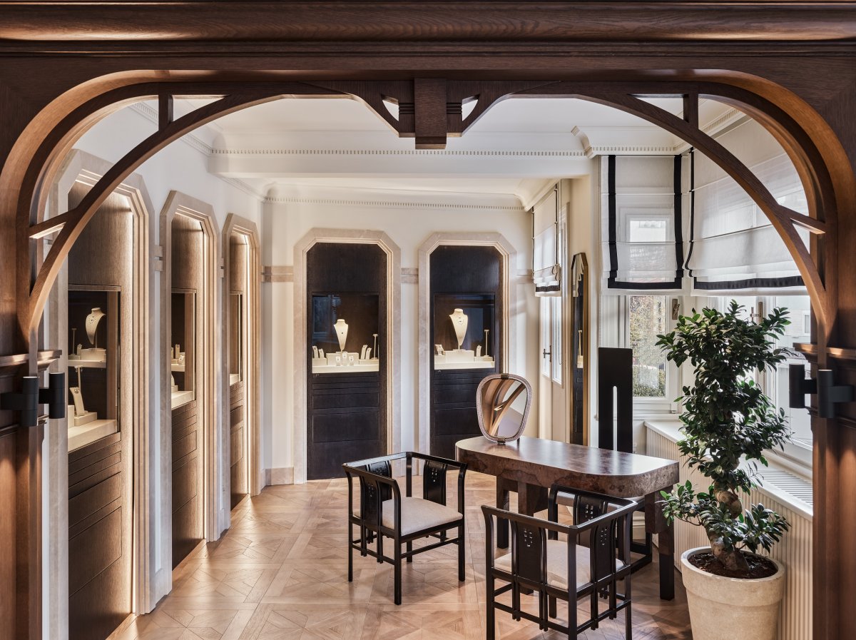 Karavil custom designed an octagonal glass display unit with a bronze metal frame to house jewellery and pay homage to art Deco design. Sitting in the right-hand corner, accessed through floor-to-ceiling glass doors, is a private room where the brand keeps its diamond collection. SANAYI313 covers the entire ceiling with mirrors to create a visual illusion that makes the room's interior and collection look bigger. In the lounge area, SANAYI313's side tables help create a comfortable atmosphere, and each glass display stand is anchored by a wooden base to hide additional storage space.